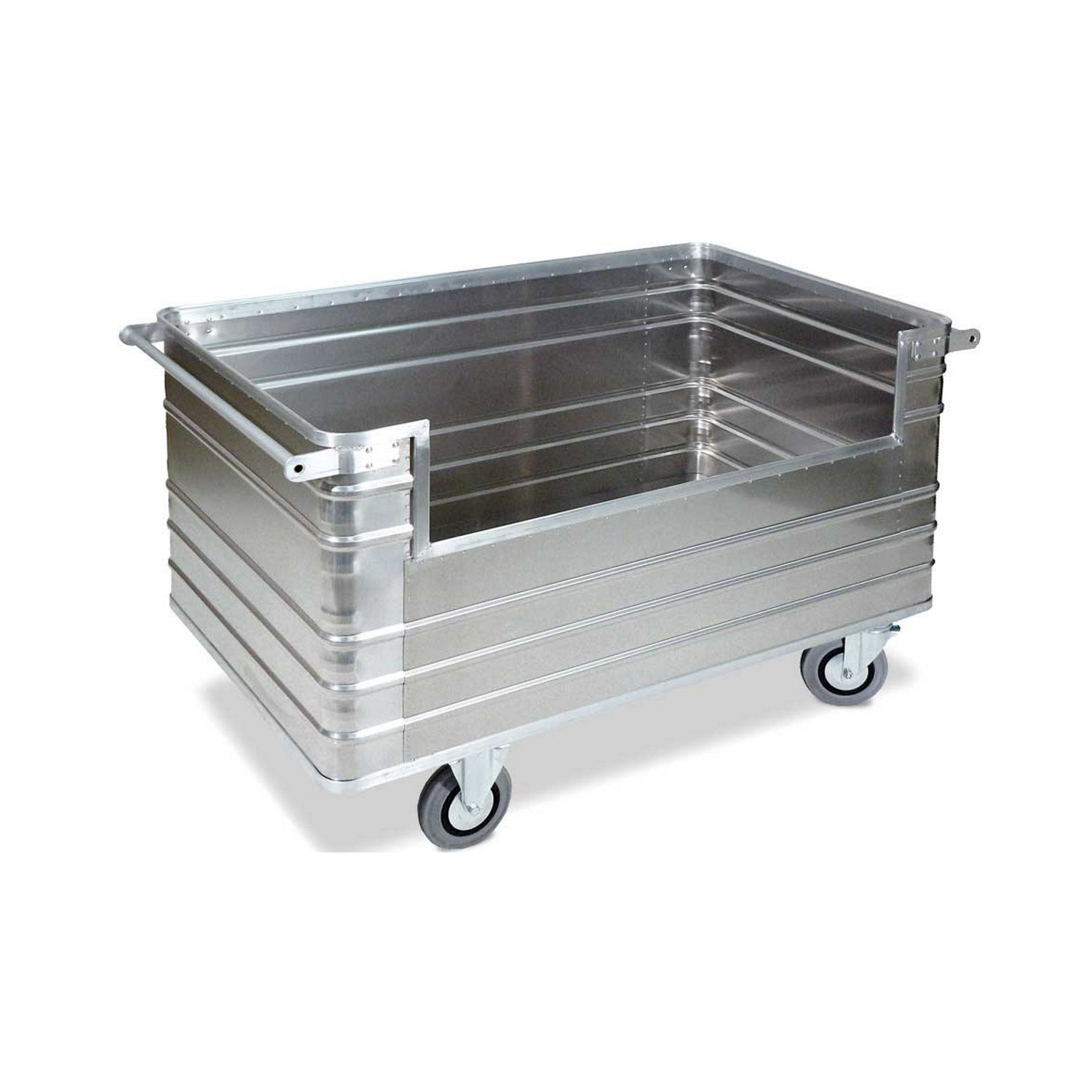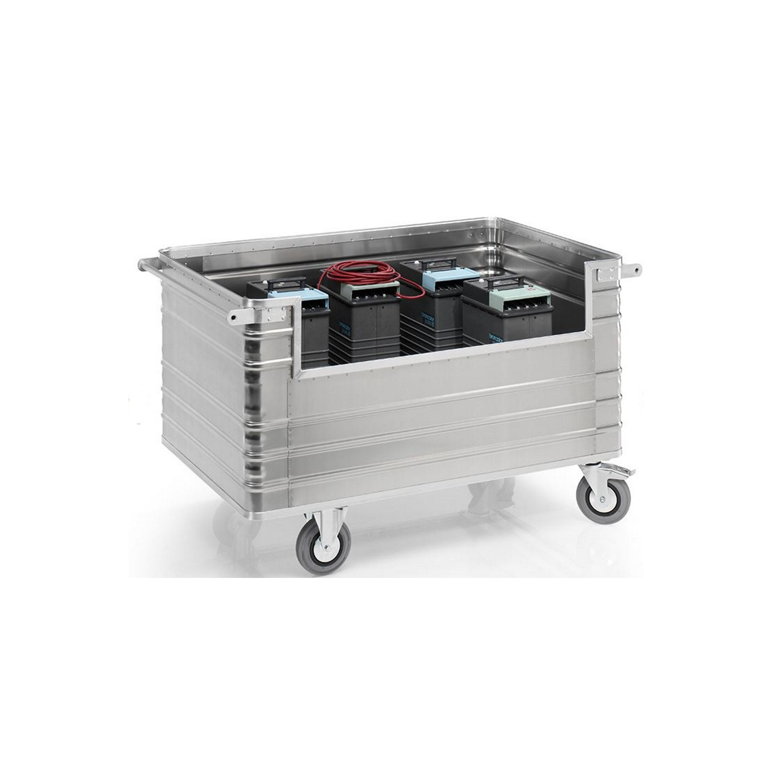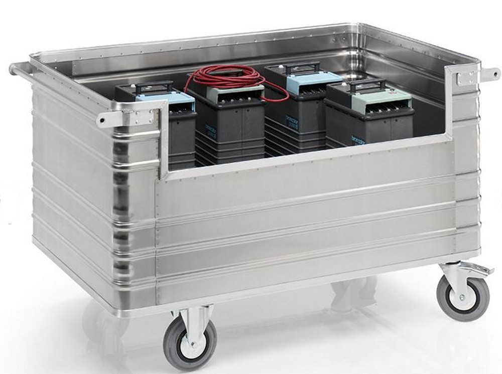 Der Seitenwandausschnitt des Alu-Transportwagens ermöglicht leichtes Be- und Entladen. Aufgrund des geringen Eigengewichts lassen sich Waren einfach transportieren.
