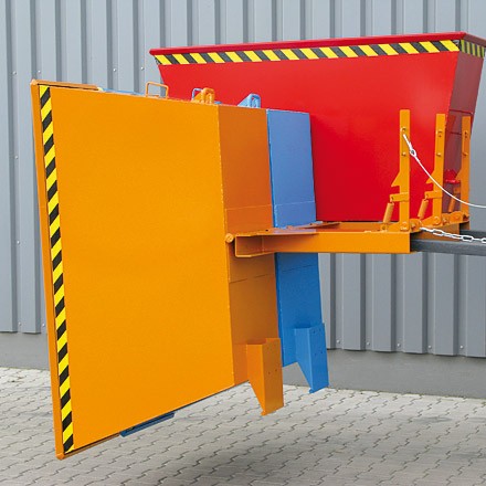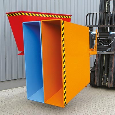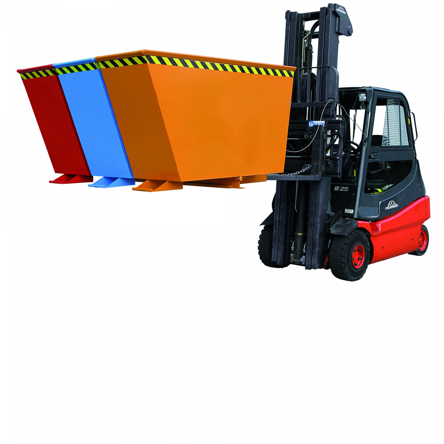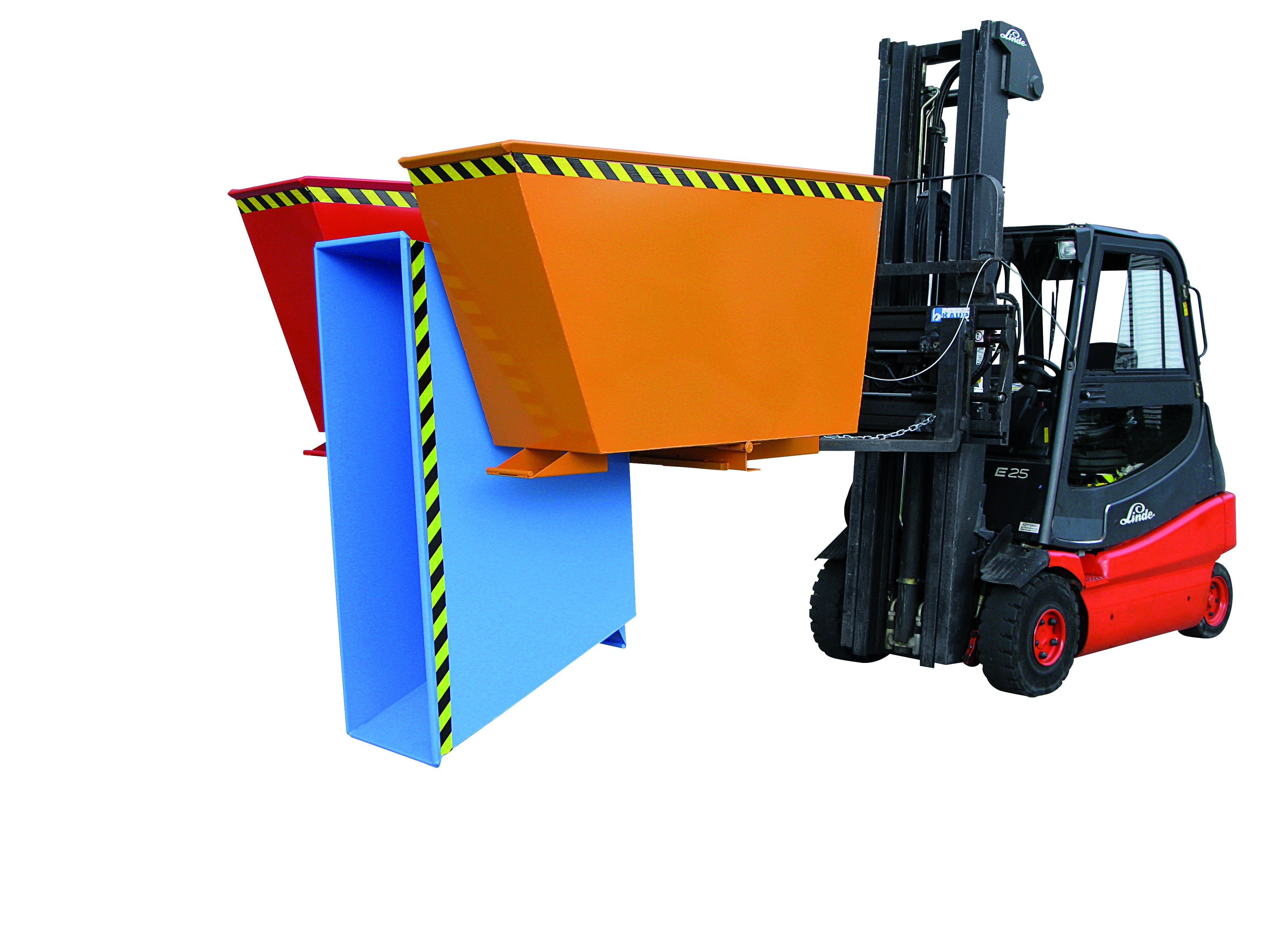 Die ideale Sammelstation für Arbeitserleichterung und Sauberkeit in kleineren Produktionsbereichen. Nachdem Sie in die Einfahrtaschen eingefahren sind, sichern Sie den Kippbehälter mit der Sicherungskette am Tragbaum des Staplers, um ein versehentliches Abrutschen von den Zinken zu vermeiden. Am Bestimmungsort wird jeder Behälter separat über ein Seilzug entriegelt und kippt selbstständig ab. Die hängenden Behälter können am Muldenrand oder ebenerdig auf dem Boden wieder aufgerichtet werden.
