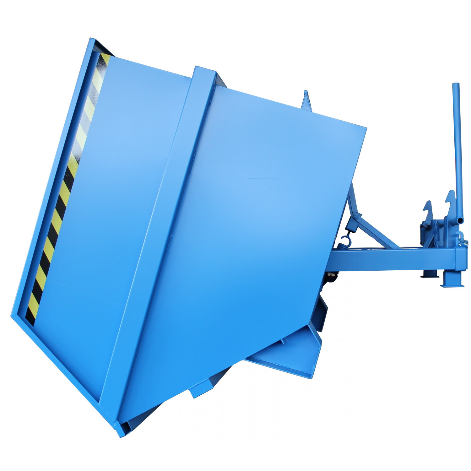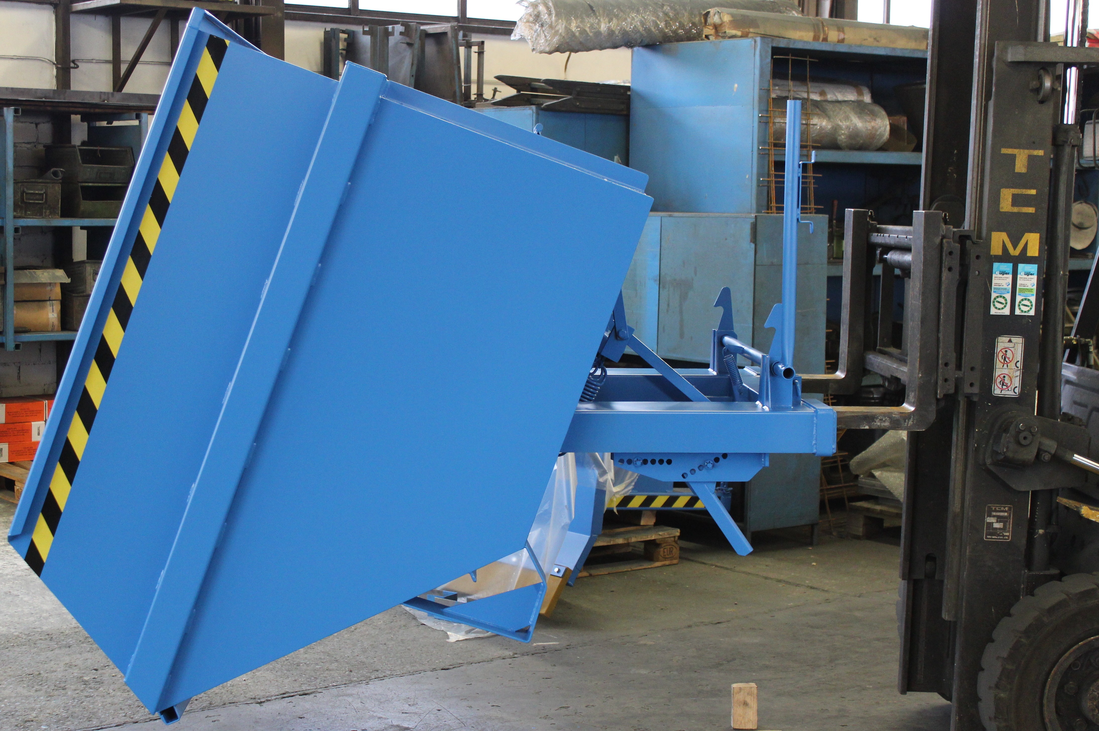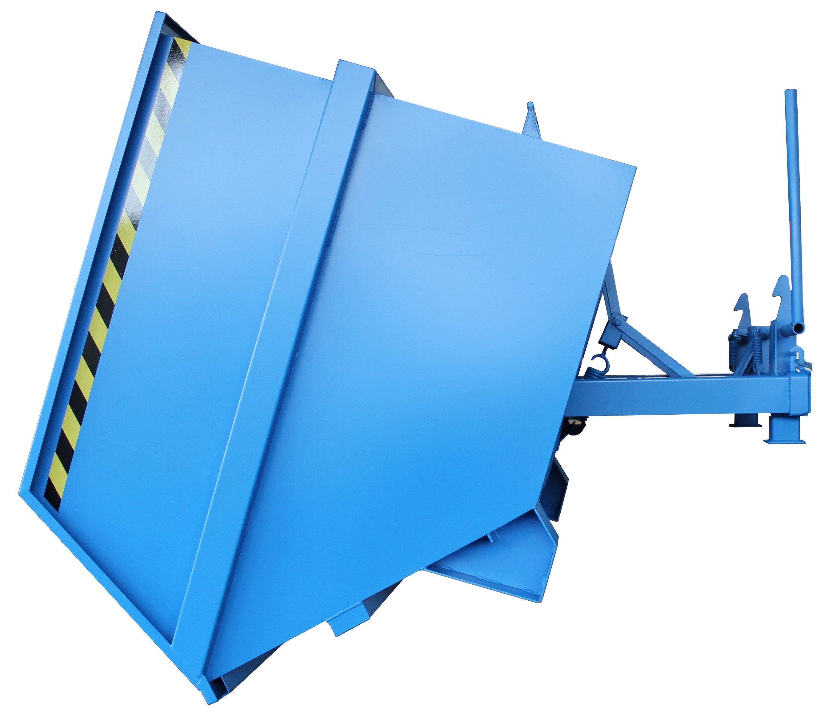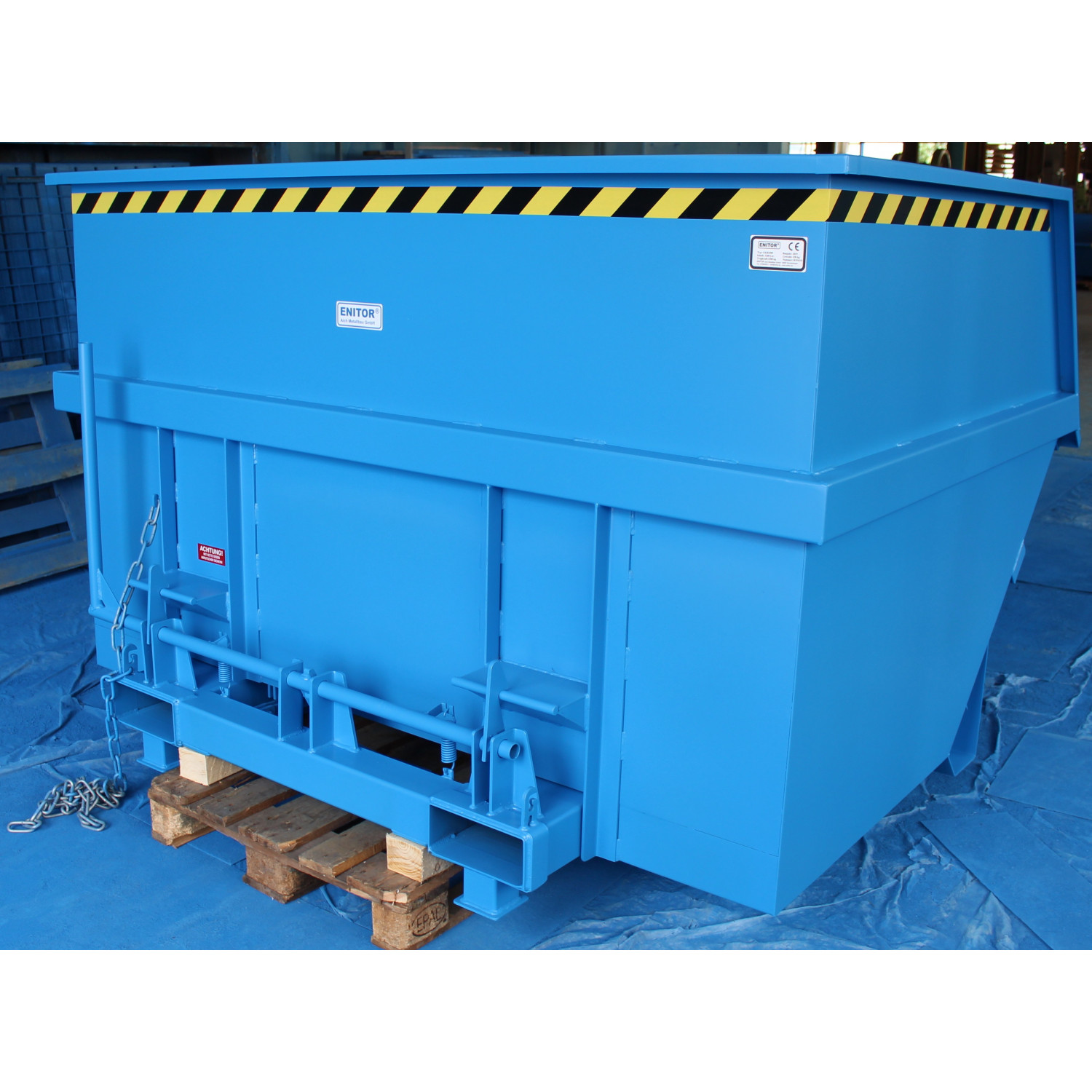 Groß-Kippbehälter von Enitor für Gabelstapler mit günstiger Raumausnutzung auf einem Untergestell mit Einfahrtaschen. Das Federscherensystem dämpft den Kippschlag und schont gleichzeitig das Staplerhubgerüst. Der Kippbehälter hat eine abdämpfende Kippbegrenzung. Der Schwerpunkt des Kippbehälters liegt vor den Gabelzinkenspitzen. Der selbständig ablaufende Kippvorgang wird durch Lösen einer Arretierung eingeleitet, per Seilzug vom Fahrersitz aus.