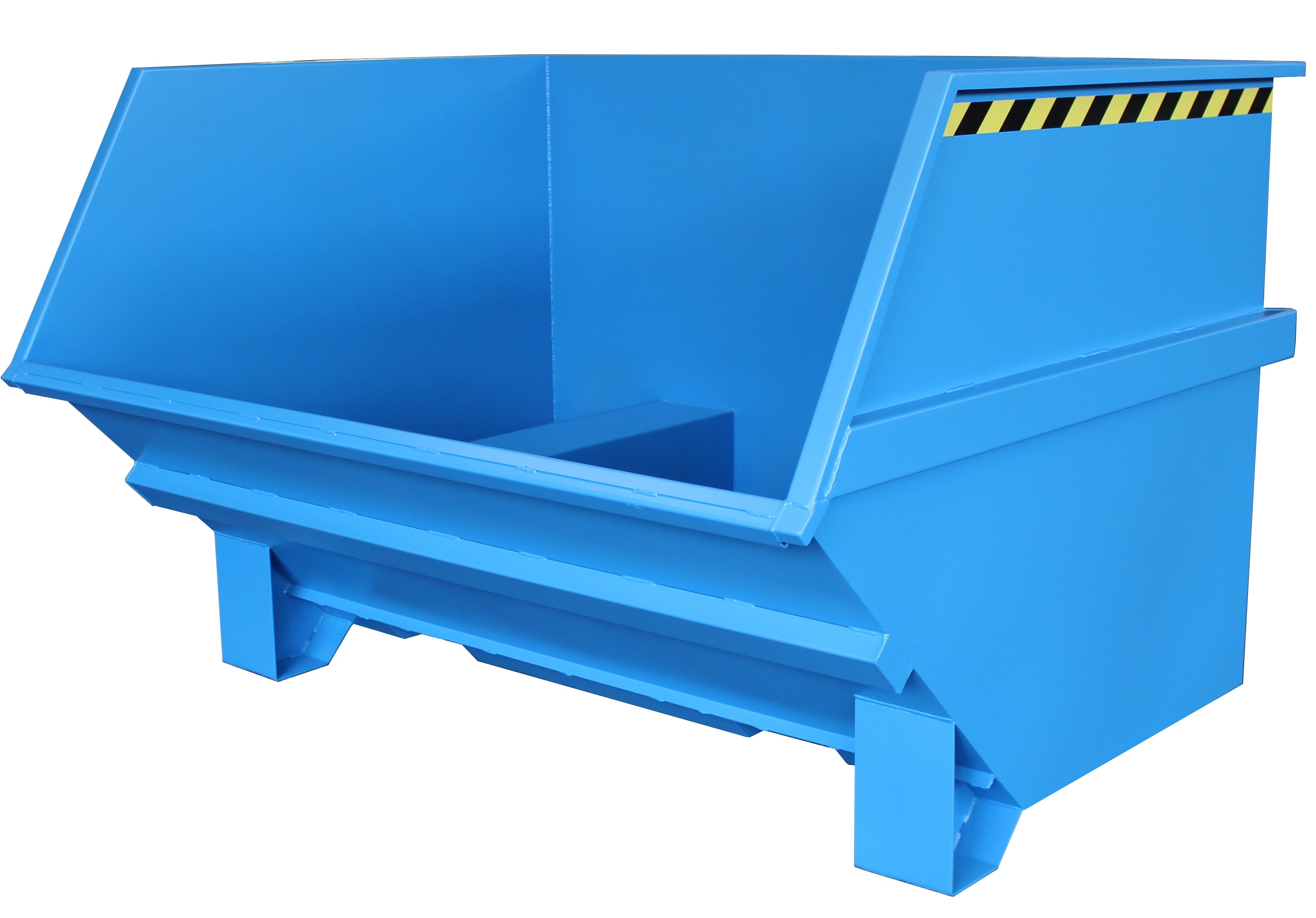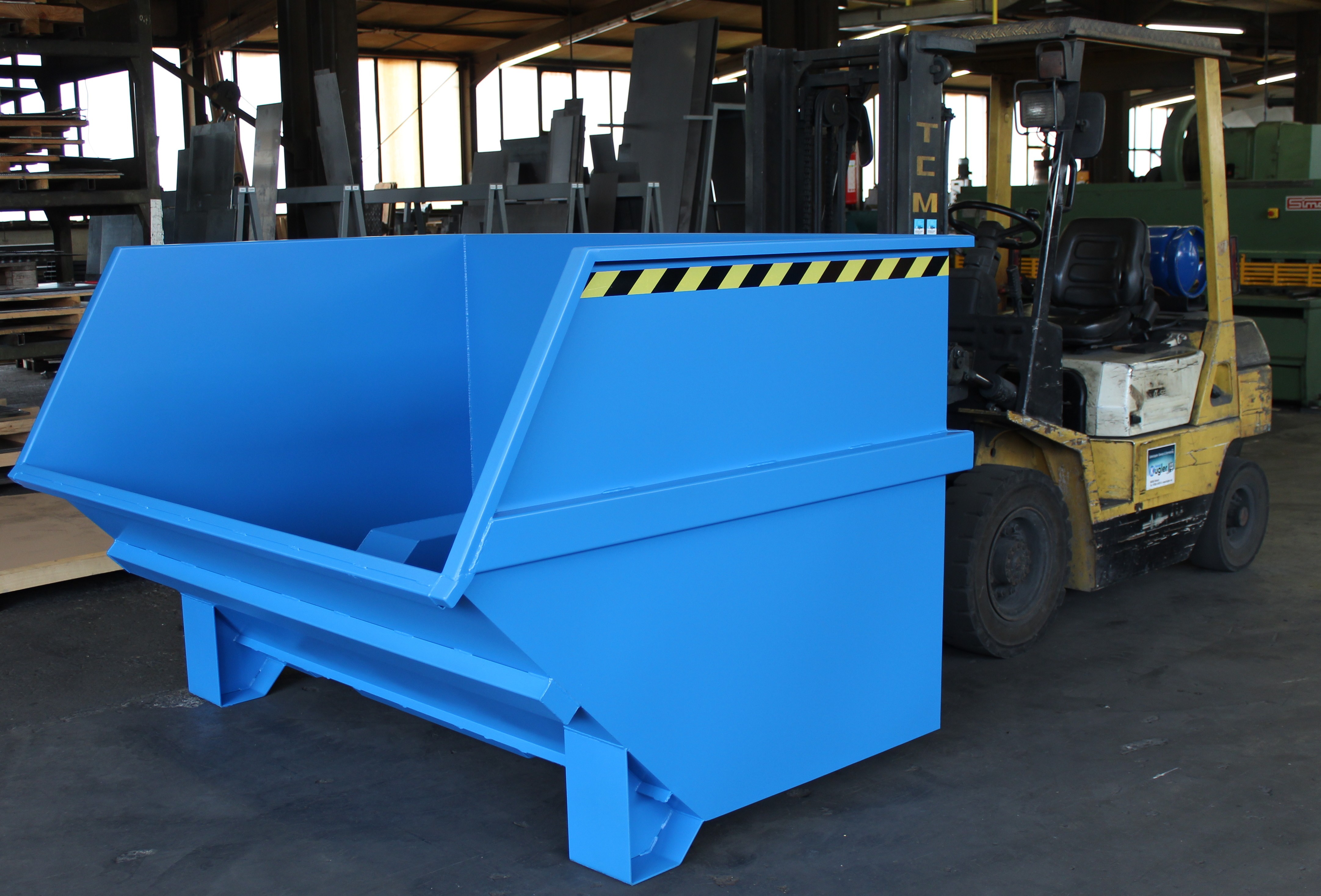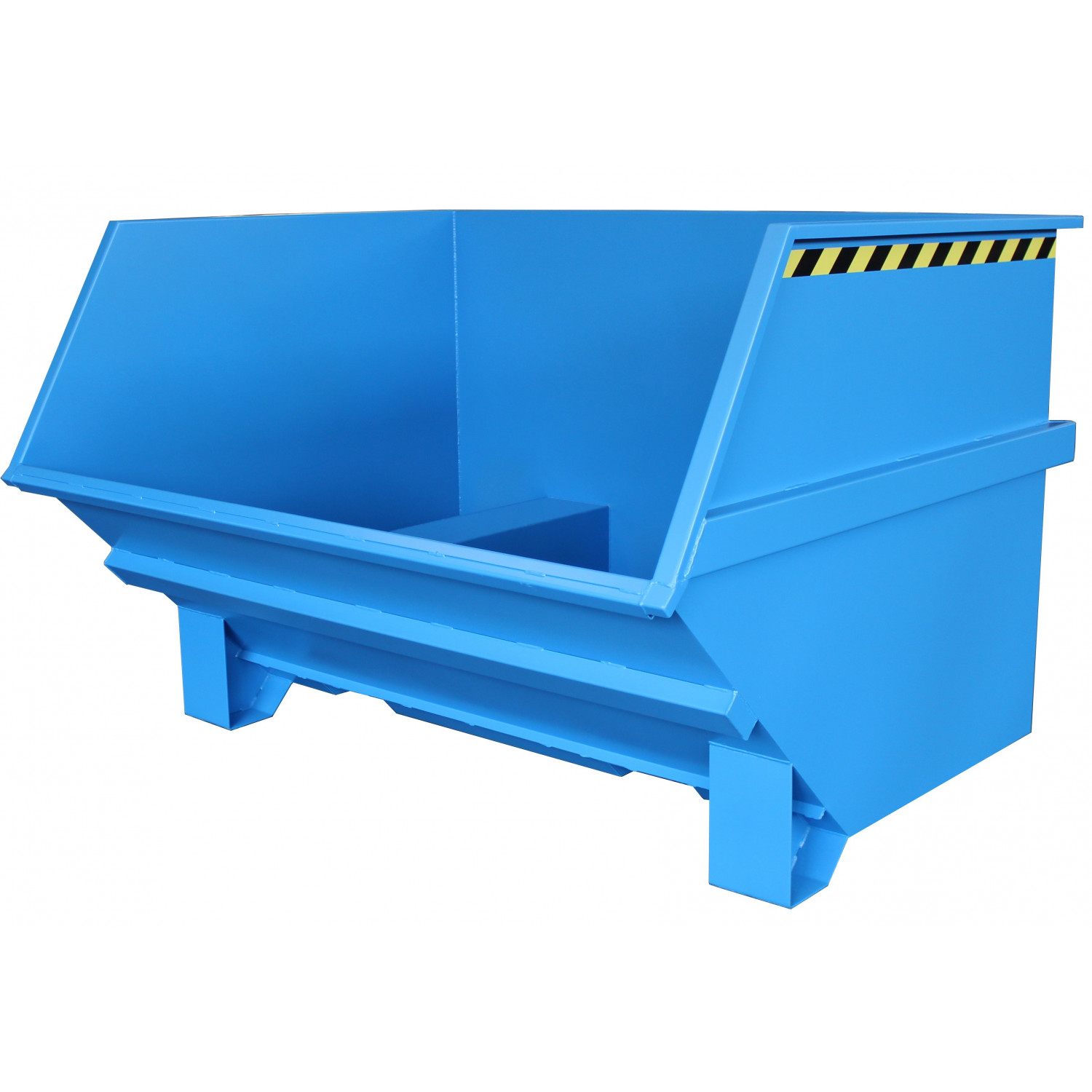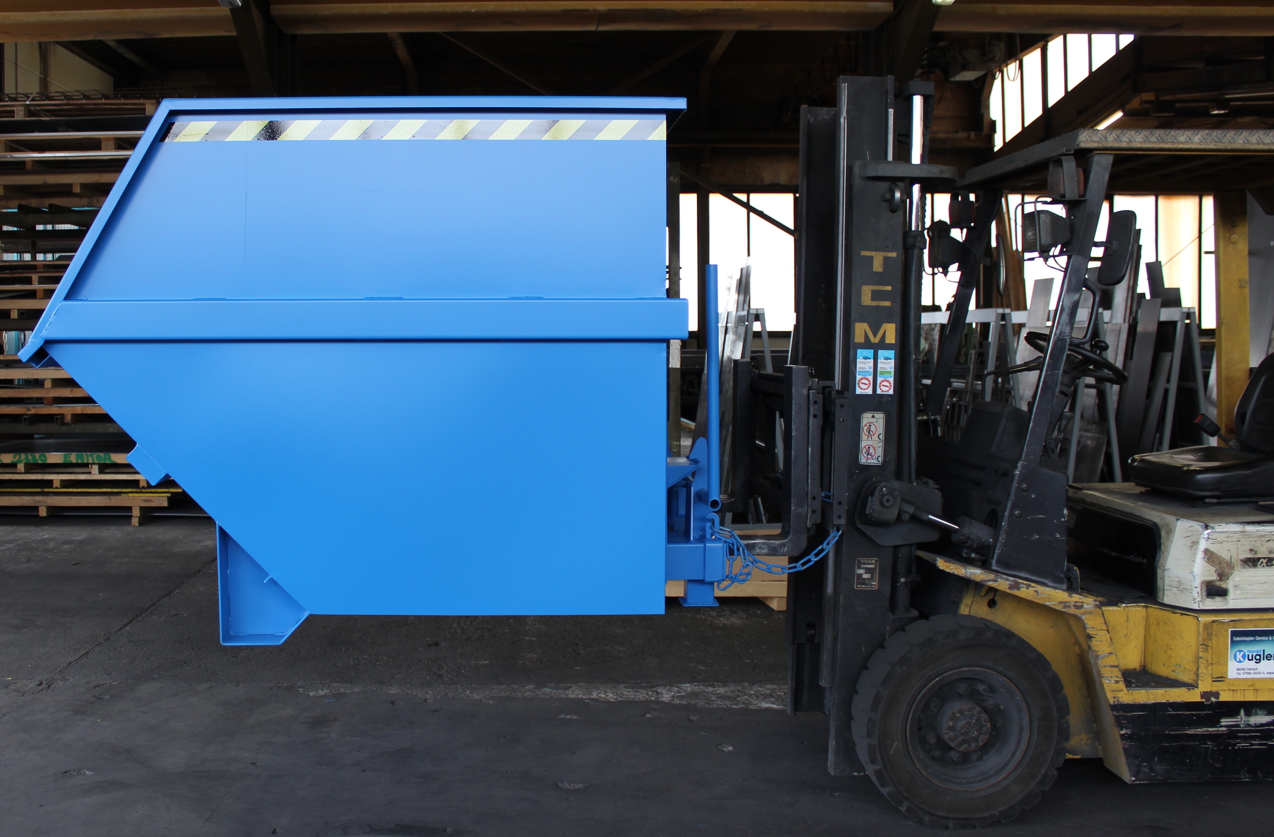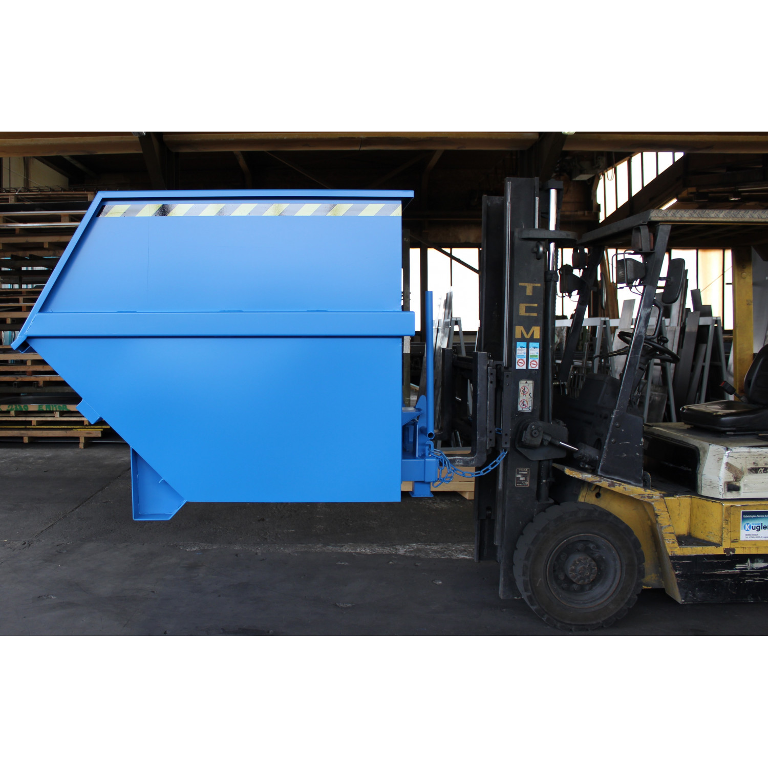 Groß-Kippbehälter von Enitor für Gabelstapler mit günstiger Raumausnutzung auf einem Untergestell mit Einfahrtaschen. Das Federscherensystem dämpft den Kippschlag und schont gleichzeitig das Staplerhubgerüst. Der Kippbehälter hat eine abdämpfende Kippbegrenzung. Der Schwerpunkt des Kippbehälters liegt vor den Gabelzinkenspitzen. Der selbständig ablaufende Kippvorgang wird durch Lösen einer Arretierung eingeleitet, per Seilzug vom Fahrersitz aus.