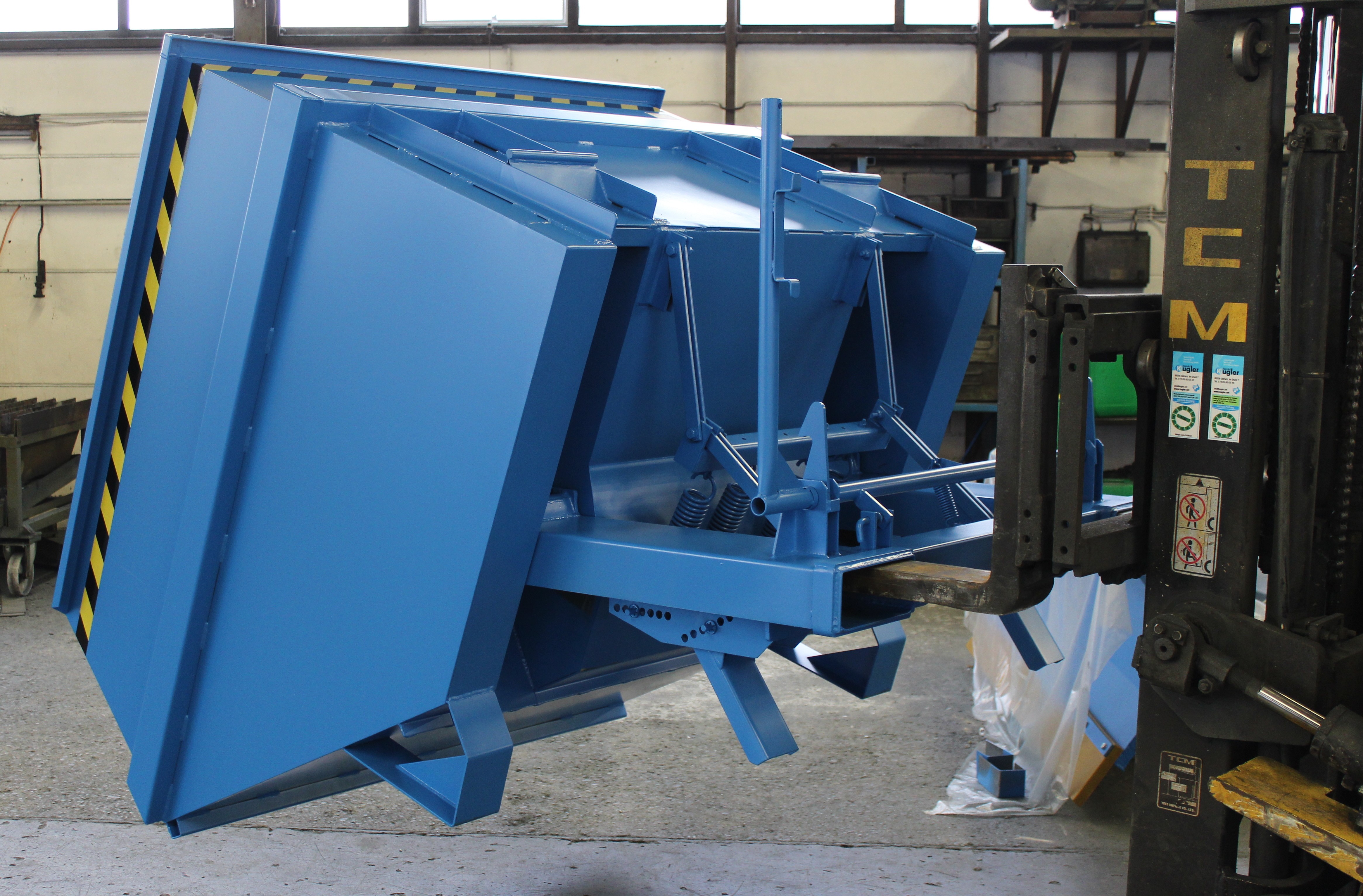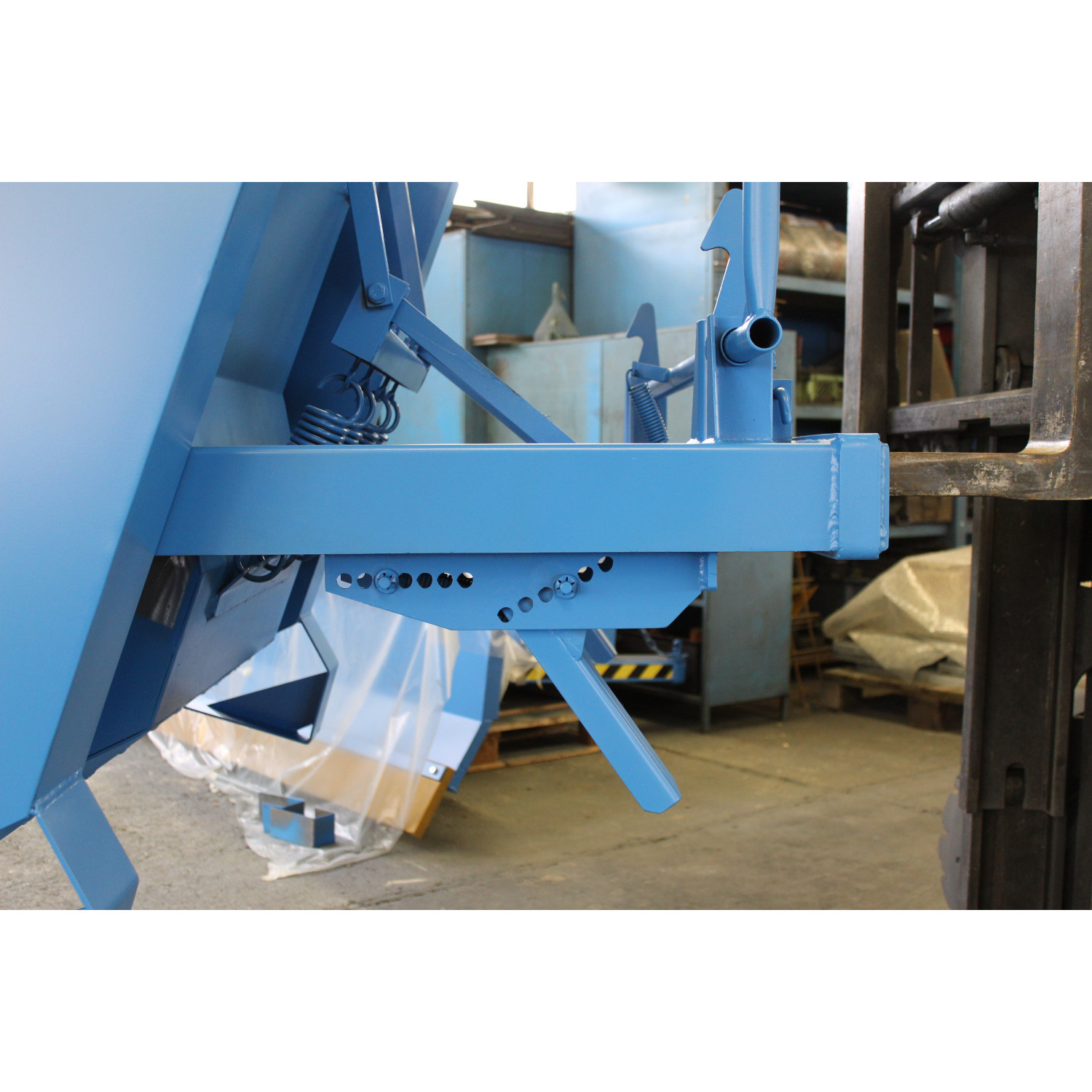 - Durch eine zuggefederte Abfangvorrichtung werden der Stapler und der Kippbehälter beim Kippen geschont