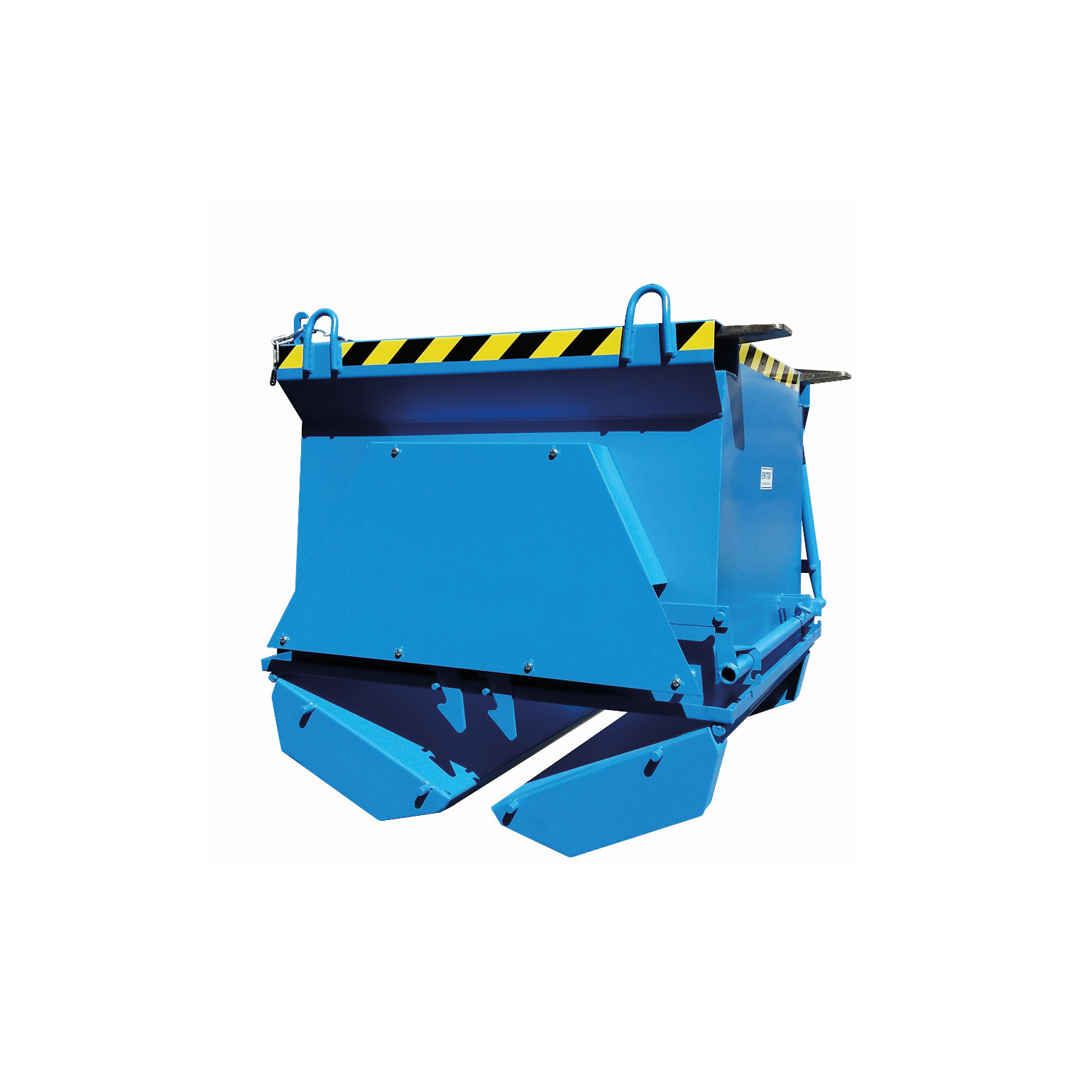 Der Bodenklappbehälter schließt automatisch beim Aufsetzen. Bodenklappenbehälter mit optimaler Raumausnutzung. Die Bodenklappen liegen quer zur Fahrtrichtung. Die Einfahrtaschen sind als tragendes Teil in den Behälter integriert und machen den Behälter sehr verwindungssteif. Das Öffnen der Klappen wird durch den Seilzug ausgelöst. Durch Absetzen auf den Boden werden die Klappen wieder verriegelt. Gegen Abrutschen von den Gabelzinken dient eine mit dem Untergestell fest verbundene Kette. Für nahezu alle Schüttgüter von Holzspänen bis zu Erzen. Mit Kranösen und 4-Strang-Kettengehänge ideal für den Kranbetrieb. Wegen der zentrierten Entleerung ergibt sich kein Moment, der beim Entleeren zum Wegpendeln führt, wie dies bei einklappigen Behältern auftritt.