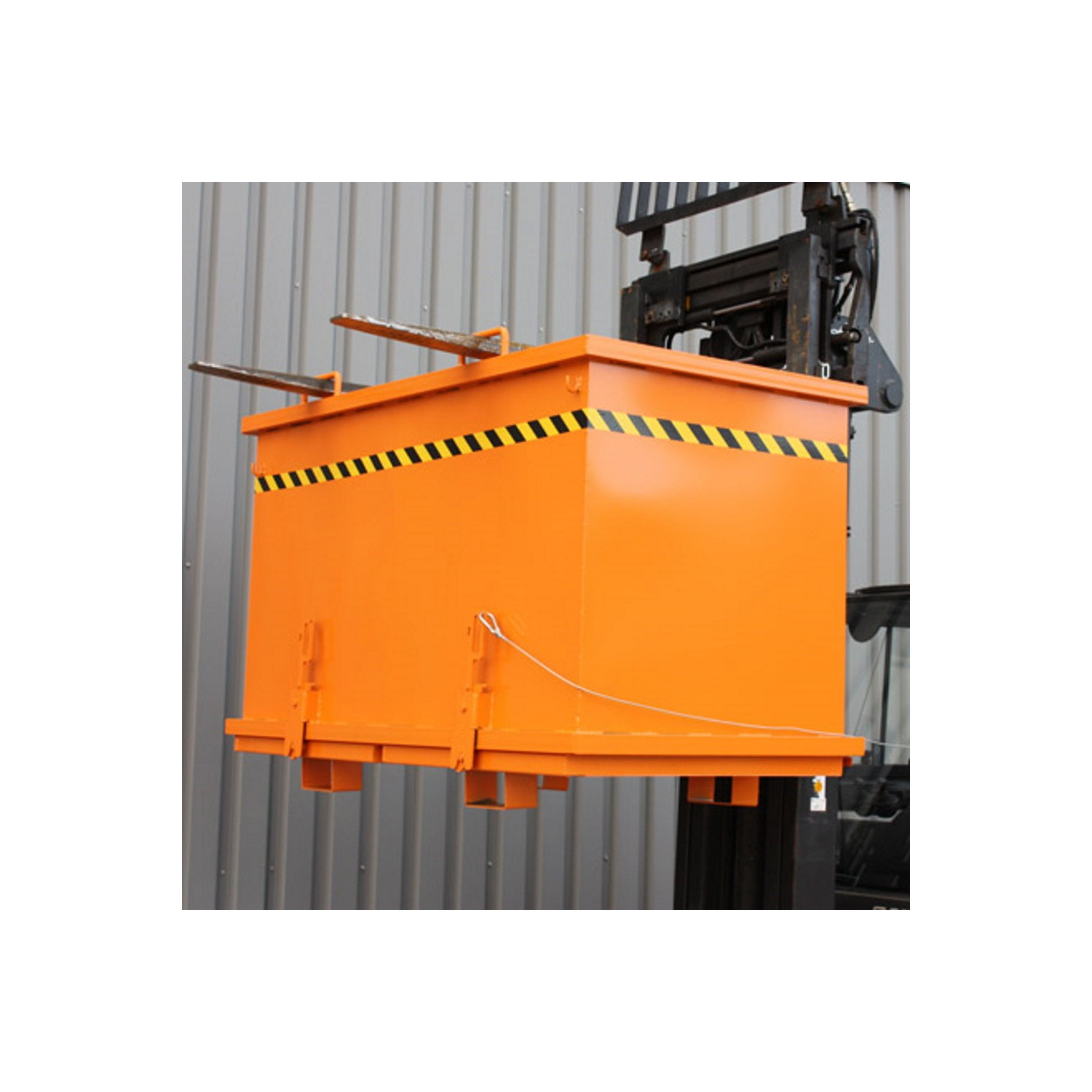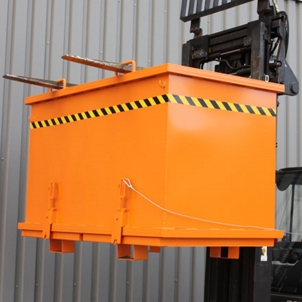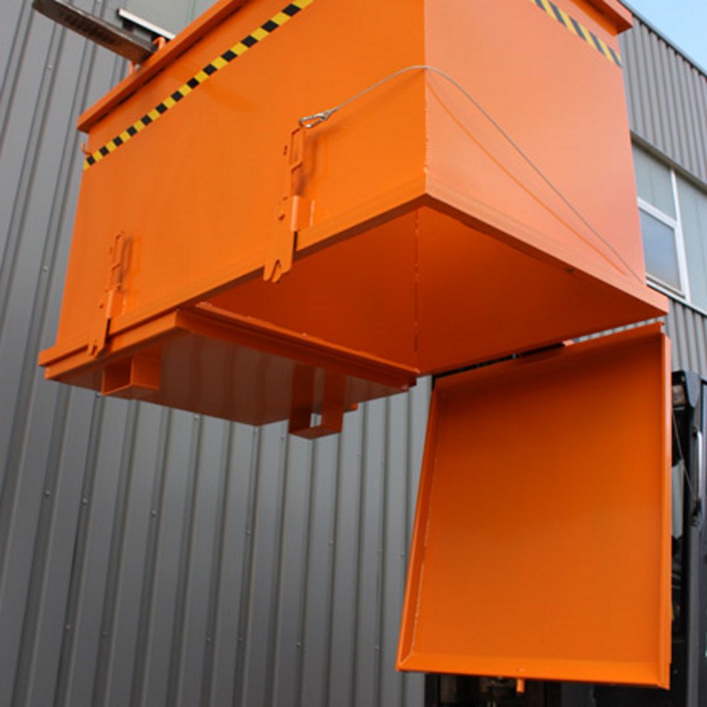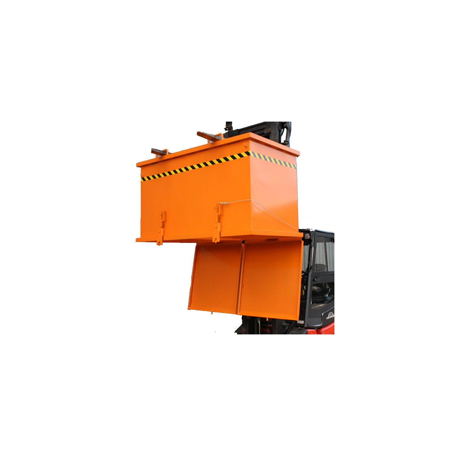 Der mehrteilige Behälter von Eichinger verfügt wahlweise über 2 oder 3 getrennte Fraktionen, die über eine separat bedienbare Bodenklappe geöffnet werden können. Mit massiven, verstärkten Bodenklappen mit Standfüßen die eine unterfahrbare Höhe von 100 mm gewährleisten. Mit umlaufender Kantenverstärkung und Abrutschsicherung. Für Kran- und Stapler-Einsatz geeignet.