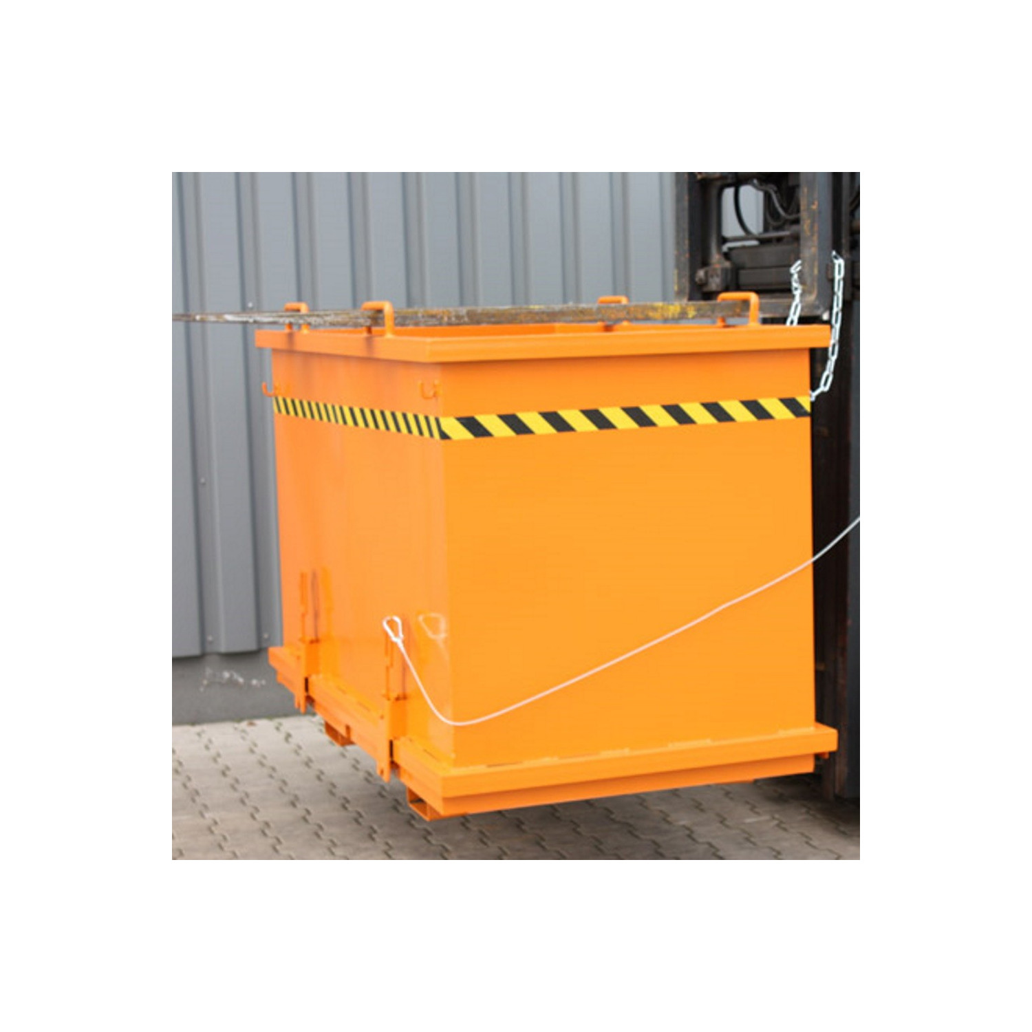 Durch die Zwischenwand und den getrennt zu öffnenden Klappen ideal zur Mülltrennung geeignet. Der Behälter ist äußerst hilfreich, wenn Sie Müll trennen oder wenn sie unterschiedliche schüttbare Kleinteile sammeln und transportieren möchten. Der Abfall-Klappbodenbehälter kann flexibel mit Stapler und Kran angefahren werden. Auch der Transport mit einem Hubwagen ist, Dank der 100 mm Unterfahrhöhe, möglich. Für den Transport mit dem Stapler liefern wir eine Kette zur Sicherung gegen versehentliches Abrutschen mit. Bitte beachten Sie, dass Ihr Lastbaum vom Stapler eine höhere Hubhöhe als bei einem Kippbehälter haben muss. Die Klappbodenbehälter werden über die Einfahrbügel aufgenommen, die oberhalb der Mulde angeschweißt werden.