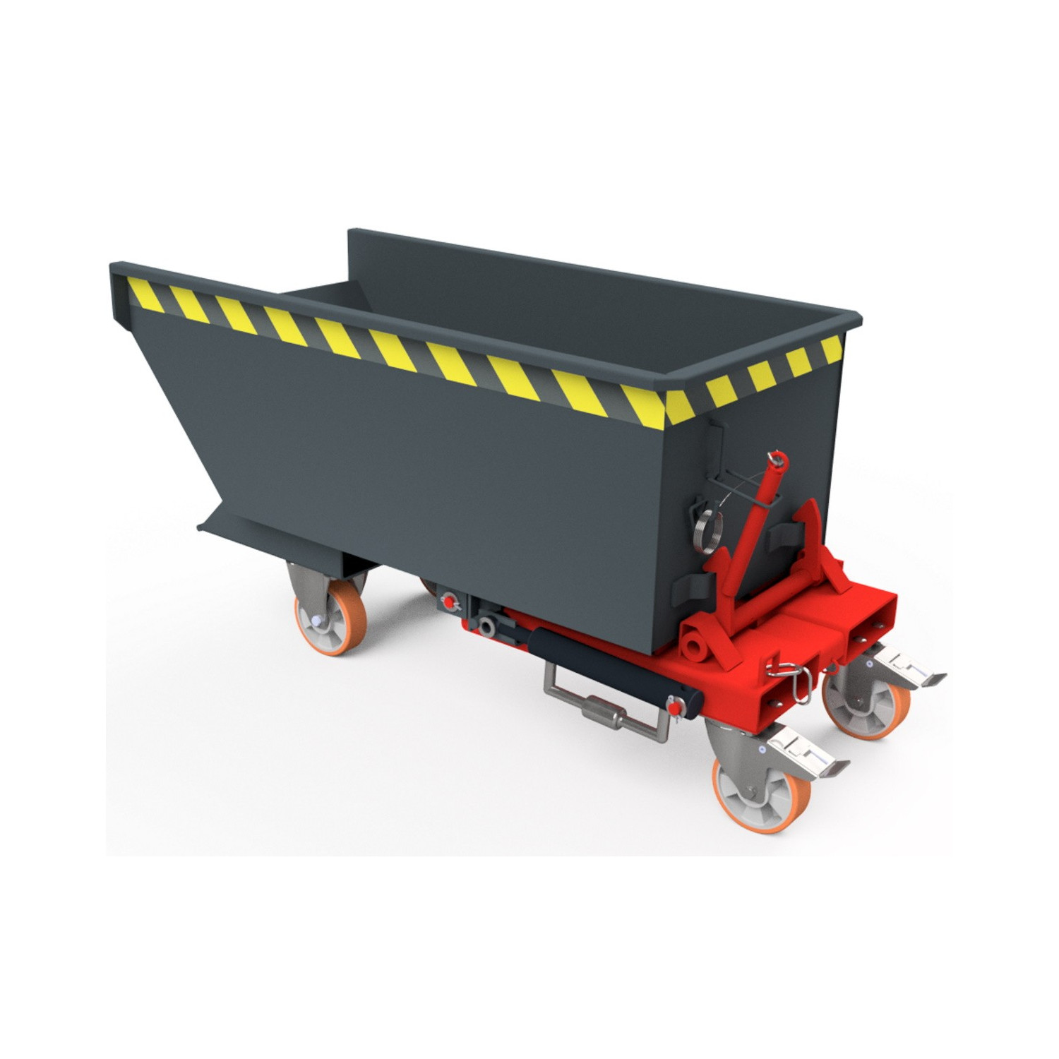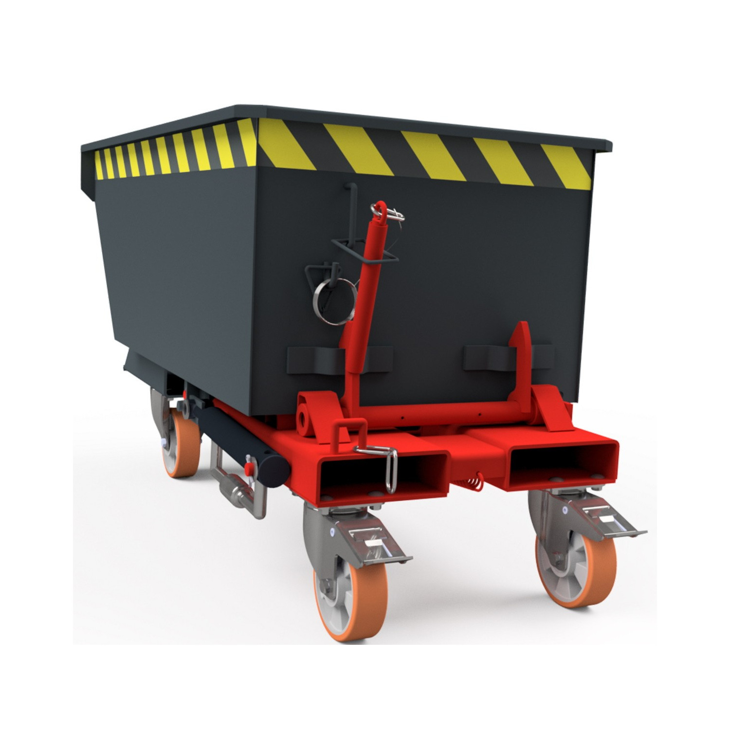 Nach dem Entriegeln per Seilzug vom Sitz des Staplers aus kippt der Behälter ab, so dass Wertstoffe und Späne durch ihr Gewicht selbstständig nach vorne herausrutschen. Durch Absenken des Hubgerüstes wird die Kippmulde in die Ladeposition zurückgebracht.