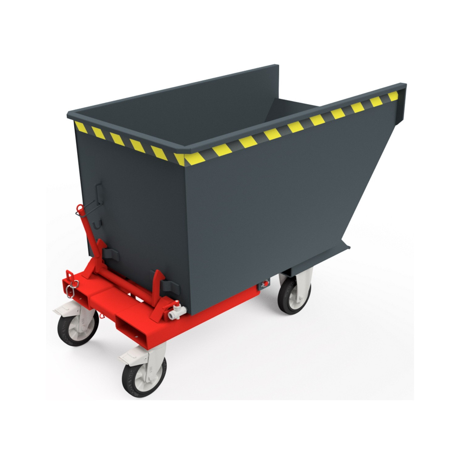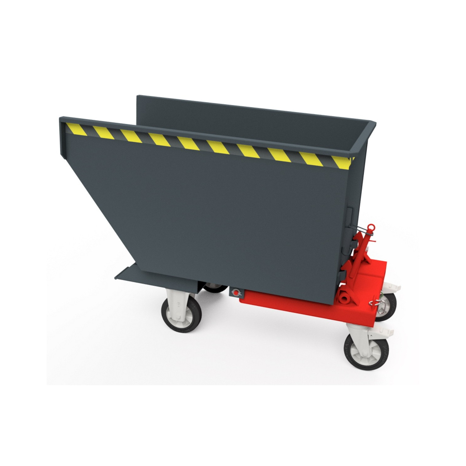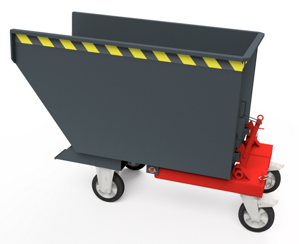 Nach dem Entriegeln per Seilzug vom Sitz des Staplers aus kippt der Behälter ab, so dass Wertstoffe und Späne durch ihr Gewicht selbstständig nach vorne herausrutschen. Durch Absenken des Hubgerüstes wird die Kippmulde in die Ladeposition zurückgebracht.