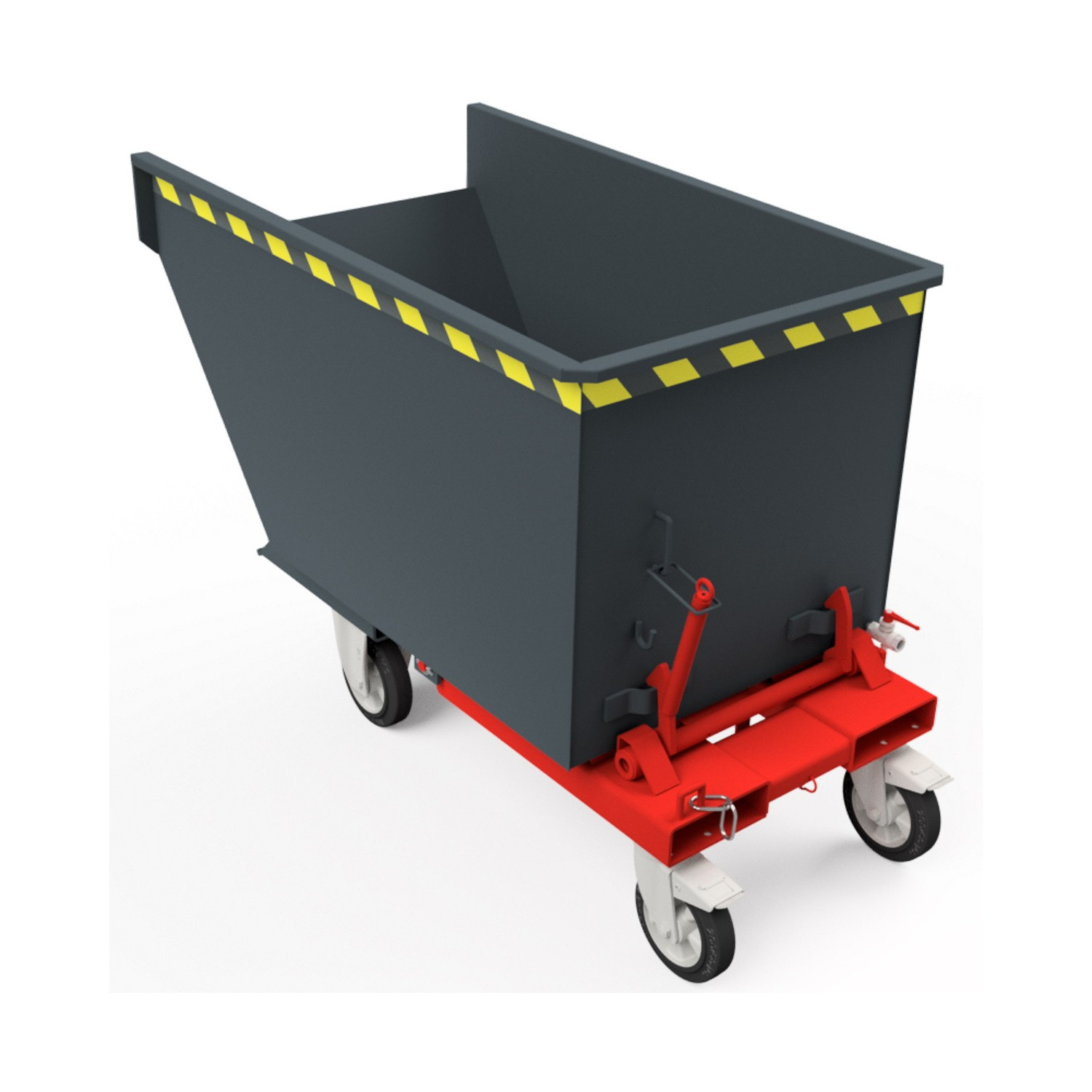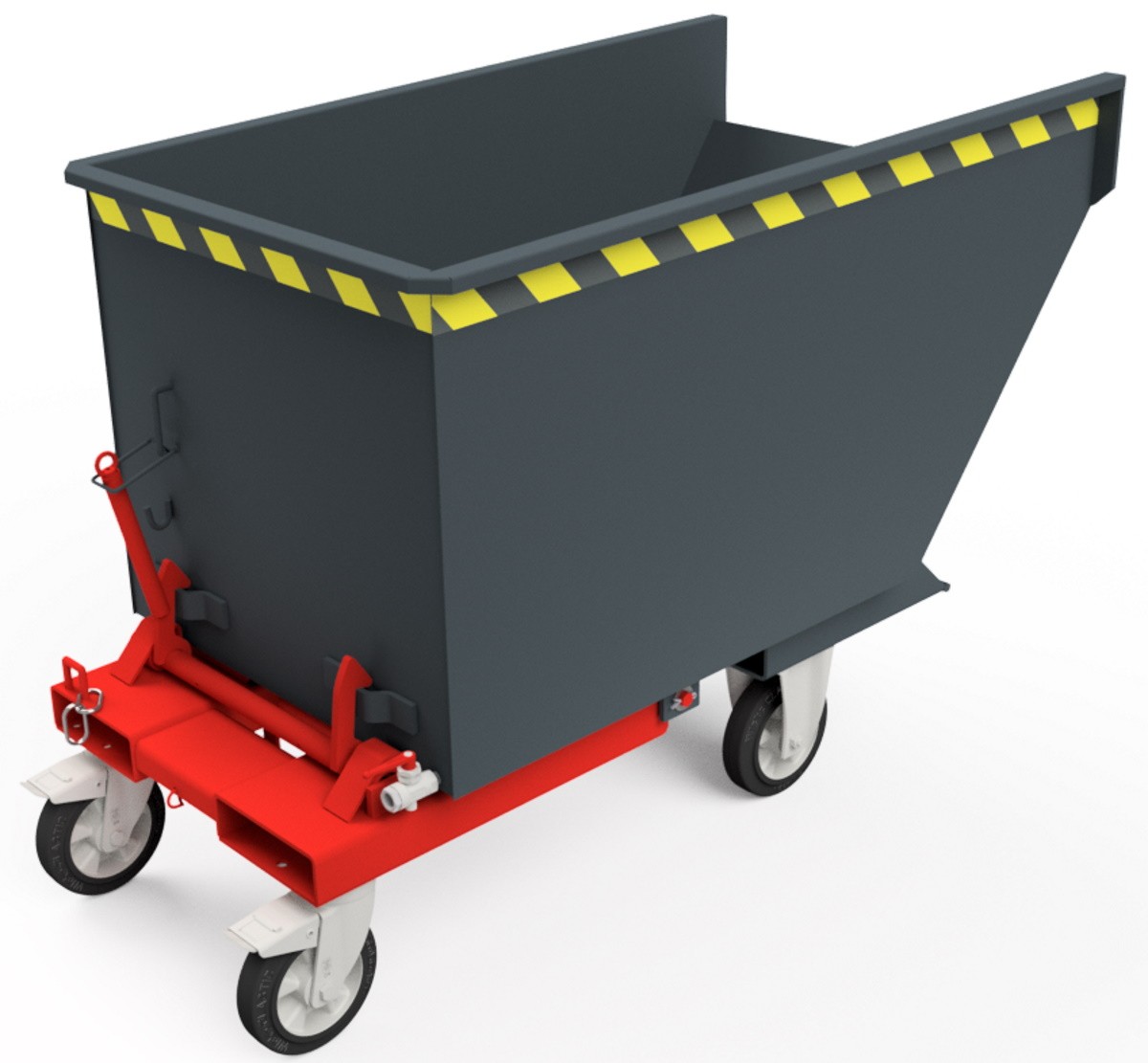 - Abfangbremse mittels Federschere zwischen Behälterboden und Traggestell (fängt die Kippmulde nach circa 90° Drehung ab)