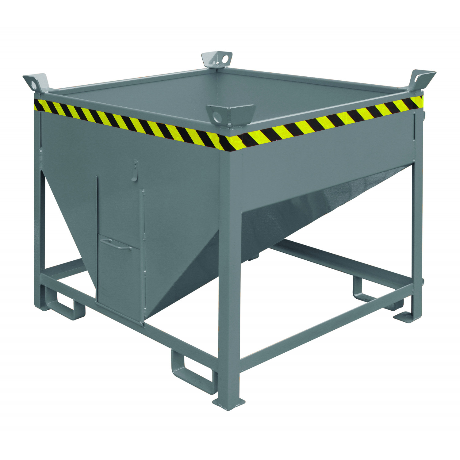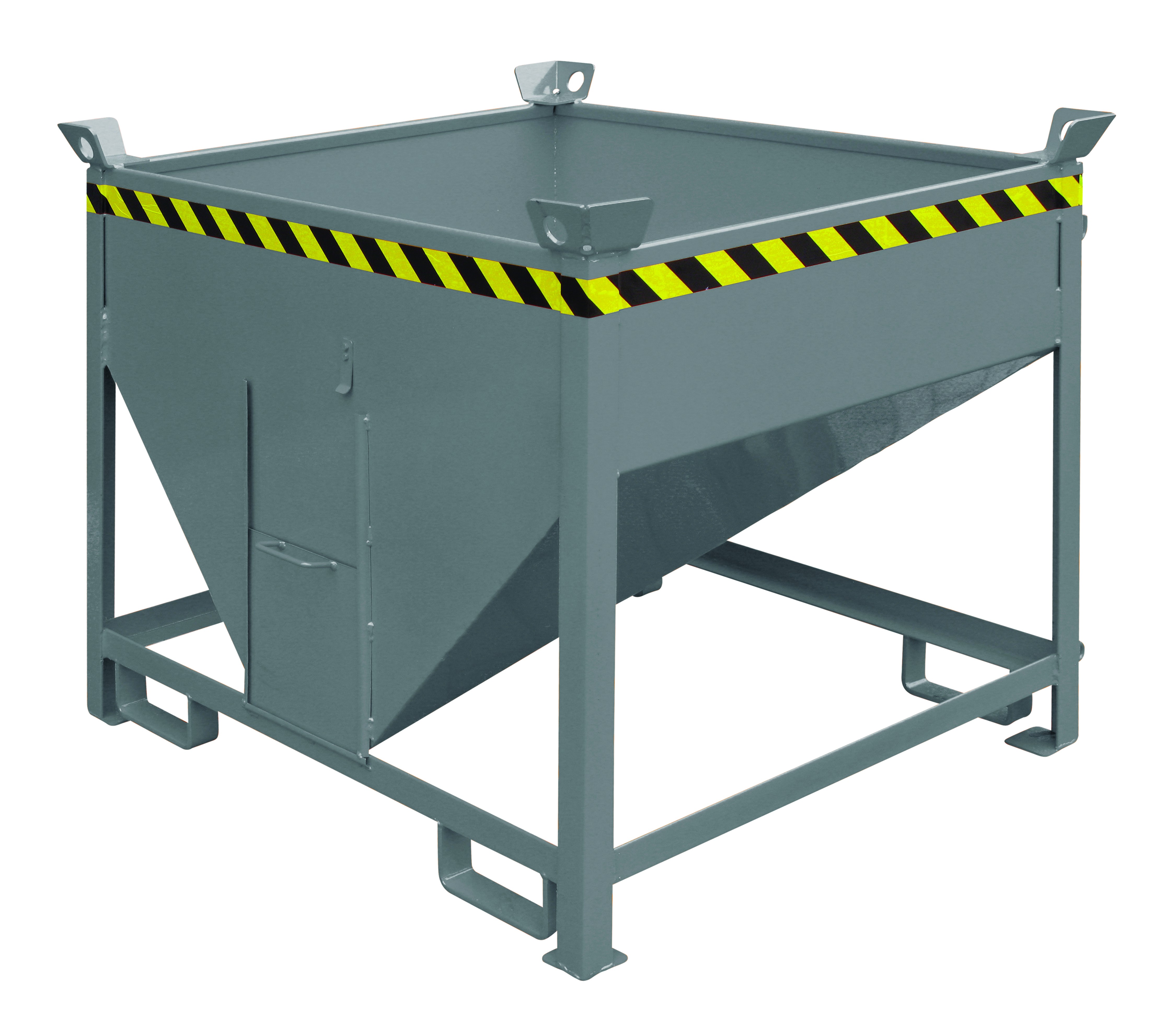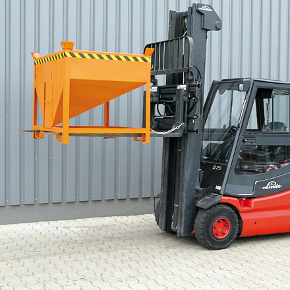 Der Silobehälter mit Auslaufschieber hat einen 30° schräg verlaufenden Boden. Die manuell zu bedienende Öffnung mit Schieber 300 x 300 mm, ermöglicht ein gezieltes und präzises Dosieren von Schütt- und Rieselgut. Einsetzbar an Stapler oder mit Kette am Kran. Dieser Schüttgutbehälter ist ideal für die Sammlung und Entsorgung von feinkörnigen Schüttgütern geeignet. Der Silobehälter besteht aus robustem Stahl und ist zum Schutz vor Kratzern und Korrosion wahlweise lackiert oder feuerverzinkt. Zum einfachen Transportieren oder Entleeren über einem Container ist der Silobehälter mit Stapler-Einfahrtaschen ausgestattet.