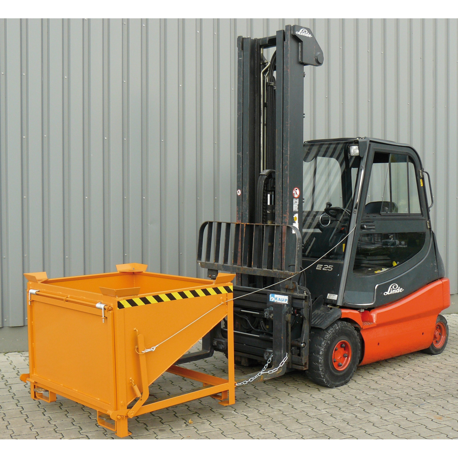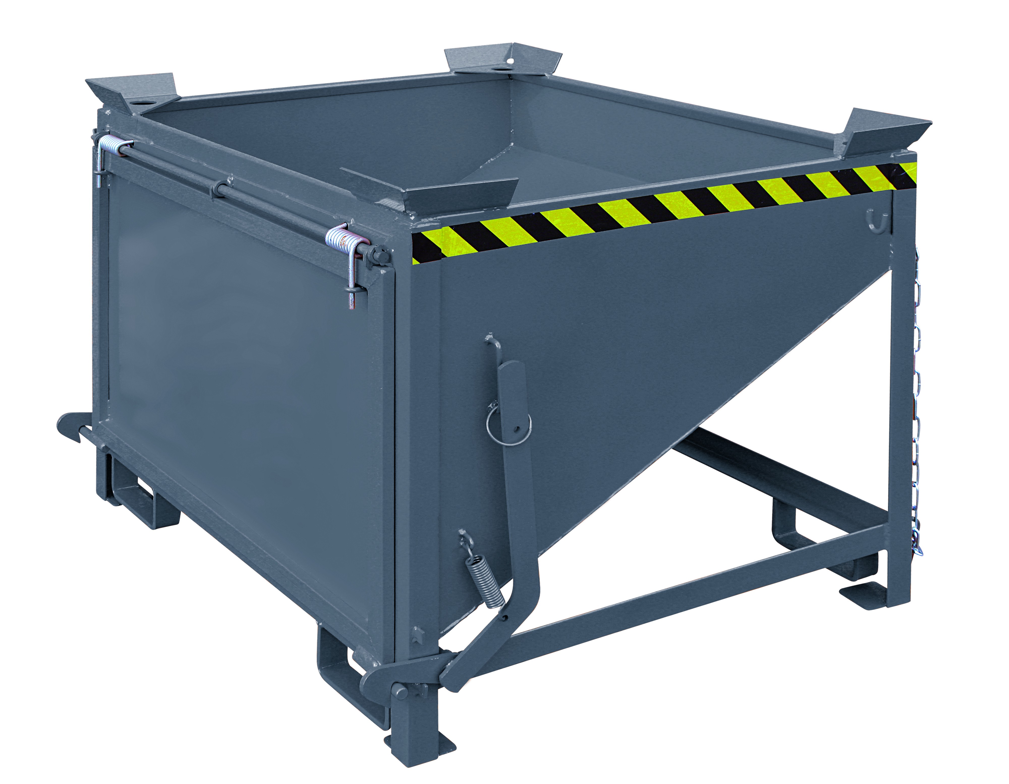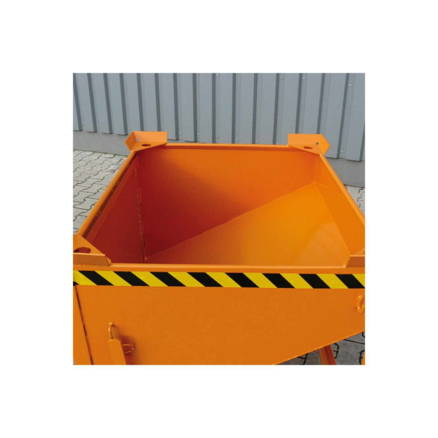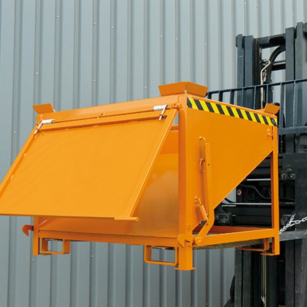 Der Silobehälter mit großflächiger Schüttklappe hat einen 30° schräg verlaufenden Boden. Der Behälter ist serienmäßig mit umlaufend verstärktem Profil-Rand, Stapler-Einfahrbügeln und aufgeschweißten Ecken zur Positionsfixierung beim Übereinanderstapeln sowie mit Kette zur Abrutschsicherung. Einsetzbar an Stapler oder mit Kette am Kran.