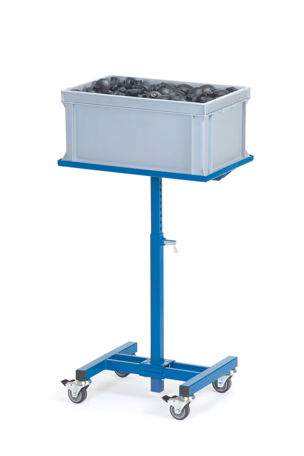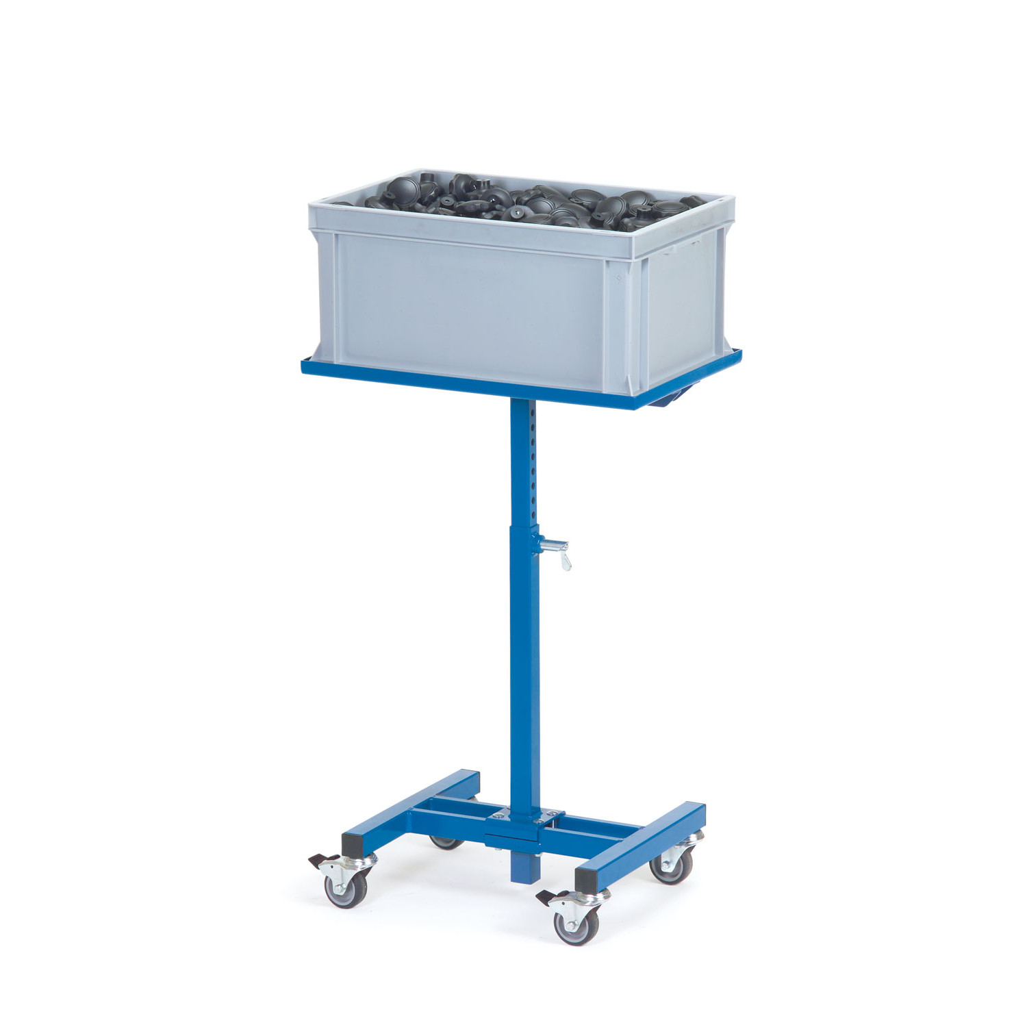 Der Materialständer mit fester Plattform eignet sich ideal für Kunststoffkästen, Drahtkörbe und vielem mehr. Mithilfe eines Federriegels lässt er sich einfach in der Höhe arretieren und kann somit an die optimale Arbeitshöhe angepasst werden.