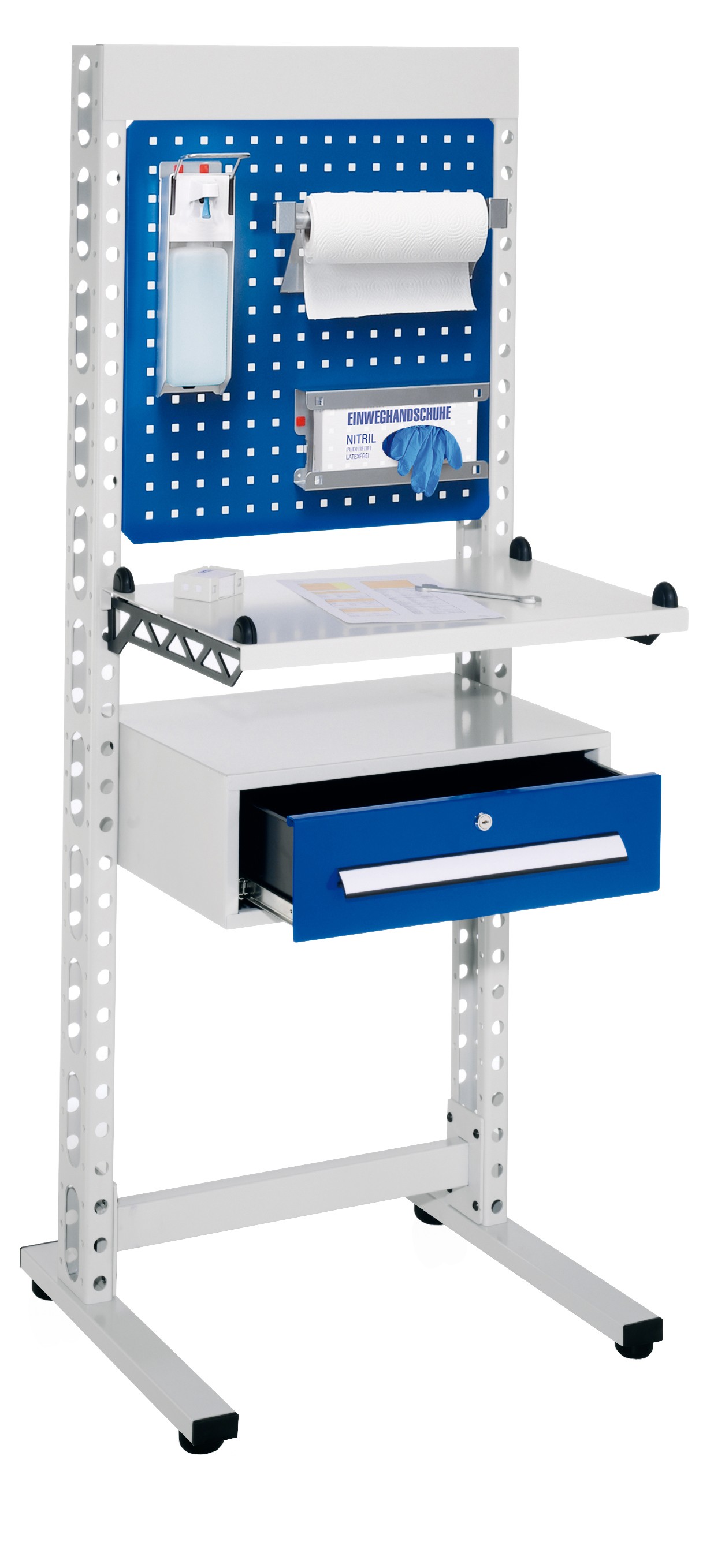 - Der Hygienearbeitsplatz kann entweder mit Bodenausgleichsfüße oder Lenkrollen für mobiles Arbeiten ausgestattet werden
