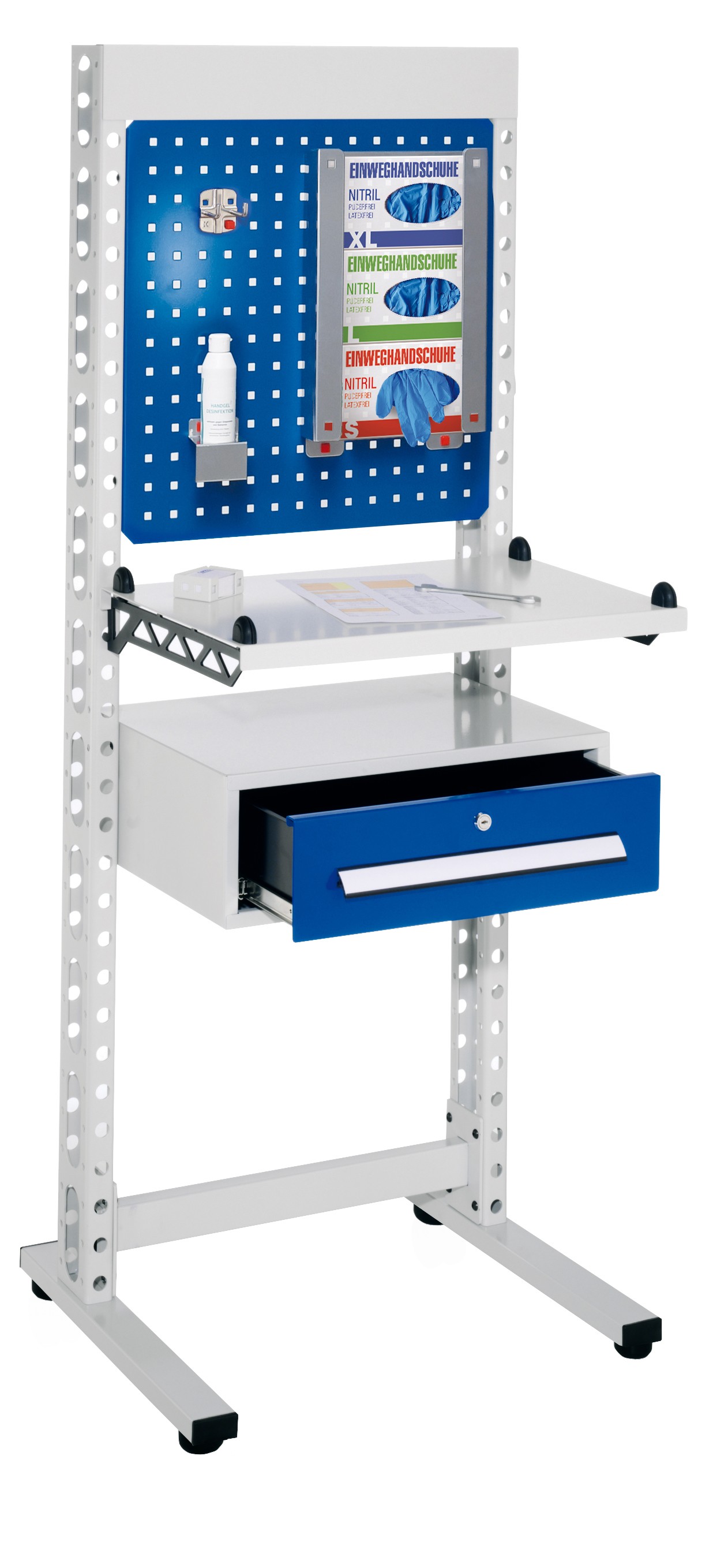 • Der Steharbeitsplatz lässt sich modular Aufbauen und kann in einem 50 mm Raster verstellt werden