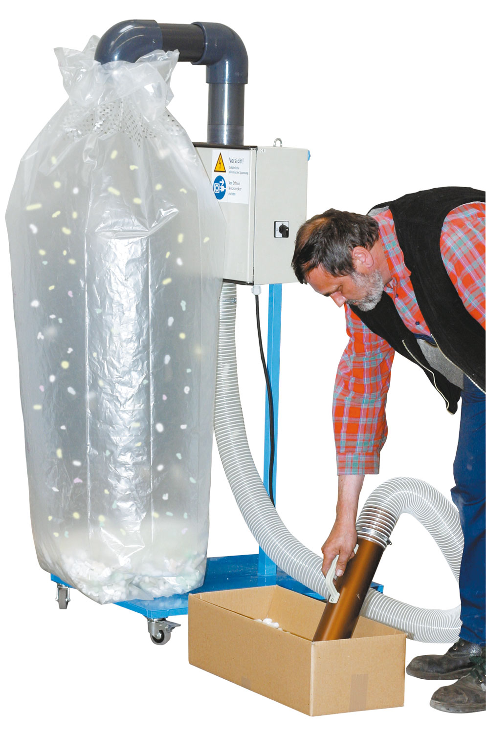 - Mit dem Sauger lassen sich Verpackungs-Chips schnell und einfach aufsaugen.