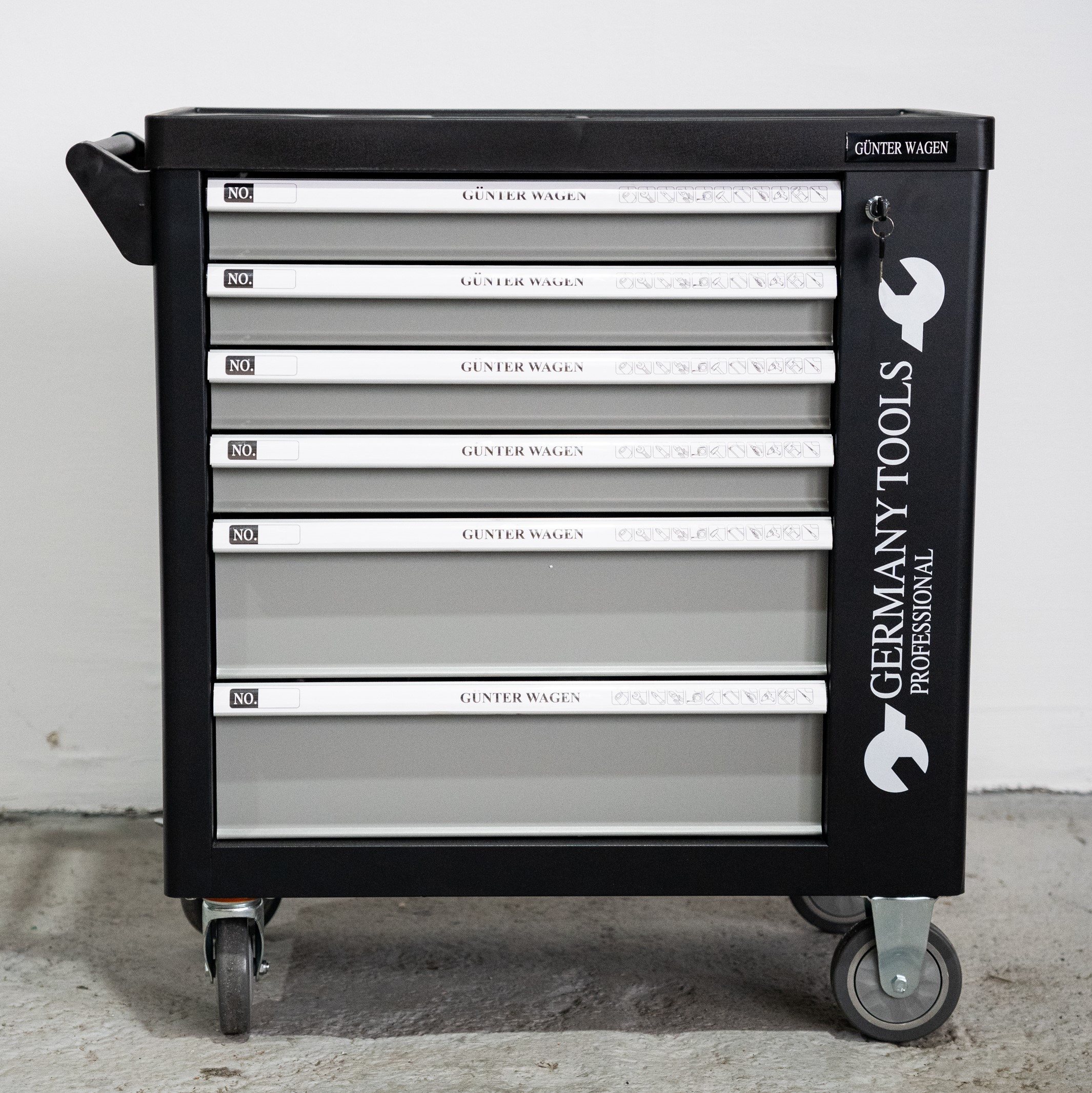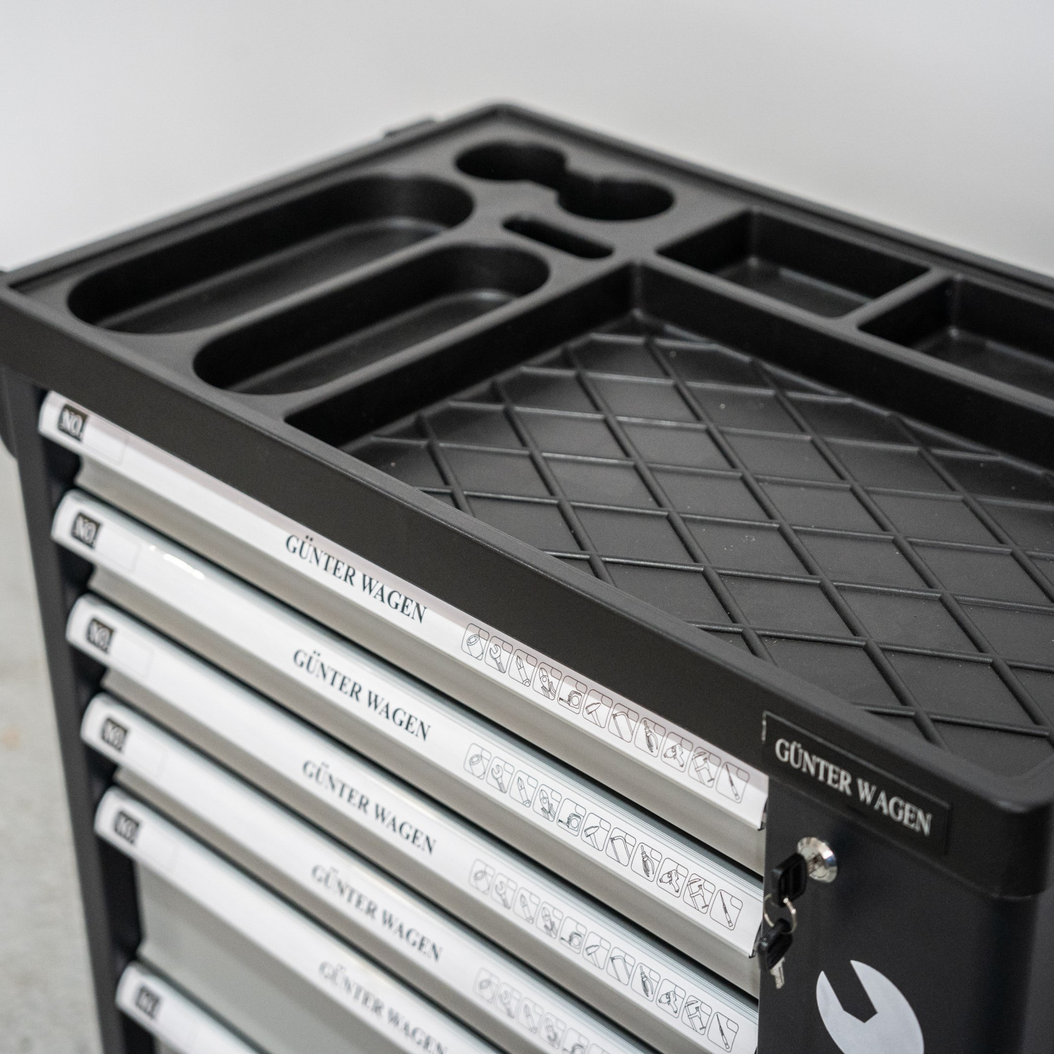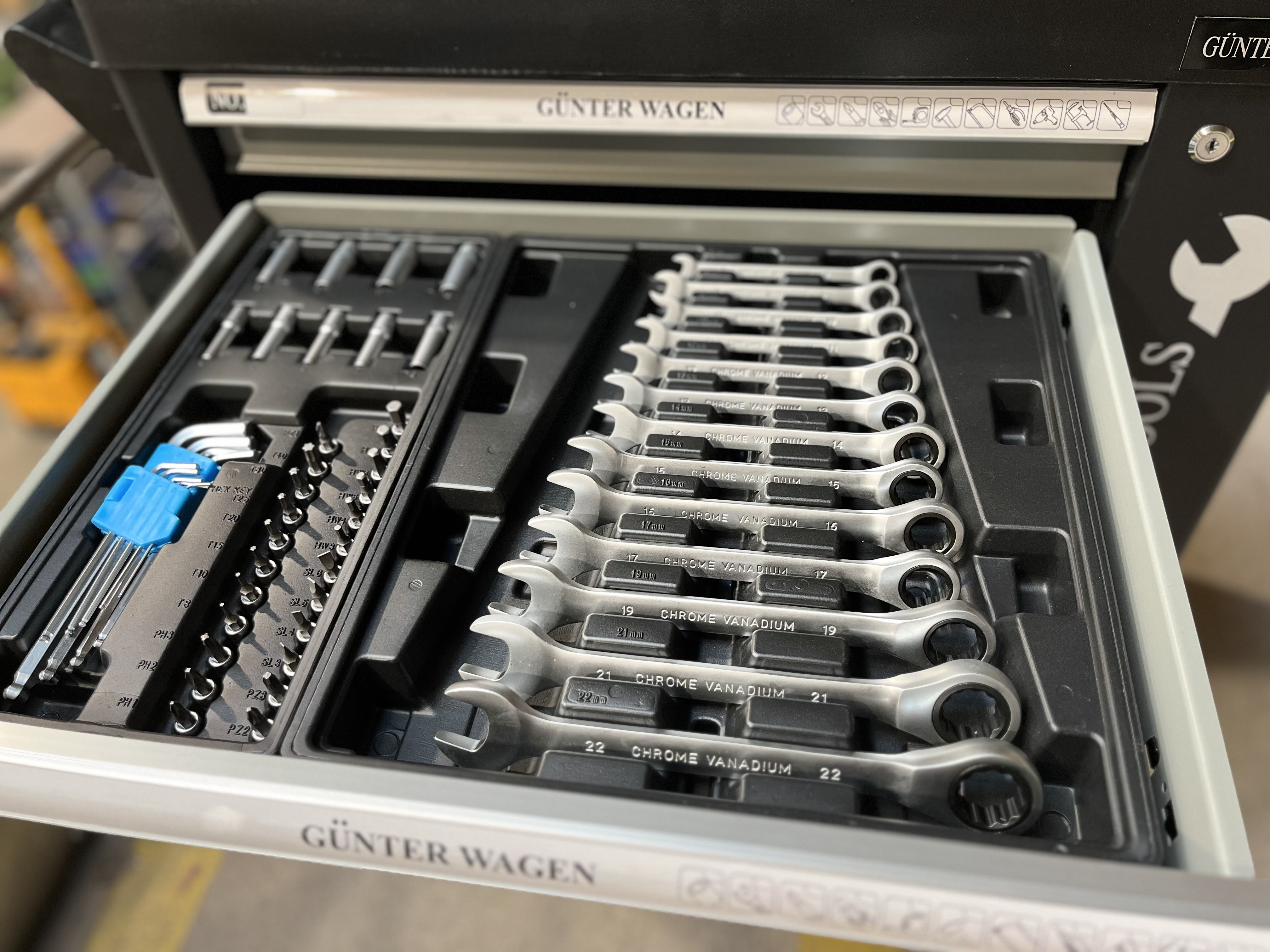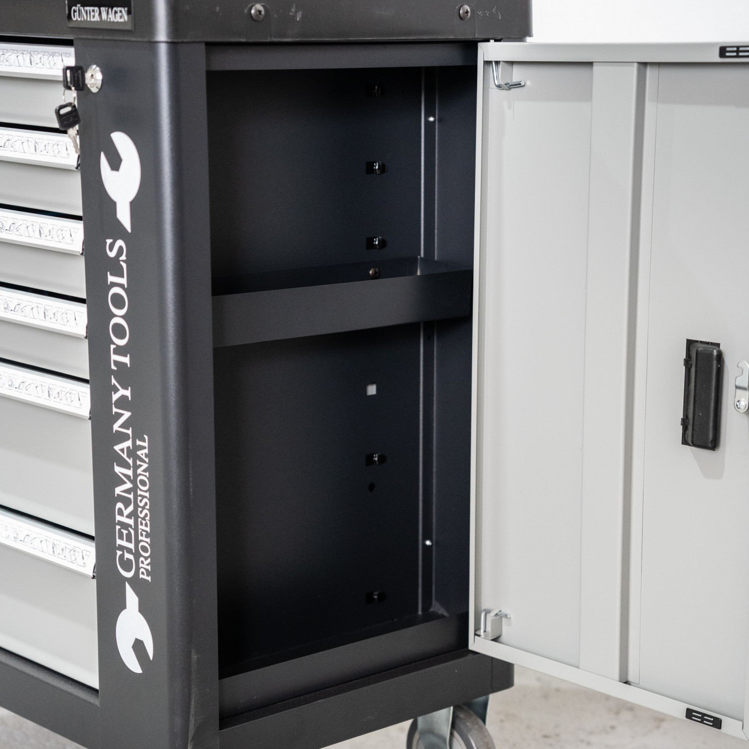 - 6 Schubladen, davon 4 bestückt, sowie eine Flügeltür ermöglichen eine übersichtliche Sortierung der Werkzeuge