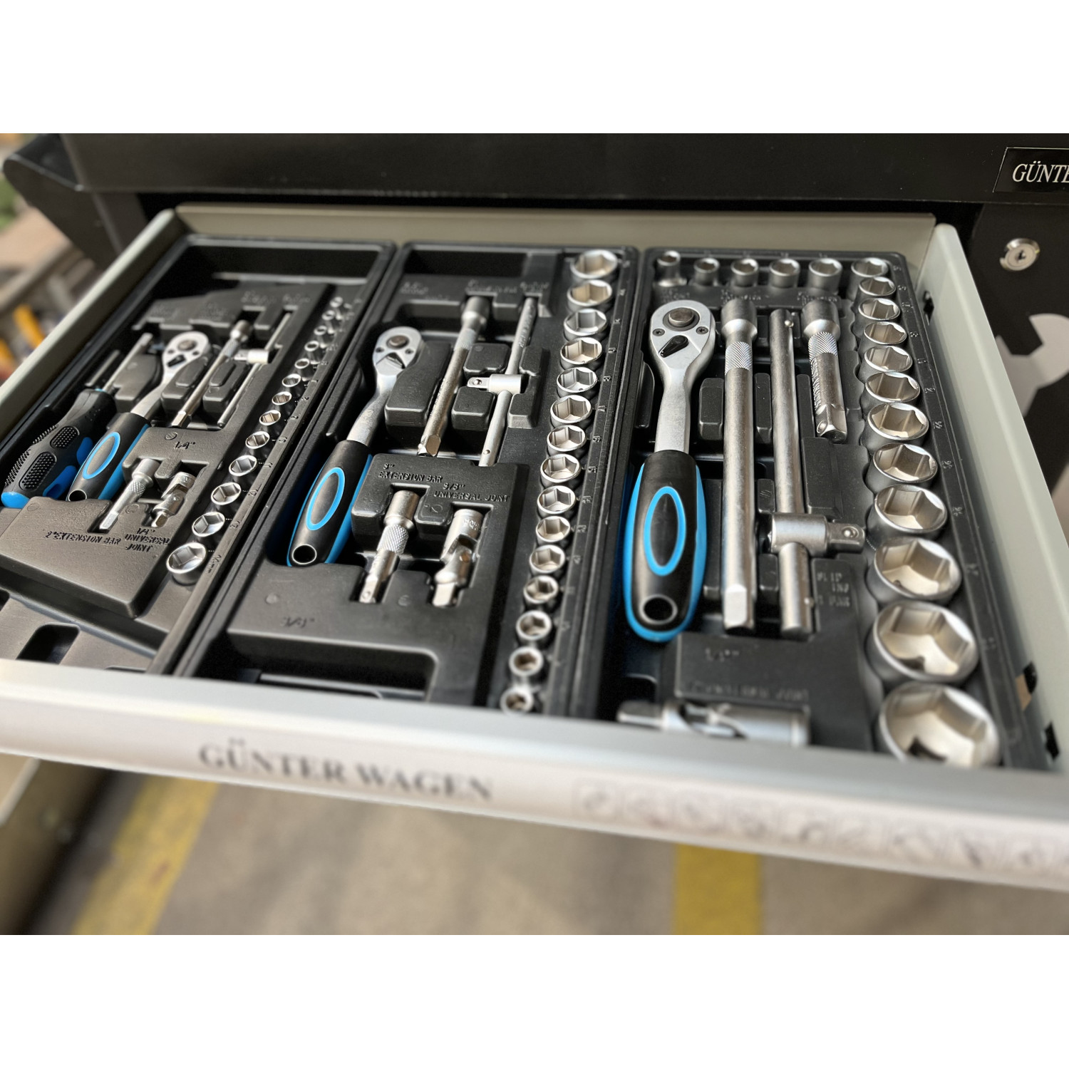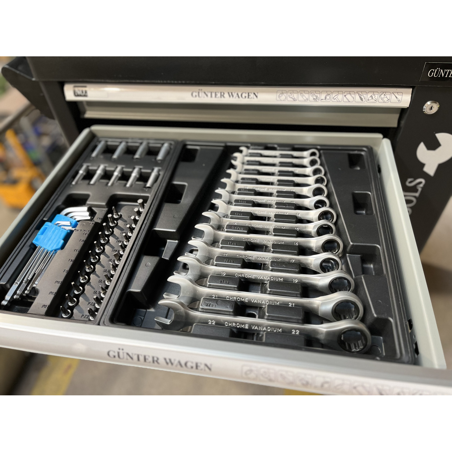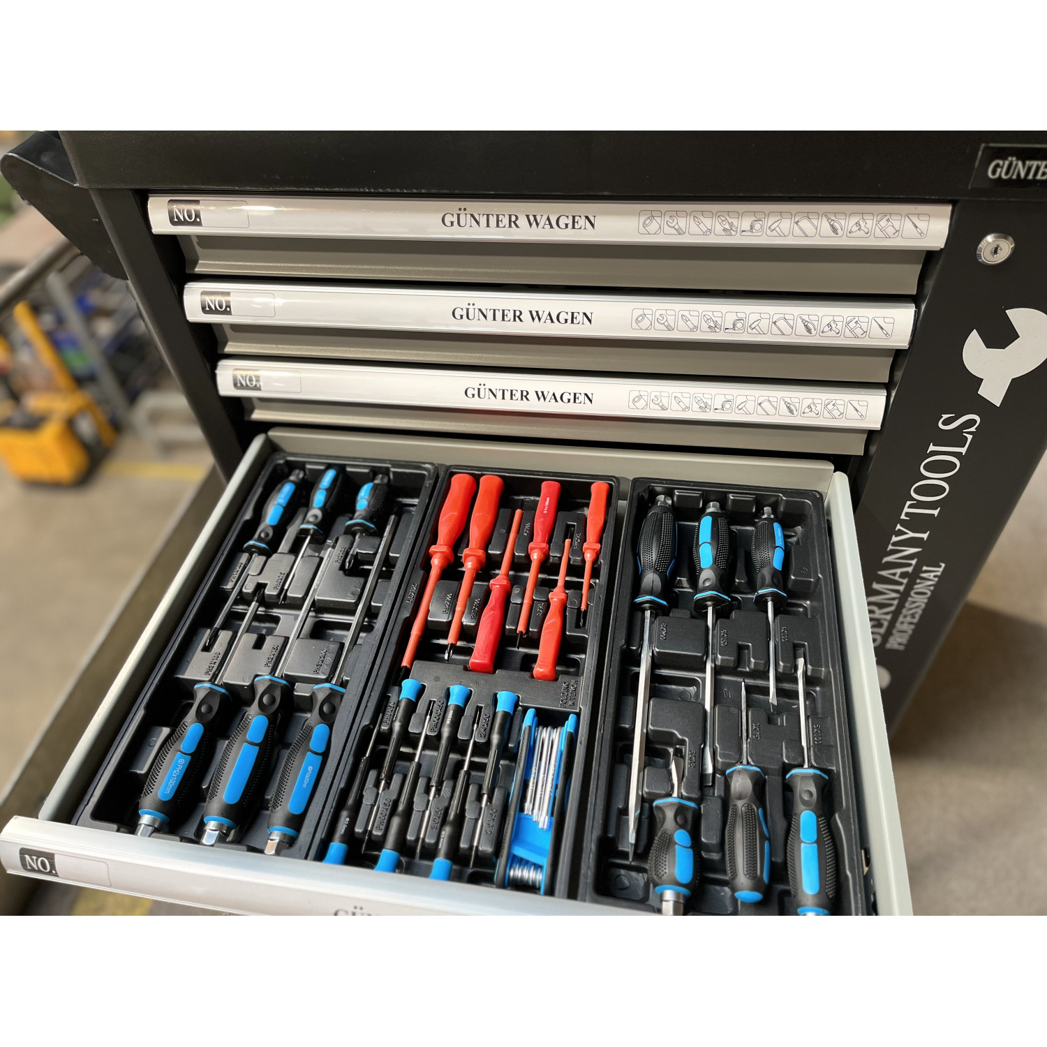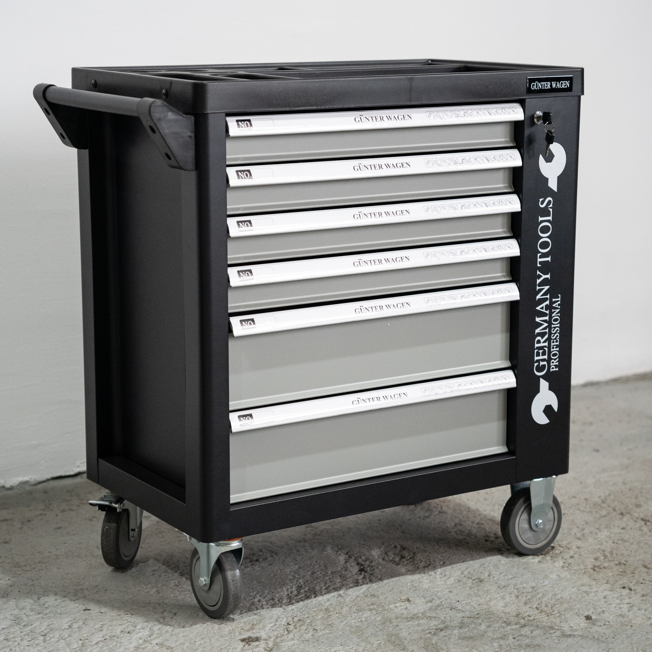 - 6 Schubladen, davon 4 bestückt, sowie eine Flügeltür ermöglichen eine übersichtliche Sortierung der Werkzeuge
