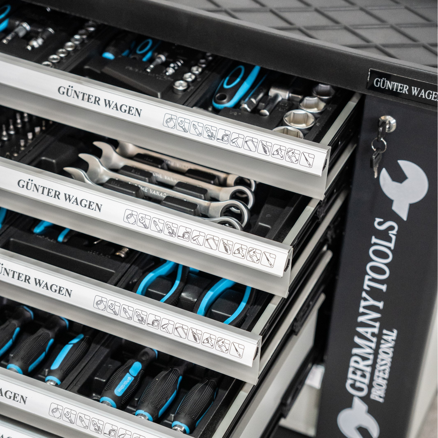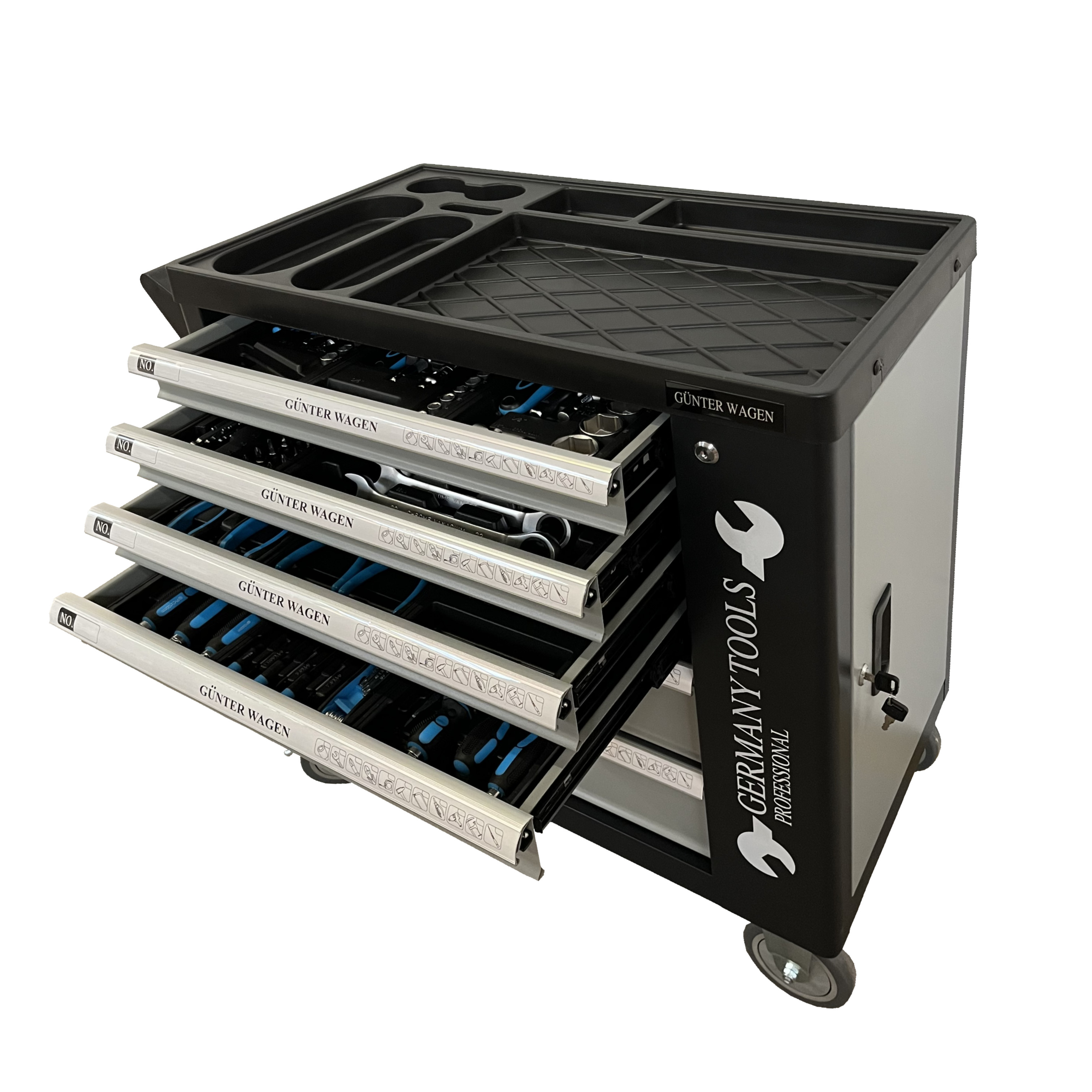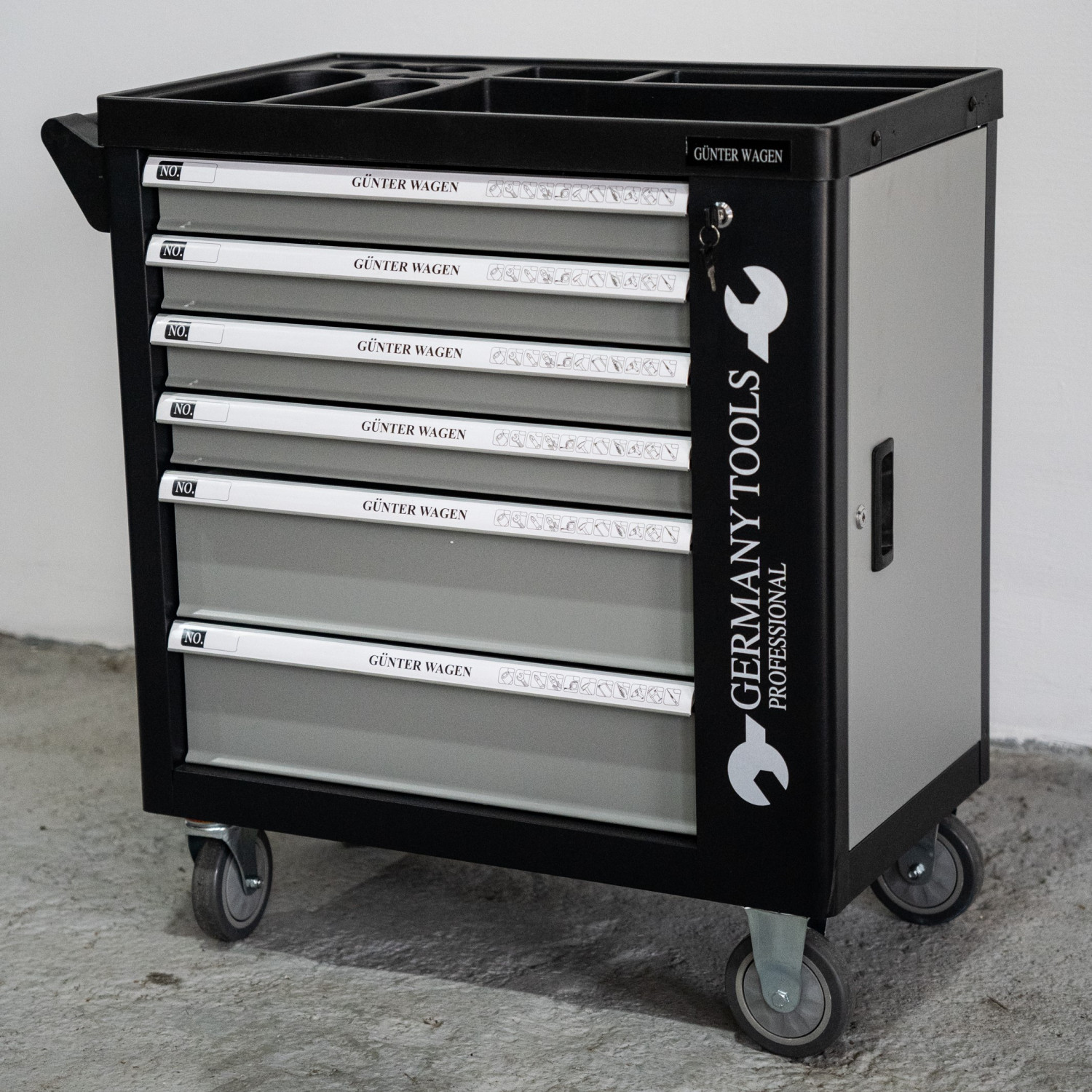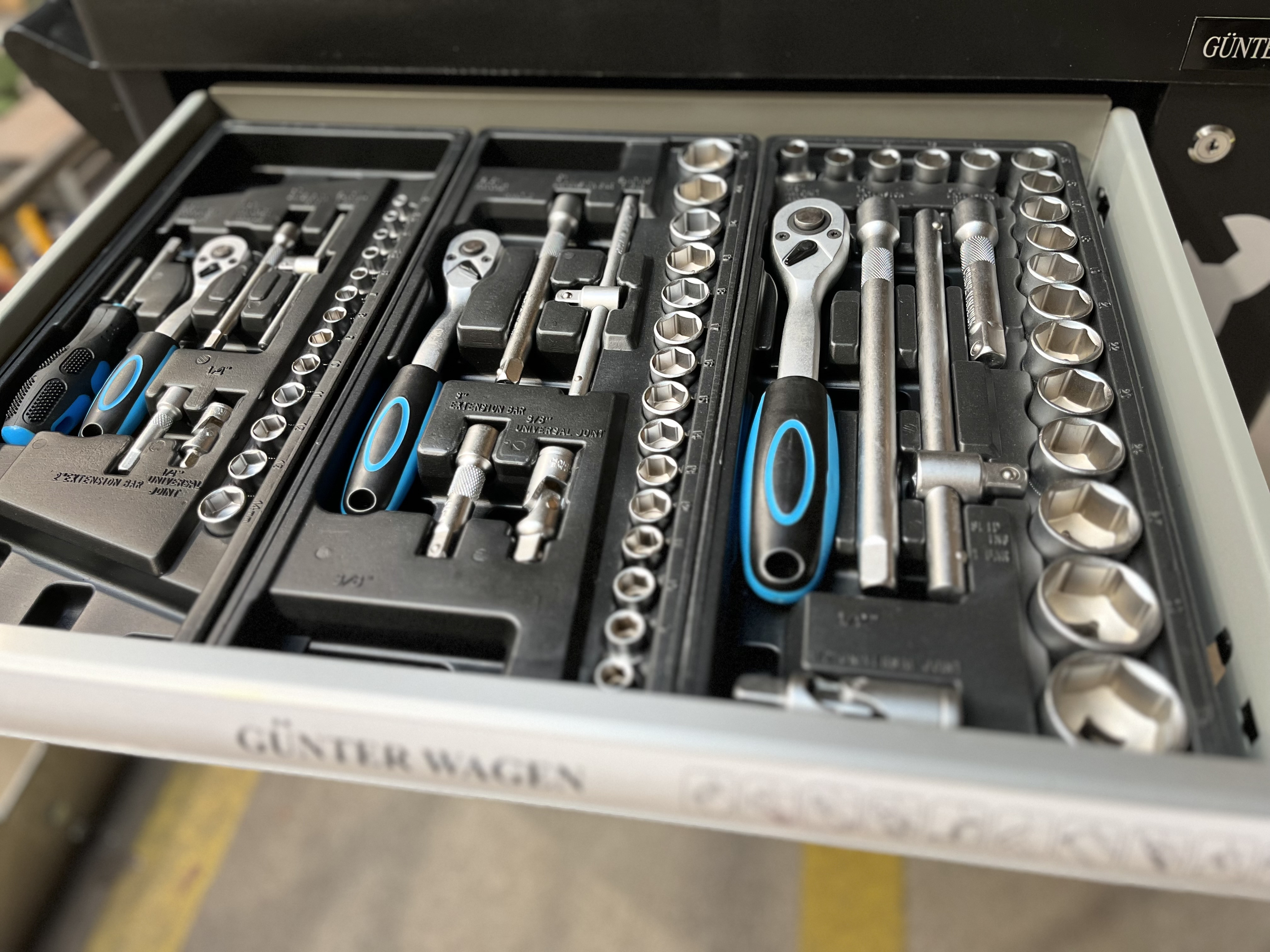 - 6 Schubladen, davon 4 bestückt, sowie eine Flügeltür ermöglichen eine übersichtliche Sortierung der Werkzeuge