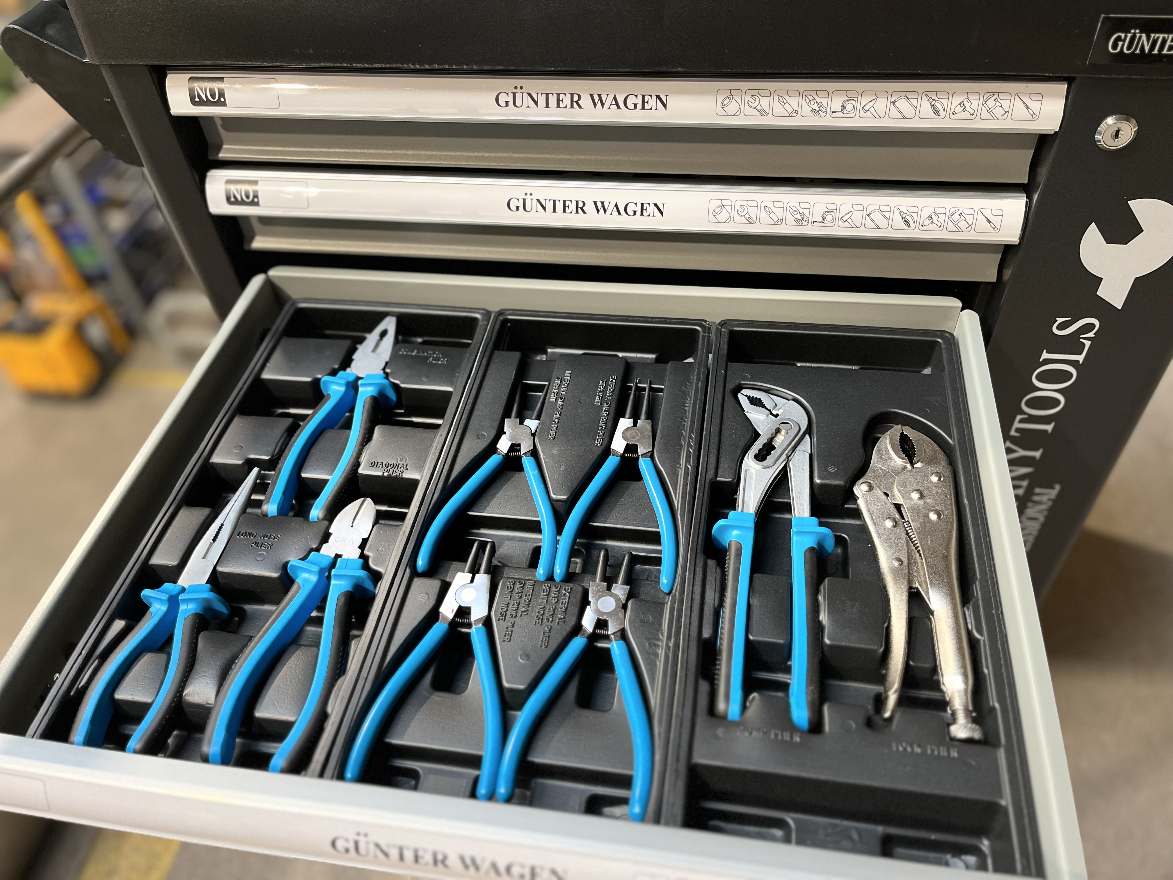 Schublade 3: 4x Sicherungsringzangen, 1x Schlosszange, 1x Rohrzange,1x Kombizange, 1x Spitzzange, 1x Diagonalzange bzw. Seitenschneider