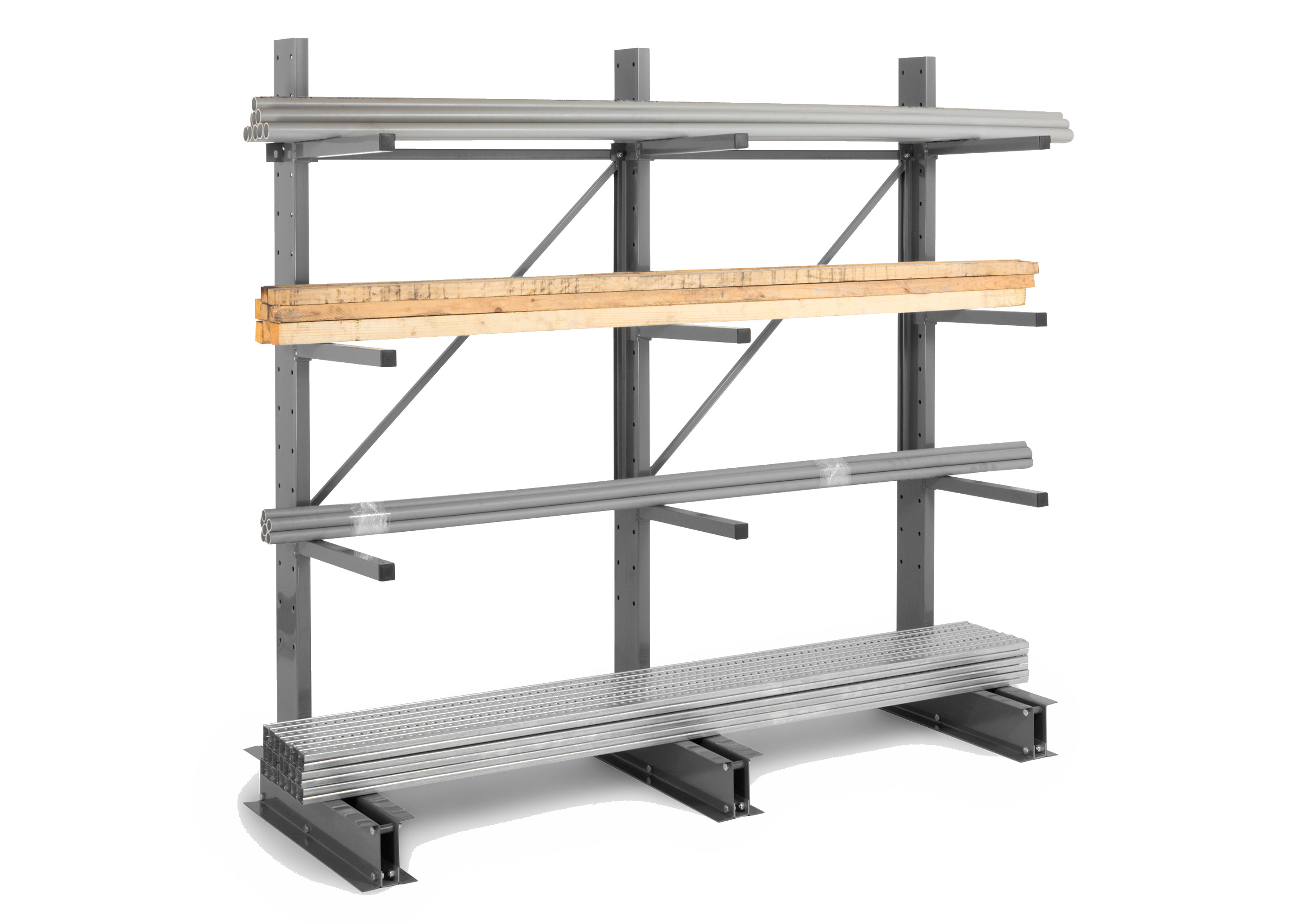- Lagerung von Latten und Brettern, zylindrischen Produkten wie Verbindungseisen, Rundhölzer und Rohren. Bei Einsatz von optionalen Auflagen auch für weiche Materialien wie Schläuche oder Gummidichtungen.