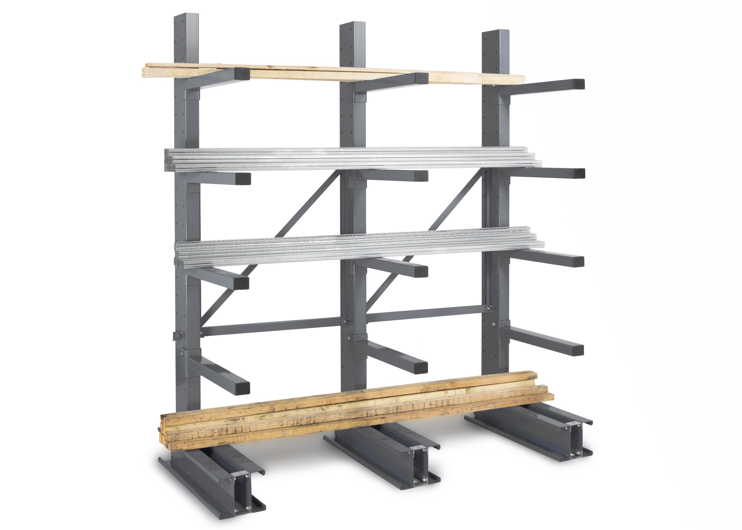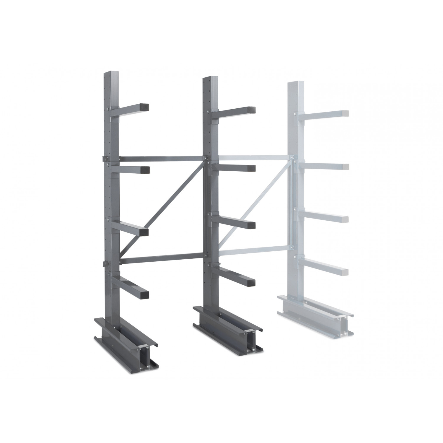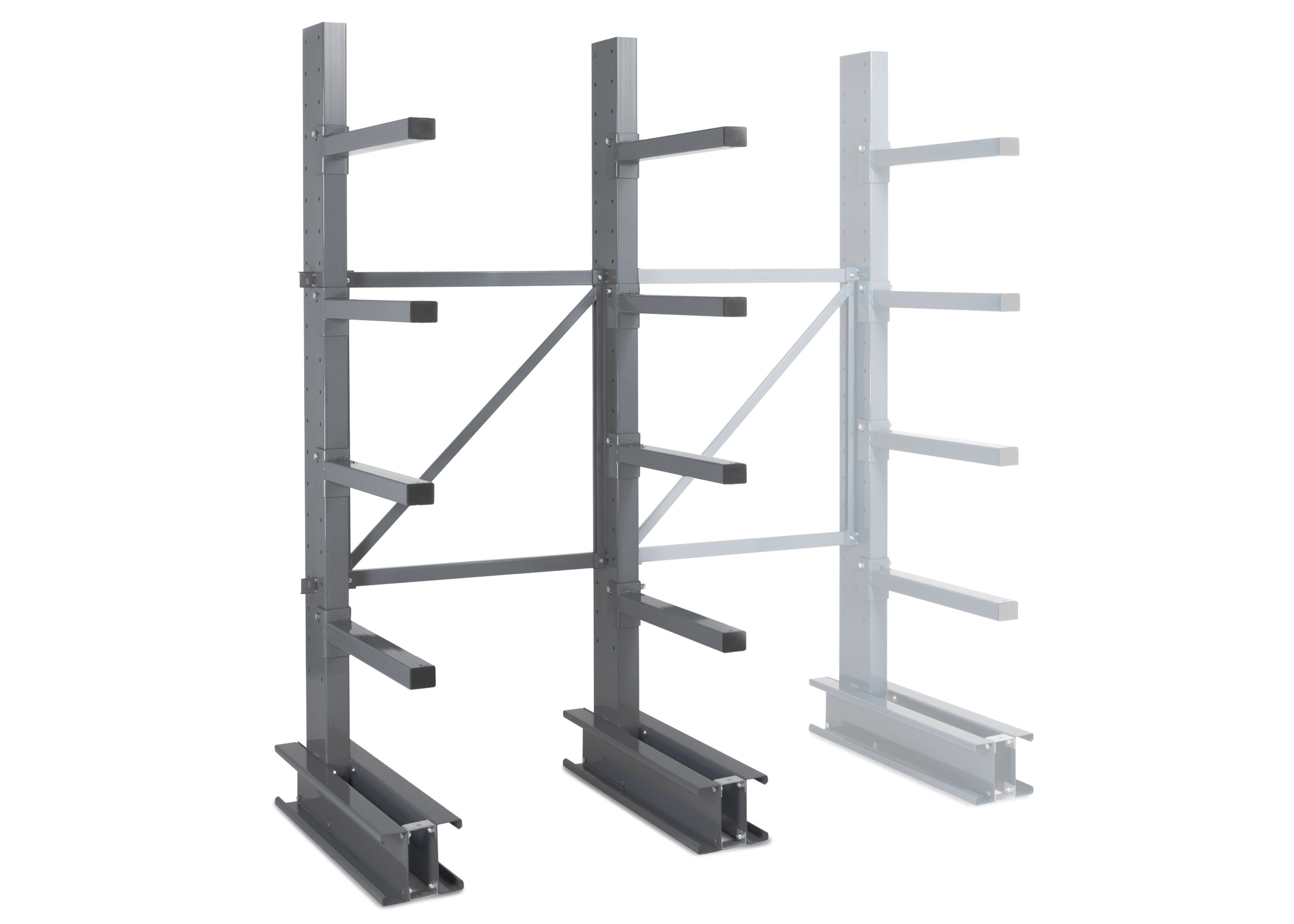 Die Auslieferung erfolgt demontiert. Die Kragarmregale müssen auf einem Boden befestigt werden, dessen Festigkeit über der Betonfestigkeitsklasse 16/20 liegt.