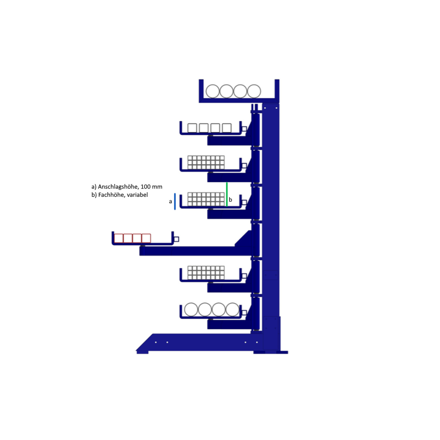 Das Schwenkarm-Regal ermöglicht raumsparendes Wegklappen der Kragarme und somit freie Arbeitsgänge, wenn die Lagerfläche nicht benötigt wird. Eine solide und geschweißte Stahlkonstruktion, schwenkbare Kragarme mit wartungsfreien Scharnieren sowie die einfache Be- und Entladung mit dem Hallenkran bieten viele Vorteile. Galvanisierte Wannen oder Fachteiler für eine bessere Übersicht können separat hinzu bestellt werden.