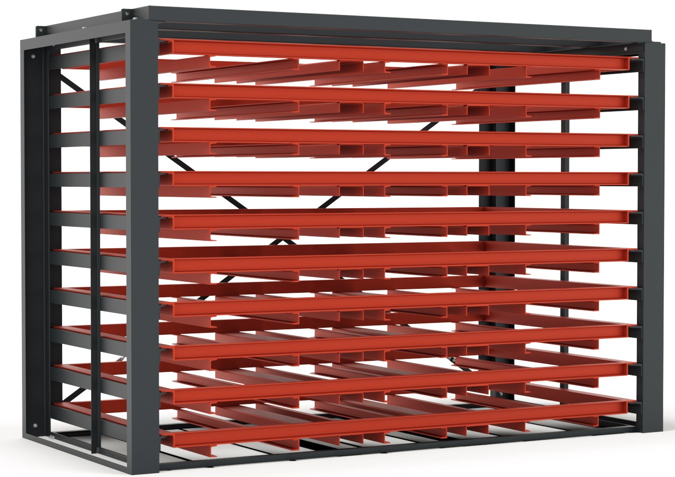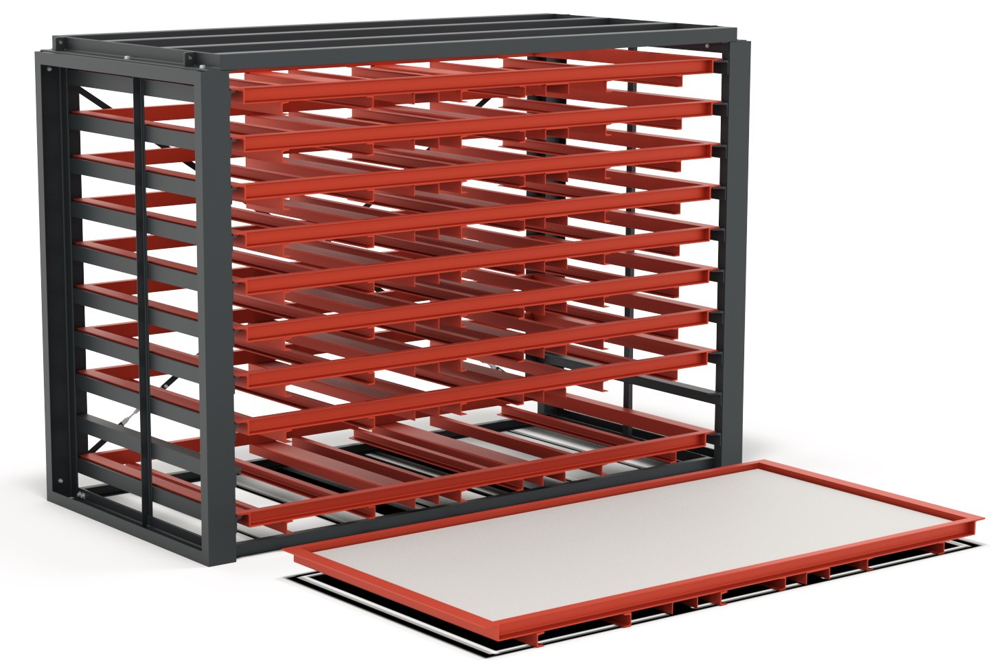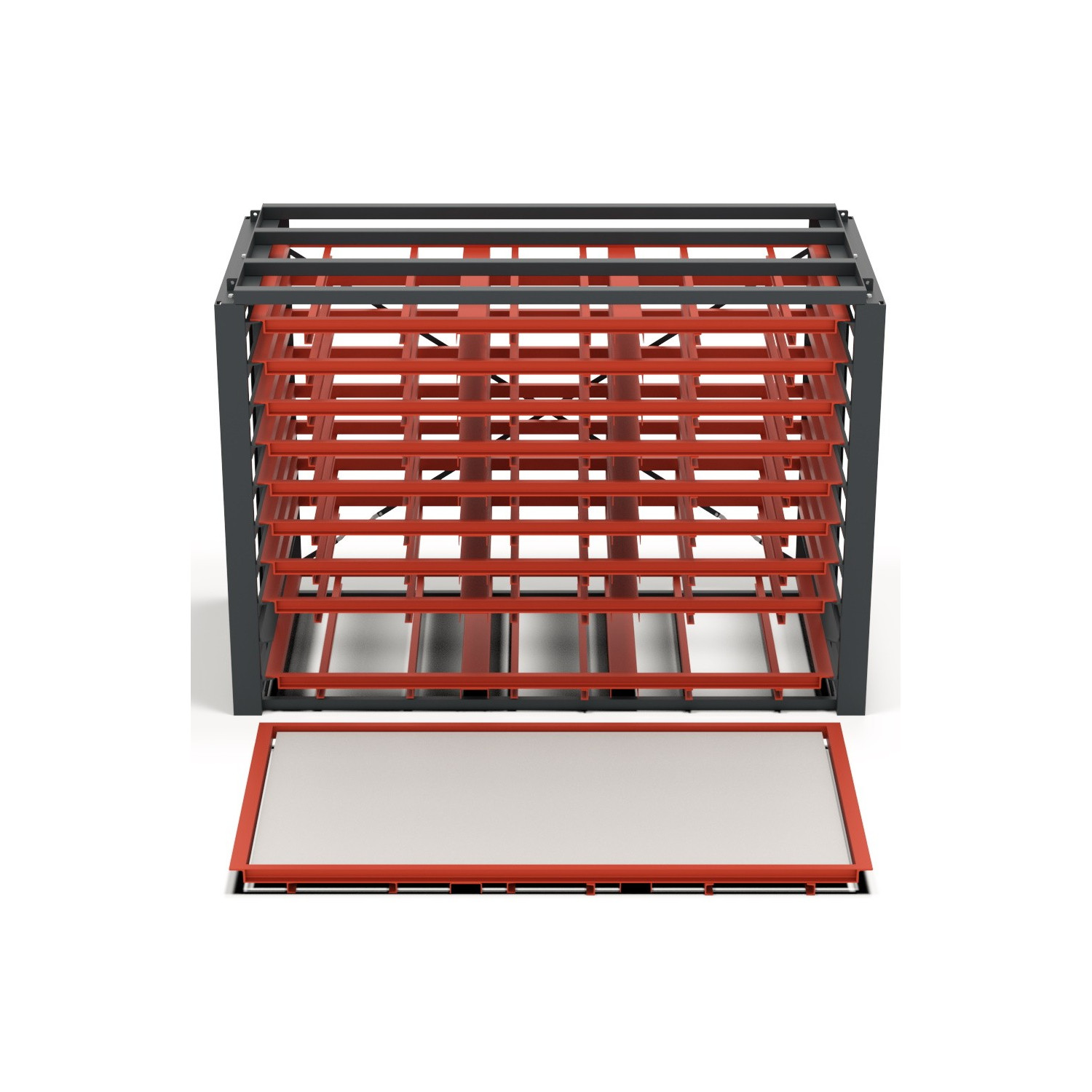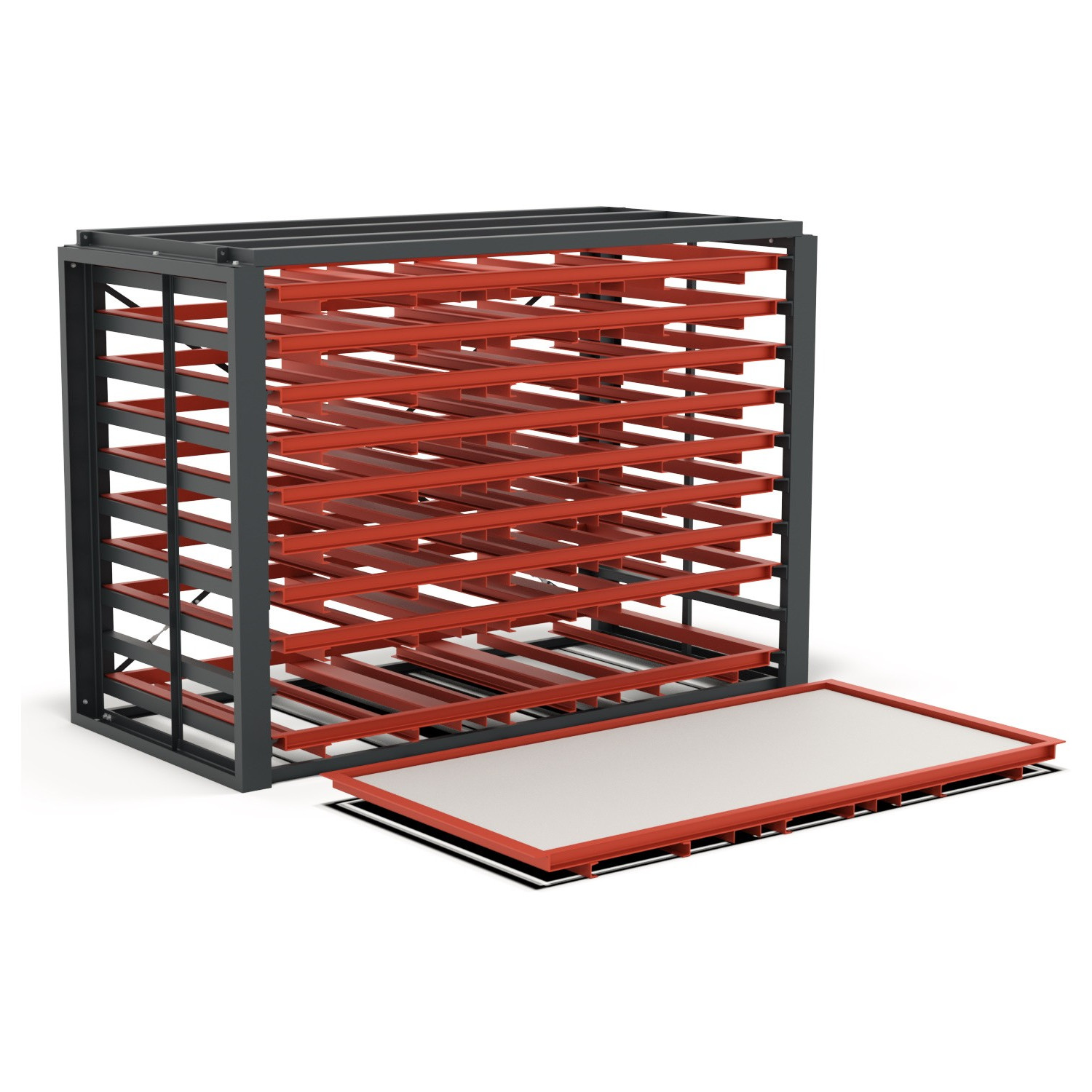 Unser Flachpaletten-Magazin mit untergebauten Staplertaschen ist besonders für Tafelmaterial größer als Großformat geeignet. Das Flachpaletten-Magazin ist die ideale Lösung für die effiziente Blecheinlagerung. Es erhöht die Kapazität, Übersichtlichkeit und somit die Ordnung in ihrer Fertigung.