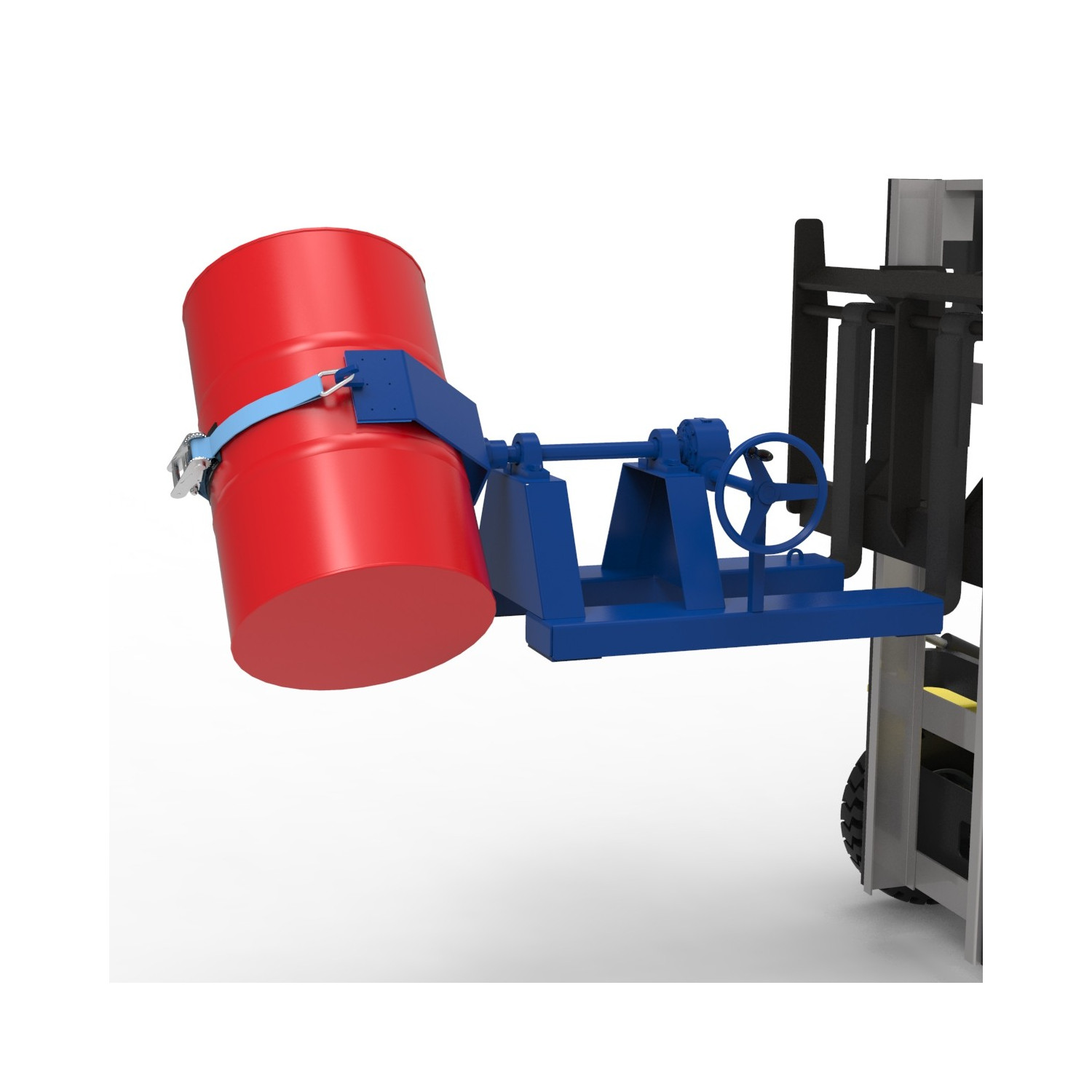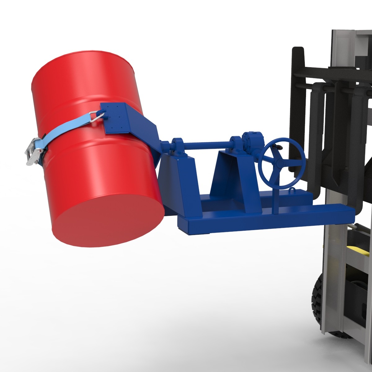- Der Fasswender wird einfach mit einem Stapler aufgenommen und kann Fässer seitlich entleeren