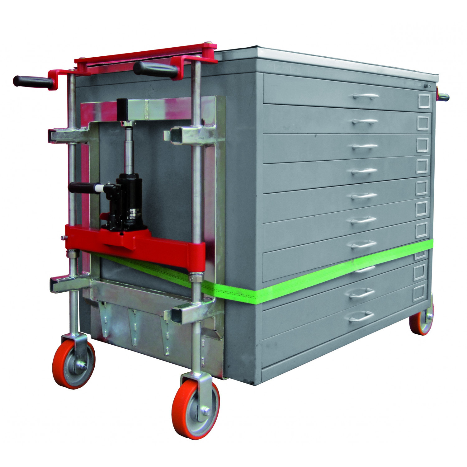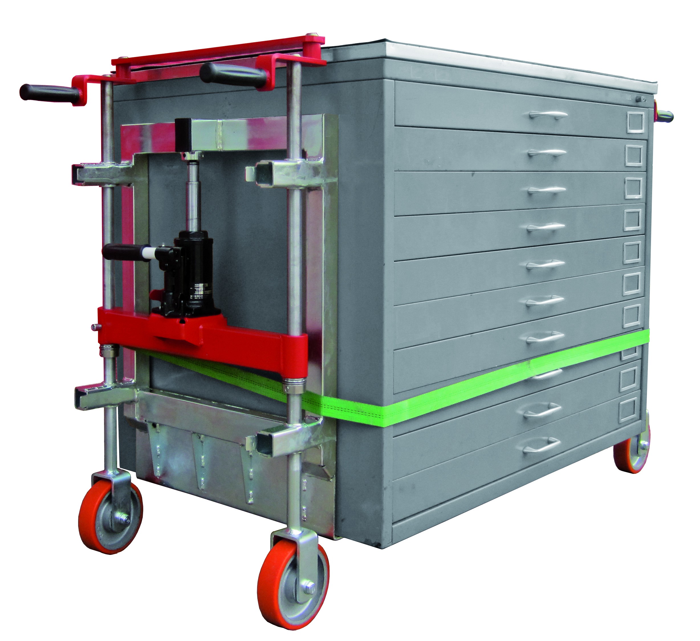 - Die beiden Hydro-Transporterhälften werden seitlich an das zu transportierende Gerät oder Gut (Schränke, Tresore, Maschinen, Kisten etc.) mit dem Umreifungsgurt zusammengespannt, dadurch entsteht eine Transporteinheit