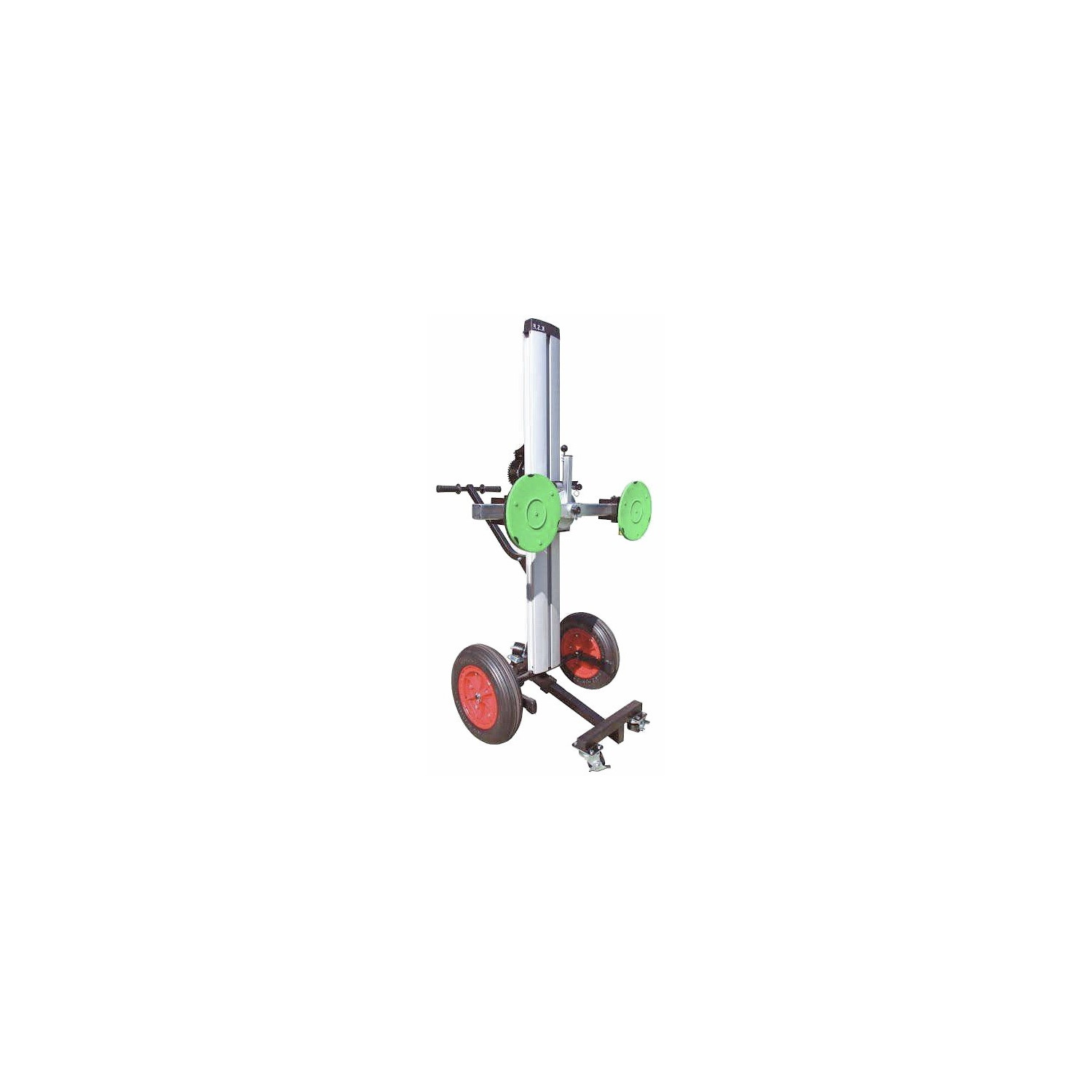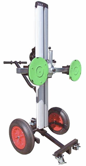 Der Glaslift GT-2 ist ein Hilfmittel zum Be- und Entladen und dem Transport von Glas. Der drehbare Saugnapf-Halter erlaubt es Glasscheiben bis 2.800 mm Größe um 360° zu drehen. Zusätzlich kann der Mast um 90° geschwenkt werden. So können Glasscheiben auch in Längsrichtung transportiert werden. Damit passt der GT-2 mit Glasscheibe durch 800 mm schmale Türen.