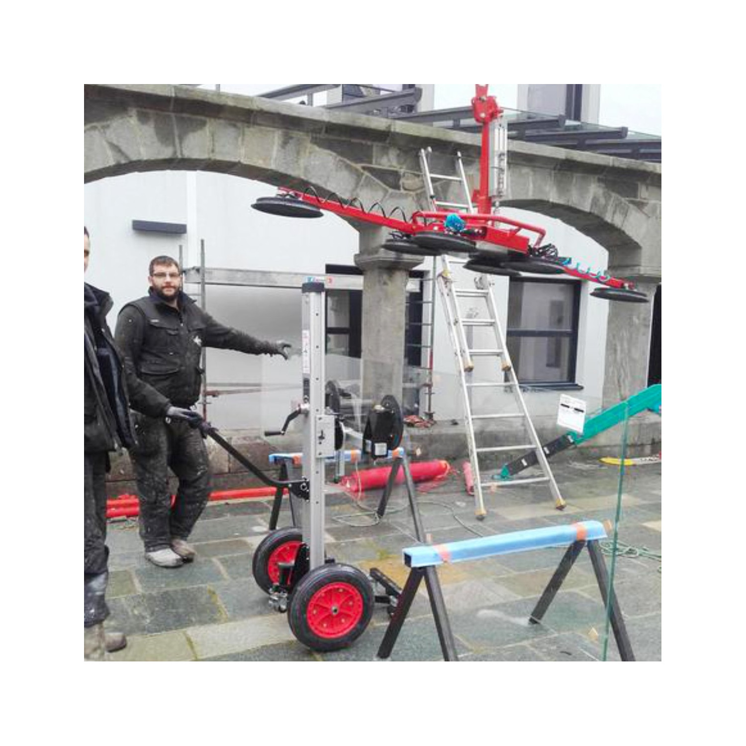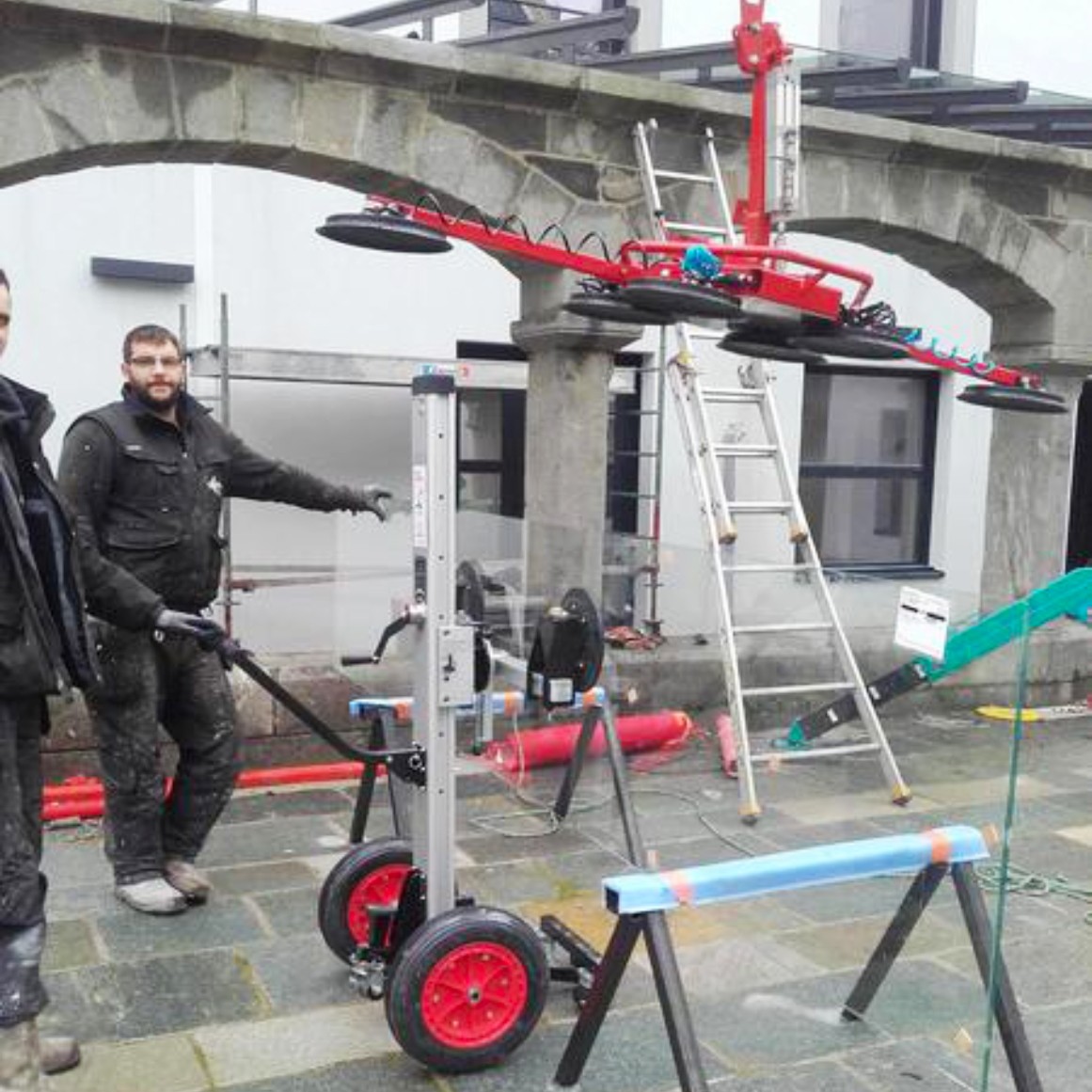 - Große Vakuumsauger für sicheren Halt von schweren Glasscheiben
