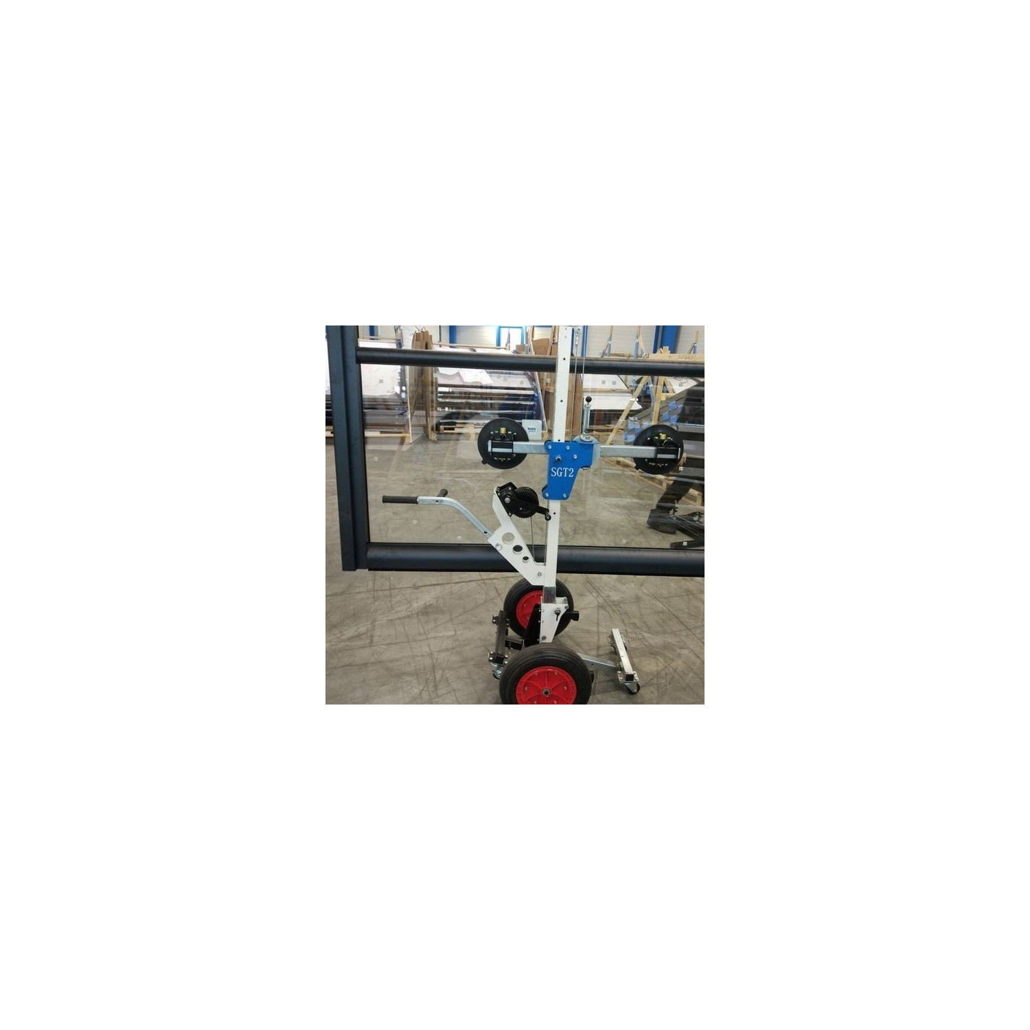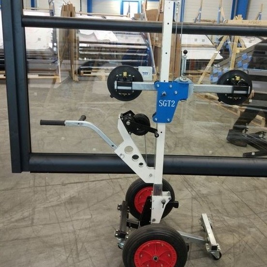Der Glaslift SGT2 ist ein Hilfmittel zum Be- und Entladen und dem Transport von Glas. Der drehbare Saugnapf-Halter erlaubt es Glasscheiben bis 2.800 mm Größe um 360° zu drehen. Zusätzlich kann der Mast um 90° geschwenkt werden. So können Glasscheiben auch in Längsrichtung transportiert werden. Damit passt der SGT2 mit Glasscheibe durch 800 mm schmale Türen. Der Glastransporter ist perfekt für den Transport bzw. zum Montieren von Glas / Türen für nur 1 Person.
