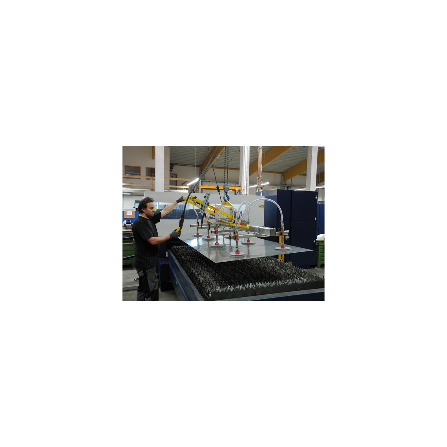 - Vakuumerzeuger T4.8-400V trockenlaufend, Verrohrung 3/4"-RSV1/2", 8 Einbau Saugplatten FSRL170-NBR-G mit Schlauchnippel SN-1/4-10, Vakuumansteuerung manuell über Handschiebeventil HSV-1/2-SK mit Sperrknopf, Vakuumfilter VF-1/2, Verteilerleitung VTL80-1100, 6 Absperrhähne KV-2/2-1/4"
