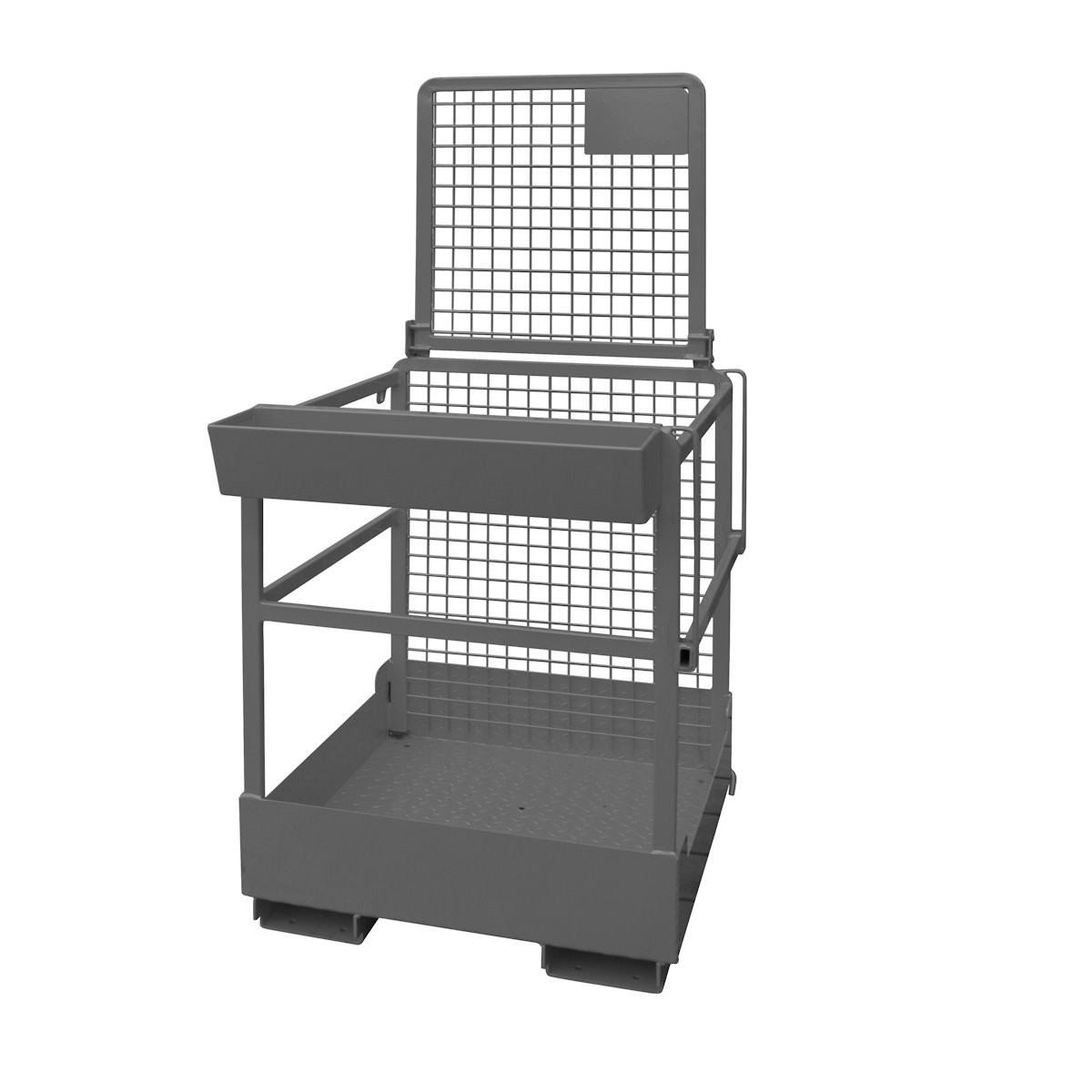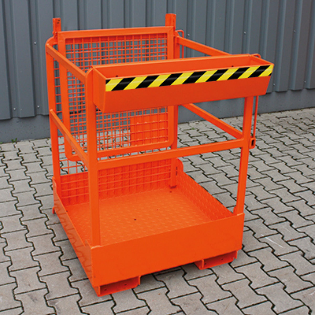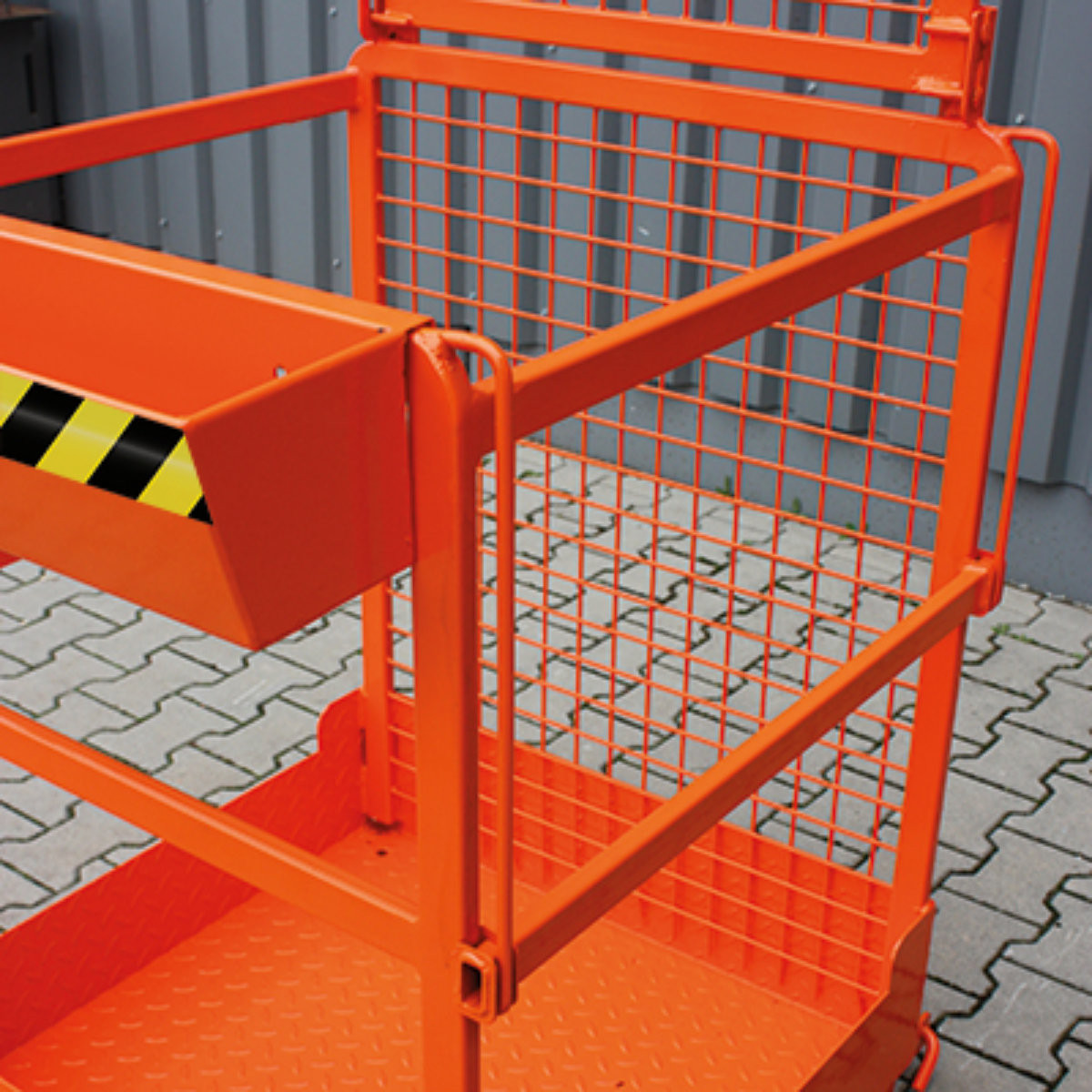 Der Arbeitskorb für 1 Person und Werkezeug ist aus einer robusten Rohrkonstruktion gefertigt. Die Rückwand besteht aus Drahtgitter, die Seitenwände und Front verfügen über eine massive Absturzsicherung aus Rohr. Für den Einstieg in den Arbeitskorb kann eine mittlere Strebe verschoben werden. Die Arbeitsplattform ist rutschsicher konstruiert und für die Sicherung am Stapler wird eine Steckbolzensicherung eingesetzt.