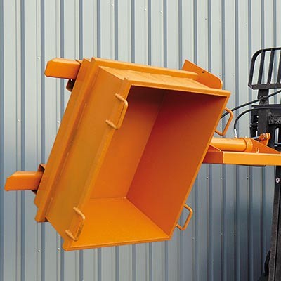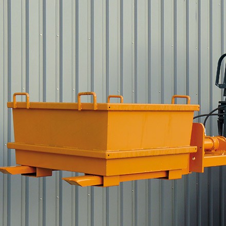 Der hydraulische Behälterkipper ist für Behälter mit Staplerschuhen. Für Gabelstapler, die mit einem dritten Steuerelement ausgestattet sind und damit das hydraulische Drehen steuern. So kann vom Staplerführer direkt vollständig oder teilweise das Streugut aus dem Behälter nach links entleert werden.