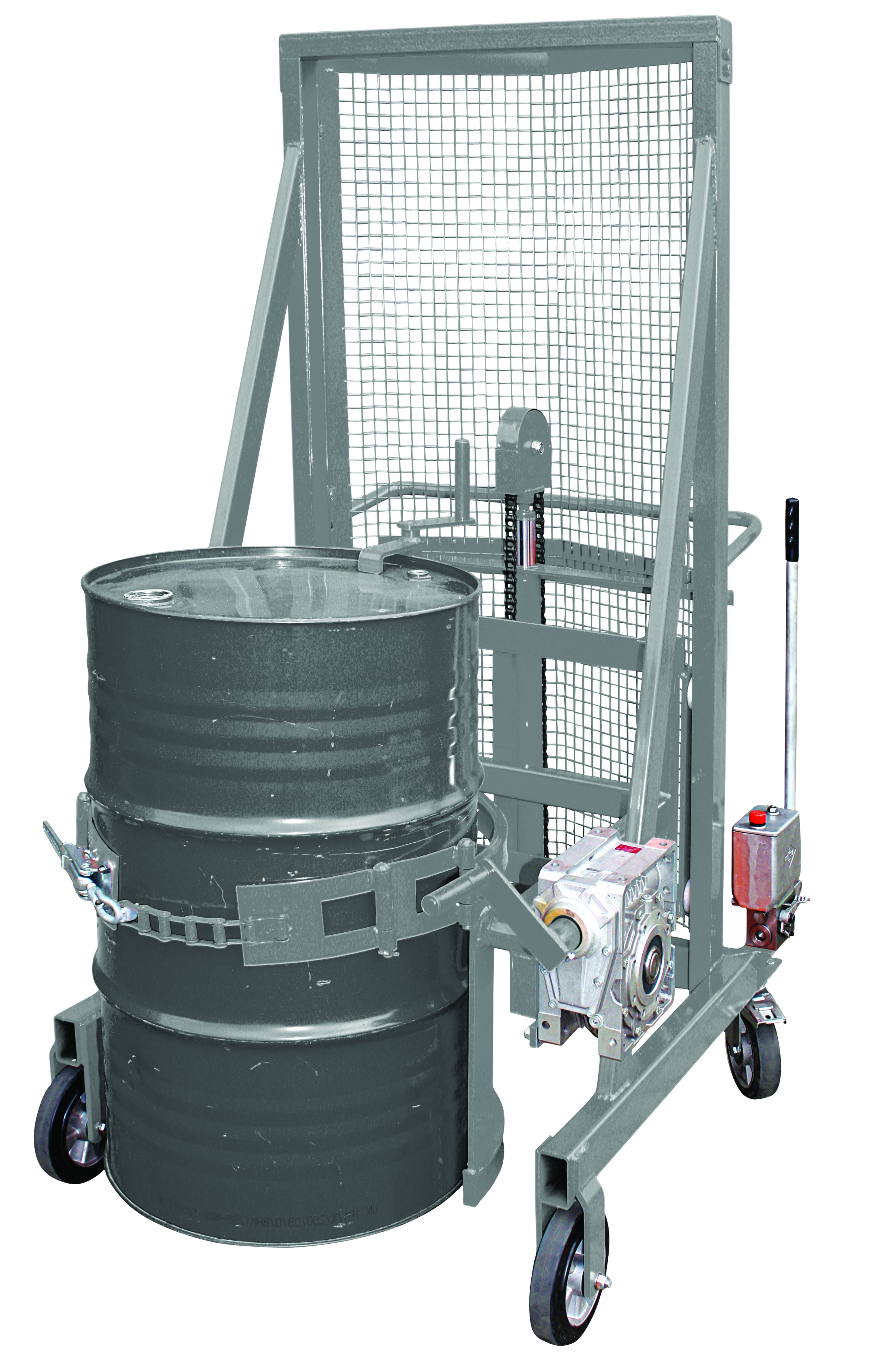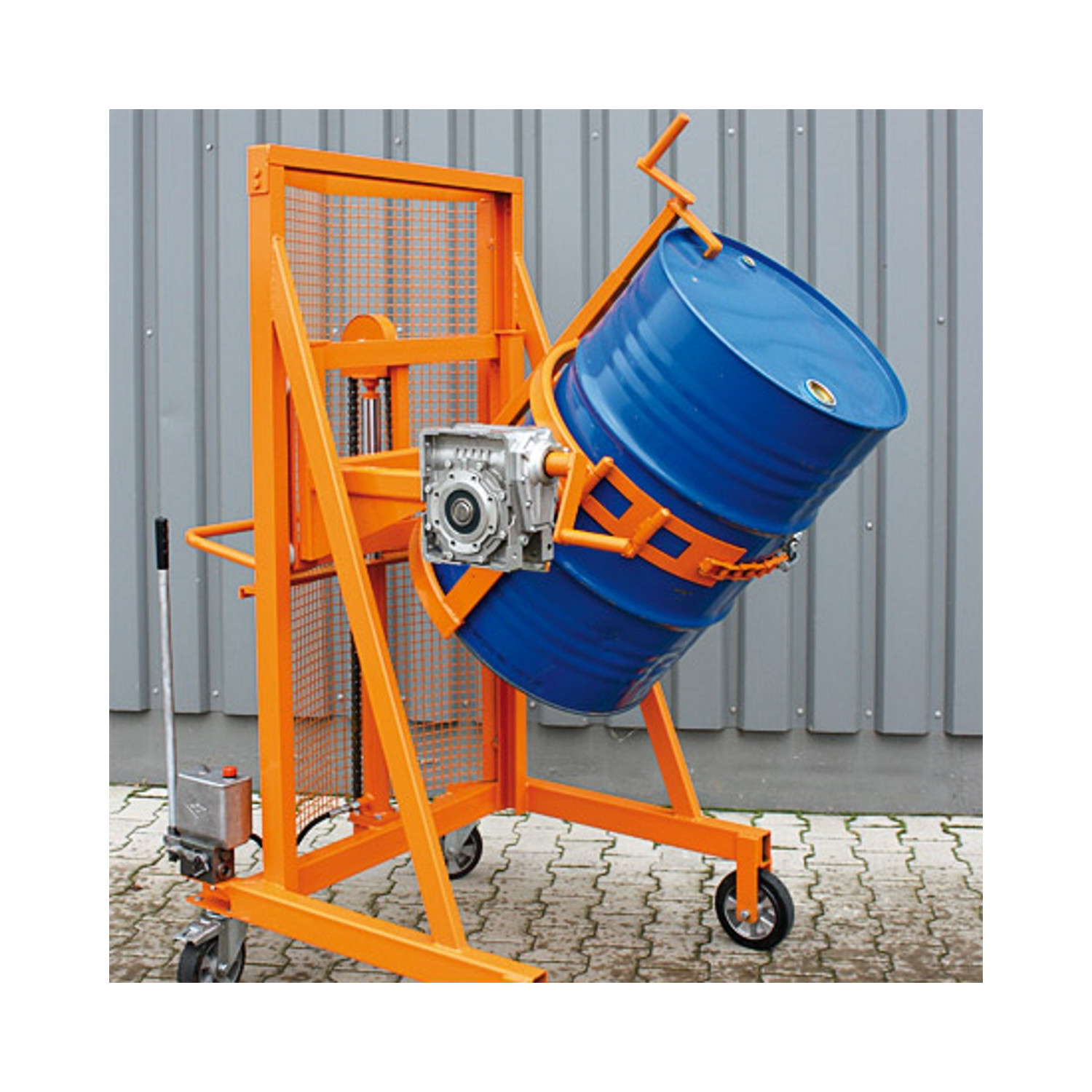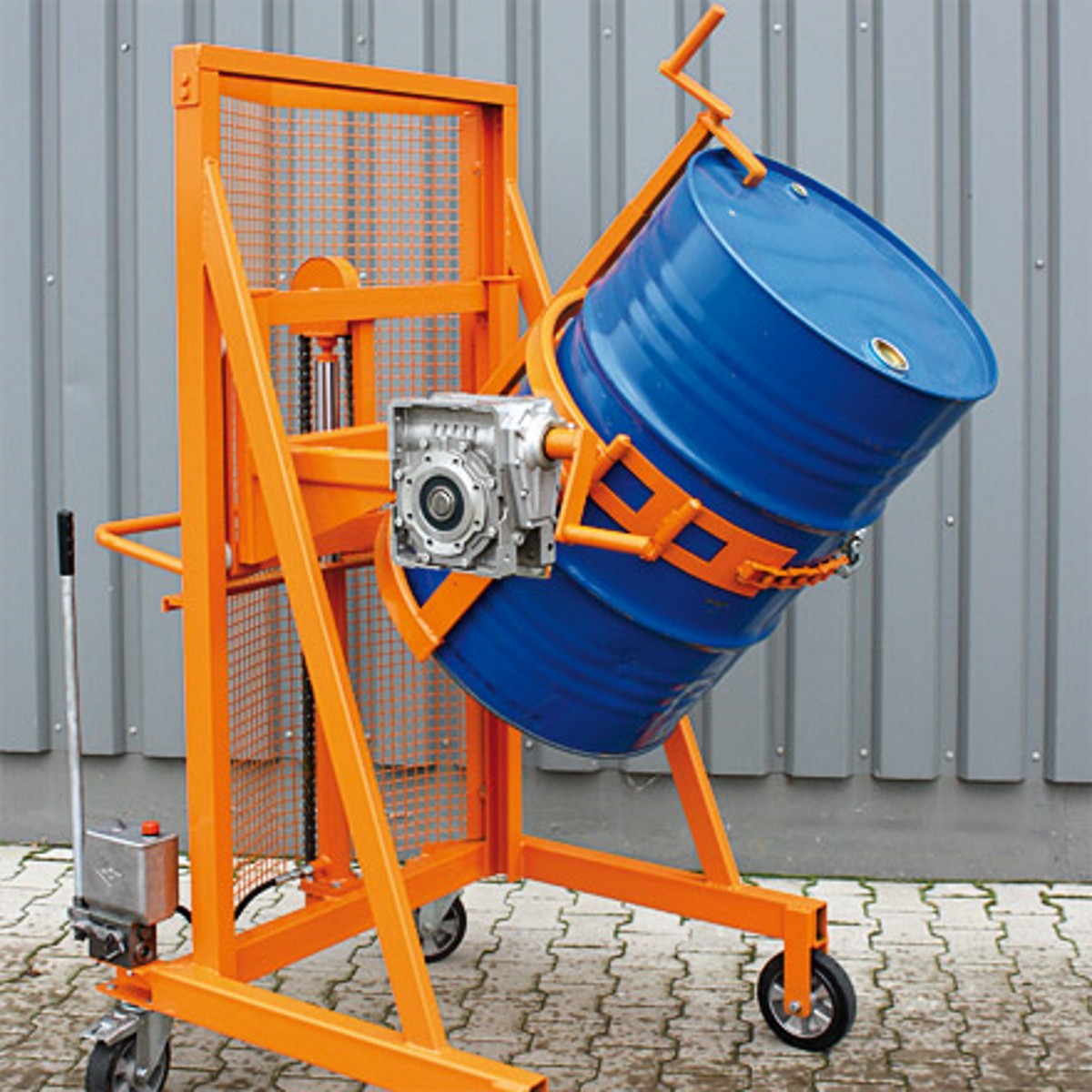 - Das Abkippen der Fässer erfolgt standardmäßig über eine Handkurbel