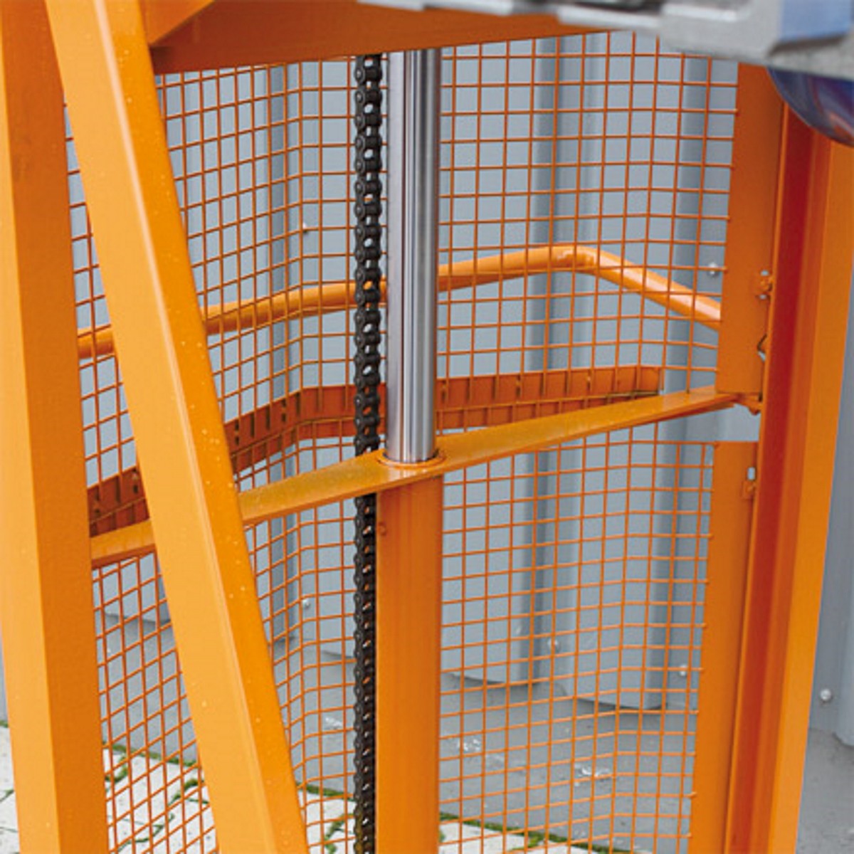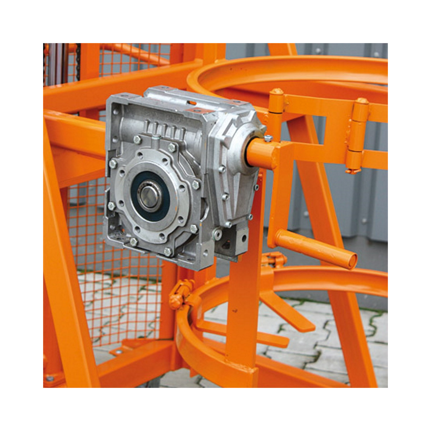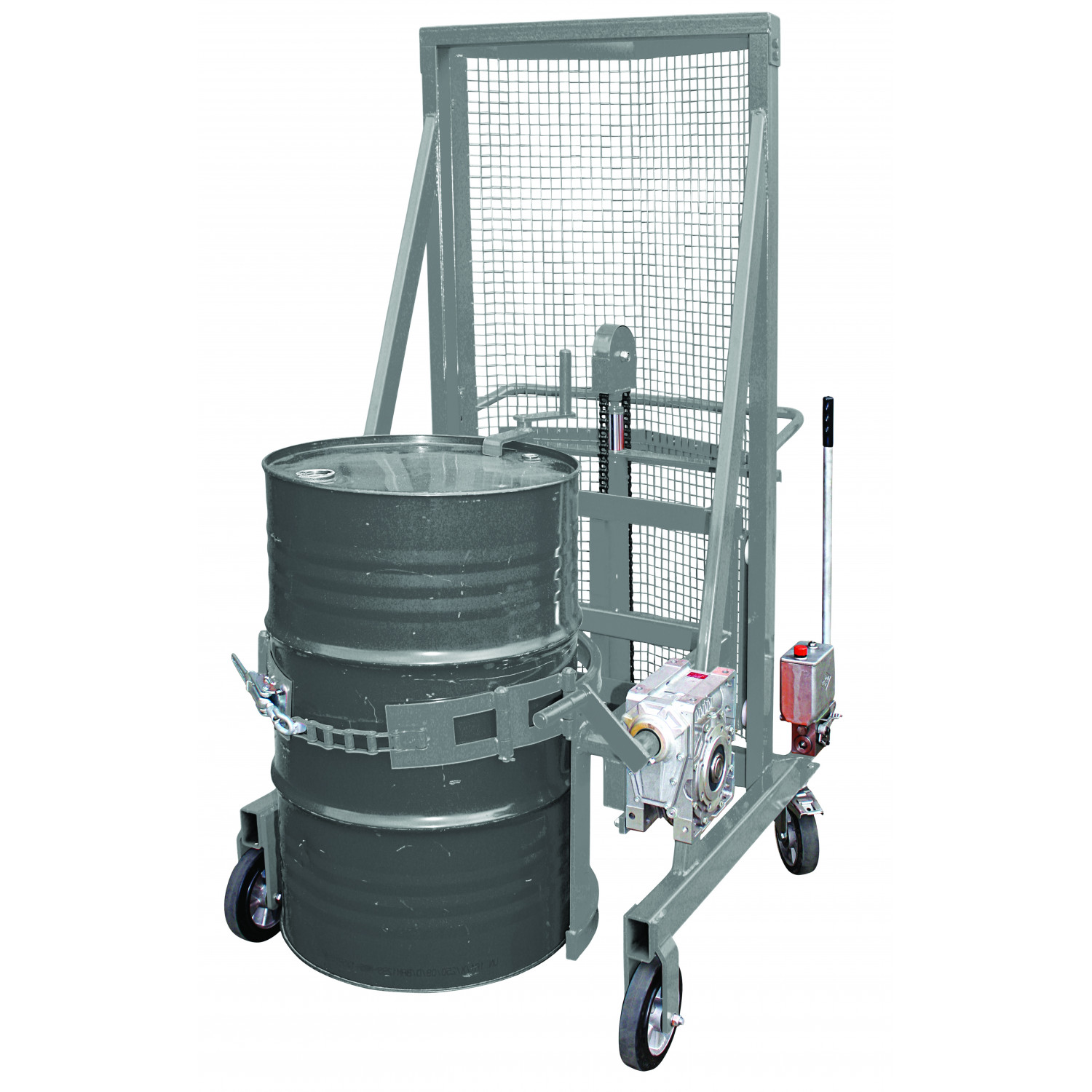 - Das Abkippen der Fässer erfolgt standardmäßig über eine Handkurbel