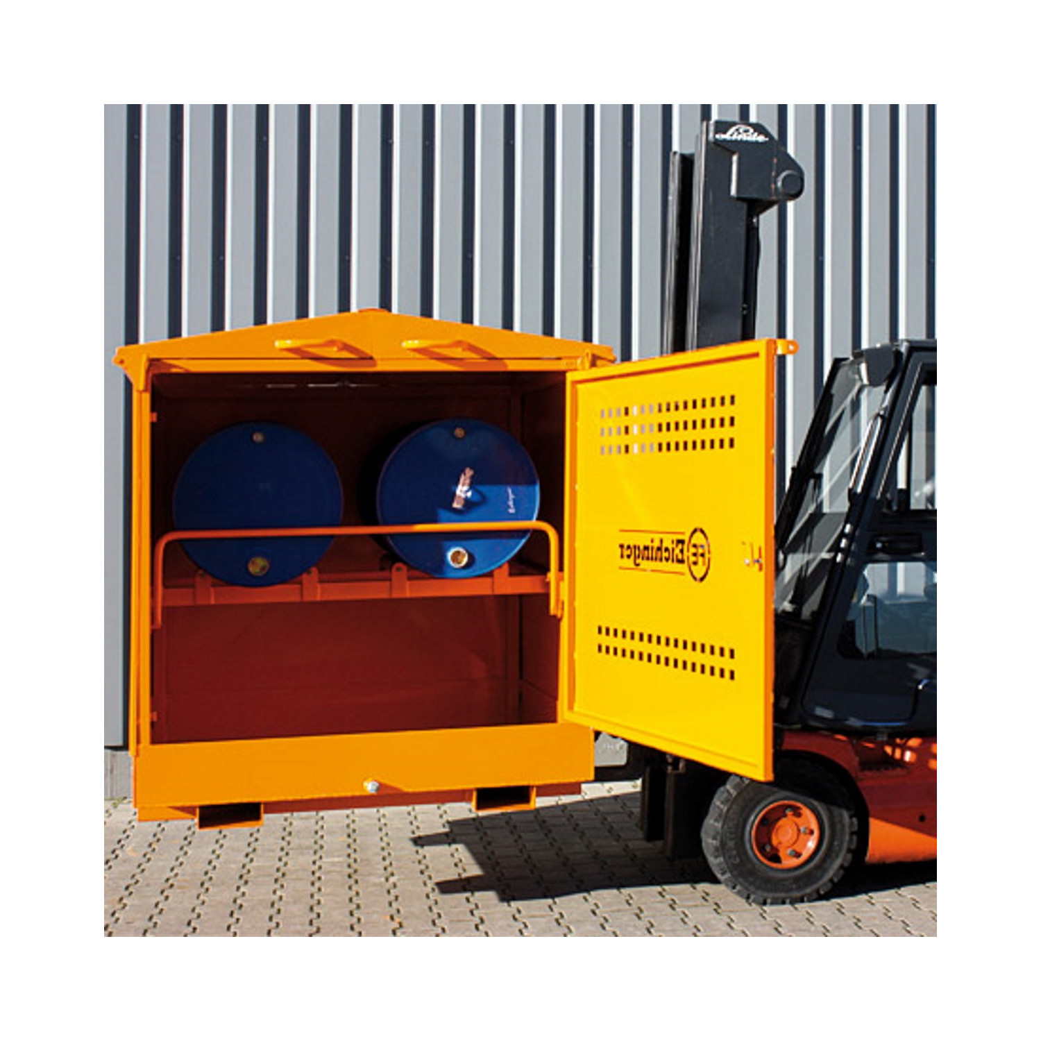 Das Umweltschutzdepot wird zur Lagerung von Gefahrstoffen im Außenbereich eingesetzt. Durch die integrierten Einfahrtaschen und den vier Kranösen kann das Umweltschutzdepot flexibel mit Kran und Gabelstapler transportiert werden.