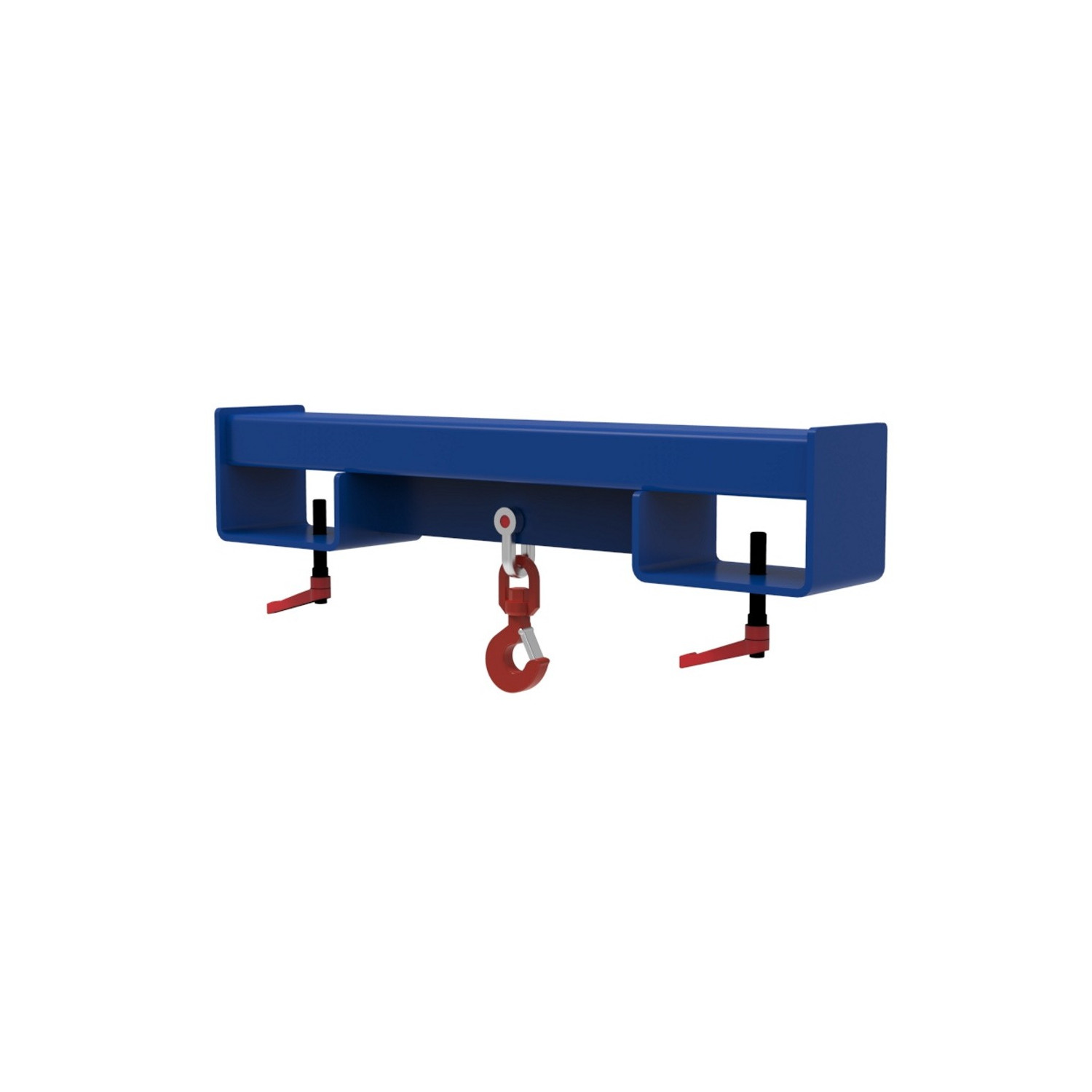 - Die Traverse ist für 2 Staplerzinken ausgelegt und mit einem Schäkel und einem Wirbellasthaken ausgestattet, um verschiedene Anschlagmöglichkeiten zu bieten