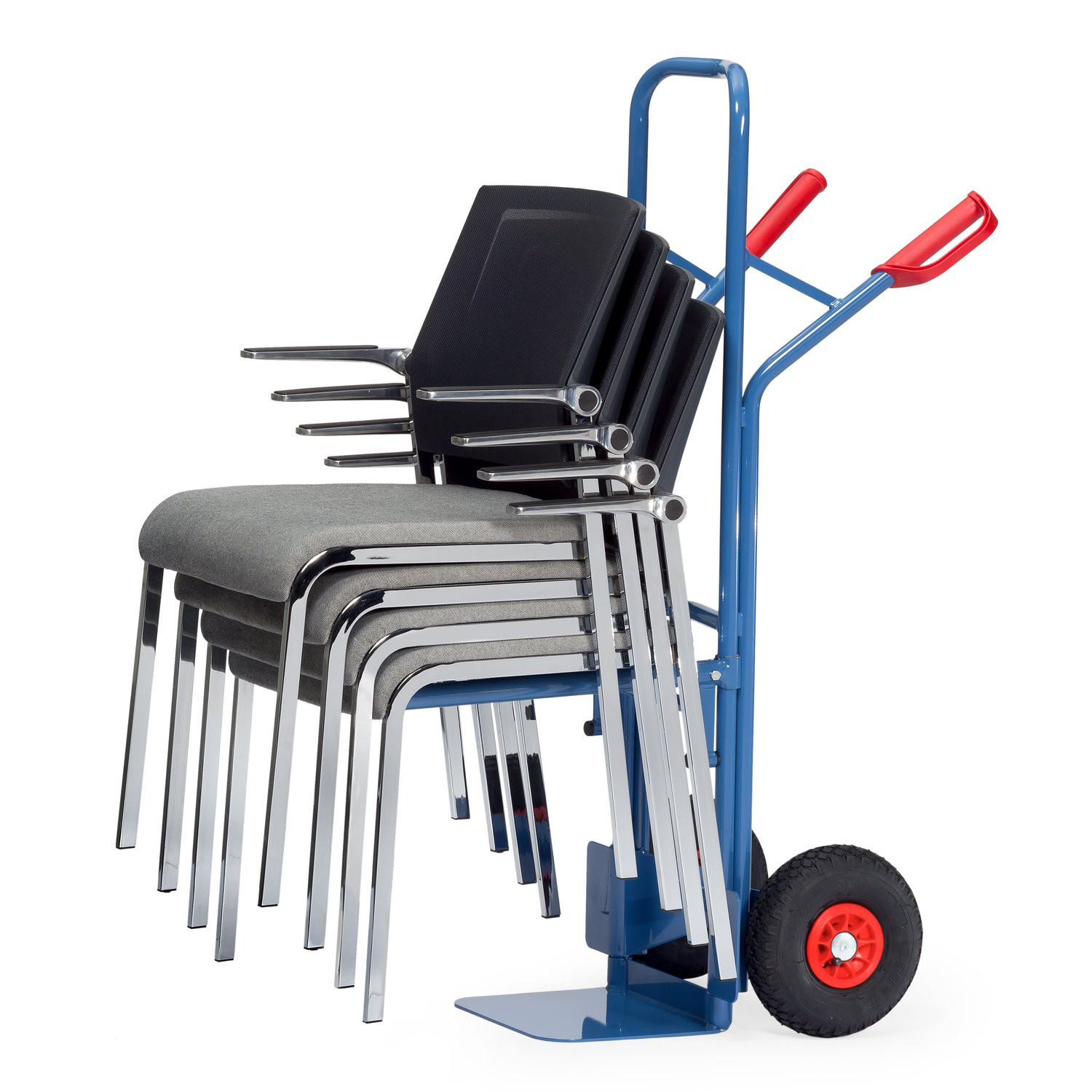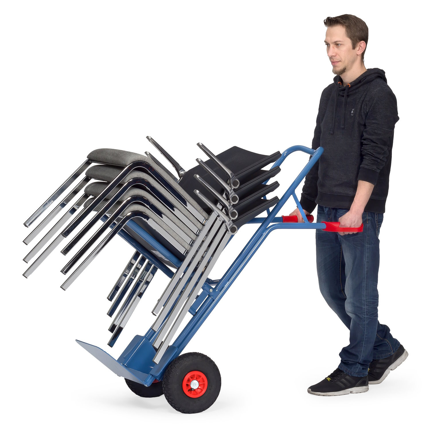 - Mit der Stuhlkarre lassen sich schnell und einfach gestapelte Stühle transportieren