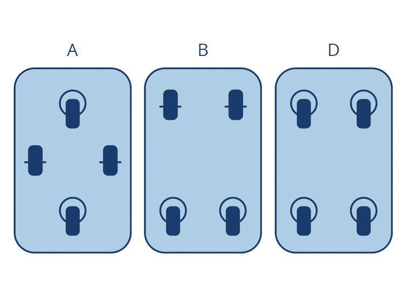 | Rollen | Siehe Abb. | 4 Lenkrollen,davon 2 mit Radfeststellern | 2 Lenkrollen mit Radfeststellern und 2 Bockrollen | 4 Lenkrollen,davon 2 mit Radfeststellern | 2 Lenkrollen mit Radfeststellern und 2 Bockrollen | 2 Lenkrollen und 2 Bockrollen, rautenförmig angeordnet |