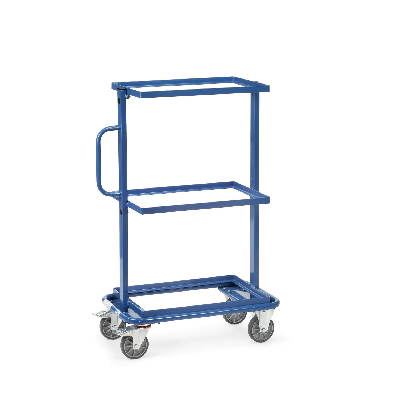Jede obere und mittlere Ladefläche kann bis zu 50 kg tragen, was den Wagen ideal für den Transport schwerer Lasten macht. Die Pulverbeschichtung in Blau RAL 5007 schützt den Wagen vor Kratzern und verleiht ihm eine ansprechende Optik.