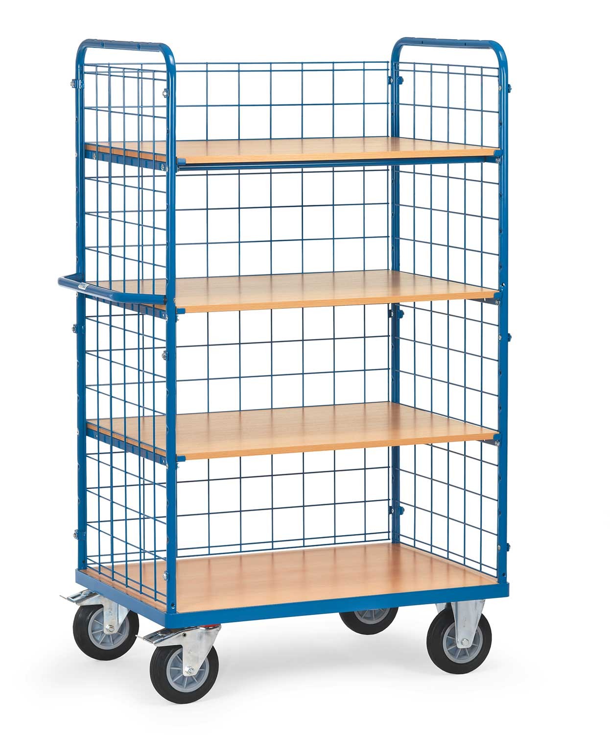 Der Etagenwagen ist mit 2 Lenk- und 2 Bockrollen ausgestattet, die eine TPE-Bereifung und Naben mit Rillenkugellager haben. Dadurch wird ein reibungsloser und leichtgängiger Transport gewährleistet. Die Lenkrollen sind mit Feststellern gemäß EN 1757-3 versehen, um einen sicheren Stand des Wagens zu gewährleisten.