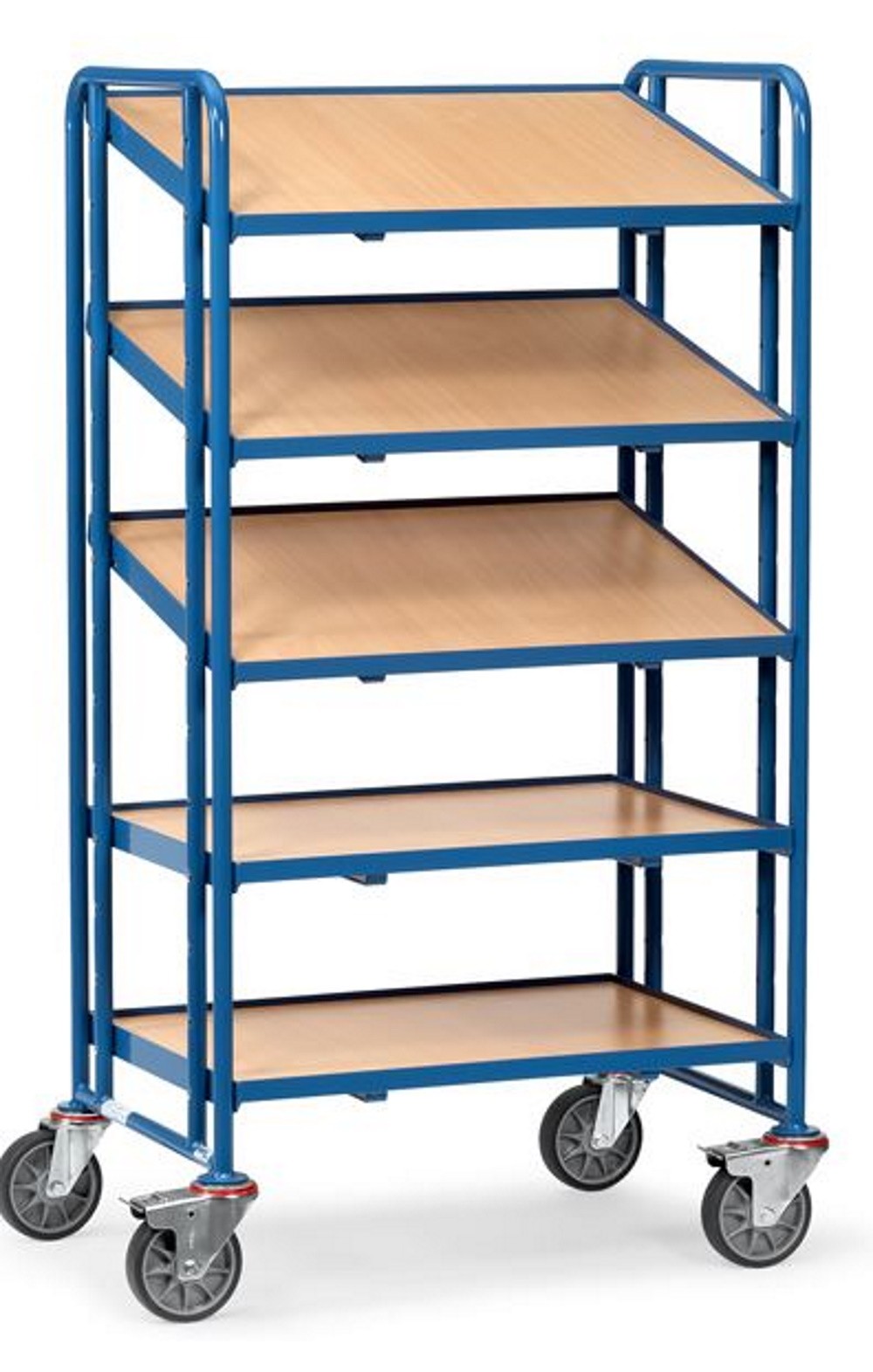 Dank der variabel einschraubbaren Etagen können Sie den Wagen ganz nach Ihren Bedürfnissen gestalten und die Anordnung der Ebenen individuell anpassen. Die Neigungsoptionen von 15° oder 30° erleichtern das Be- und Entladen, sodass Sie Ihre Waren mühelos ein- und auslagern können.