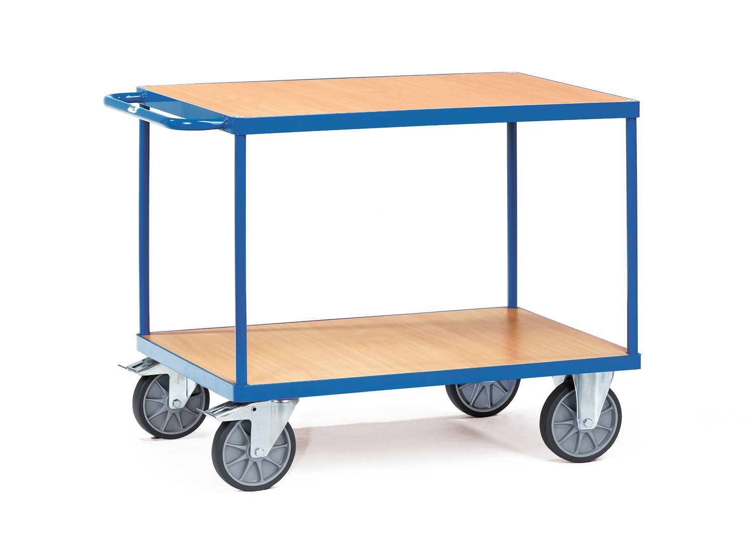 Mit dem Tischwagen lassen sich Waren einfach und schnell transportieren. Der Rohrschiebebügel ermöglicht zudem ein einfaches Handling des Wagens. Durch die bündige Ladefläche lassen sich schwere Lasten einfach auf den Wagen ziehen, auch können diese einfach über den Rand hinausstehen. Der Tischwagen ist mit 2 Lenkrollen und 2 Bockrollen ausgestattet. Die Lenkrollen lassen sich durch Feststeller fixieren. Dies ermöglicht ein einfaches Be- und Entladen.
