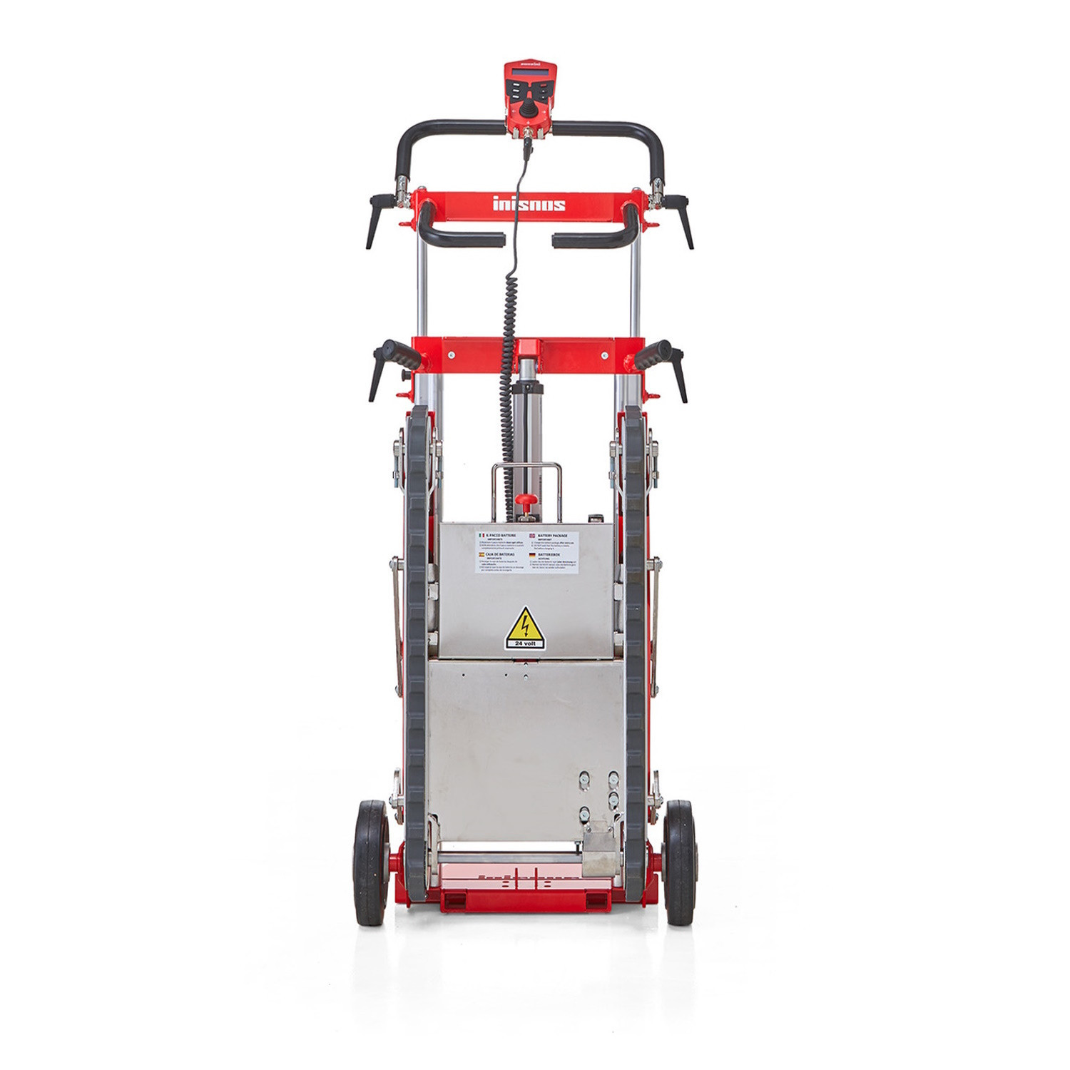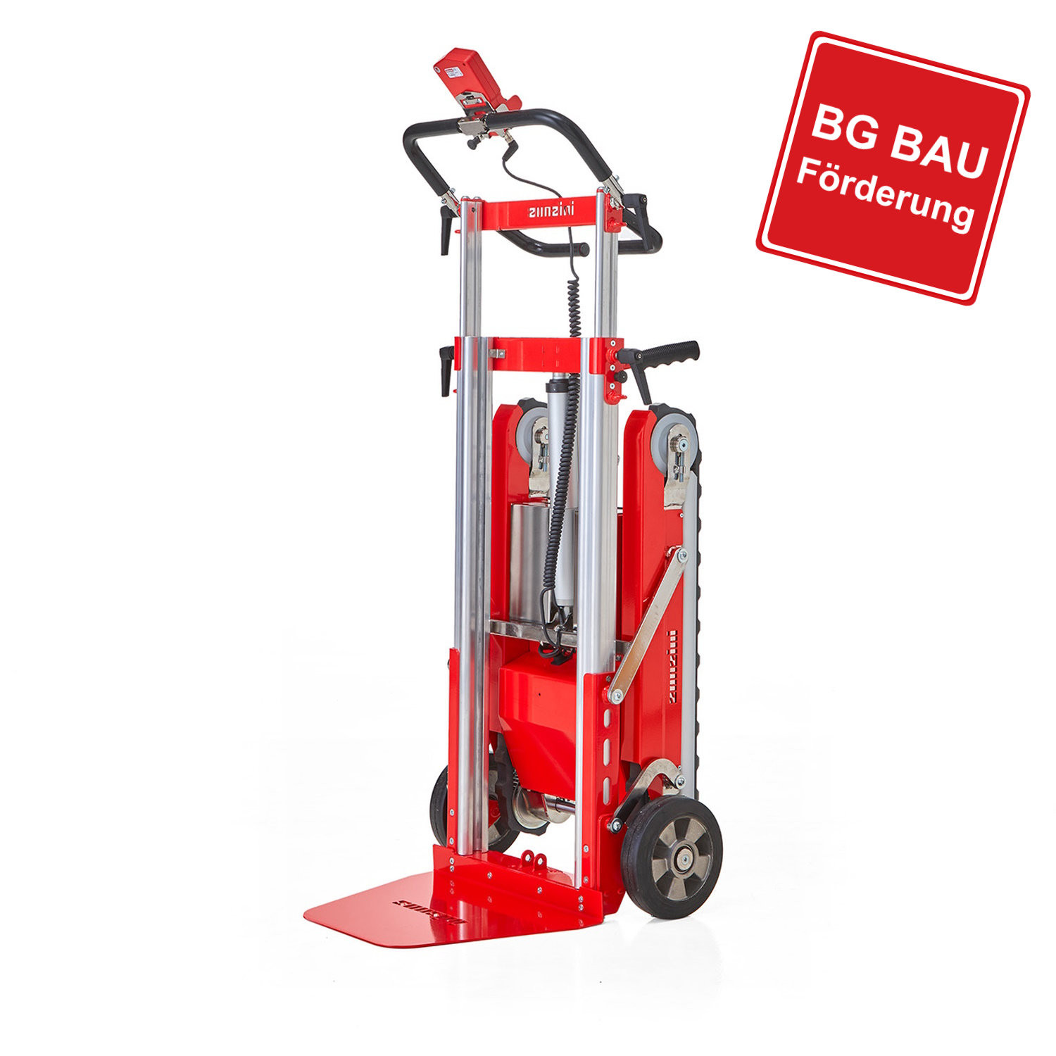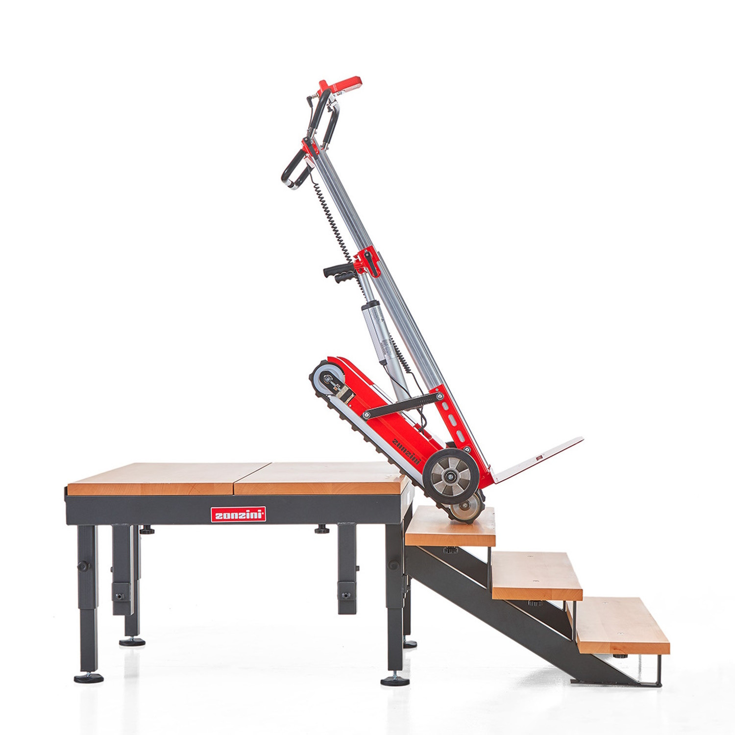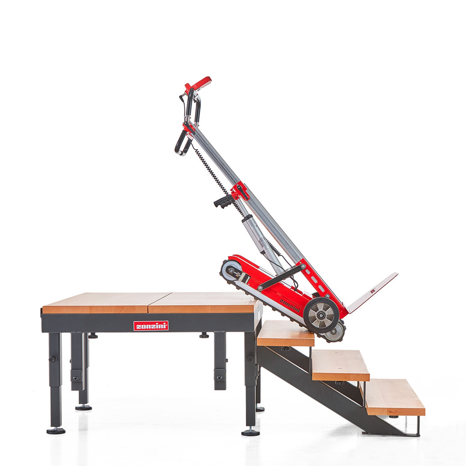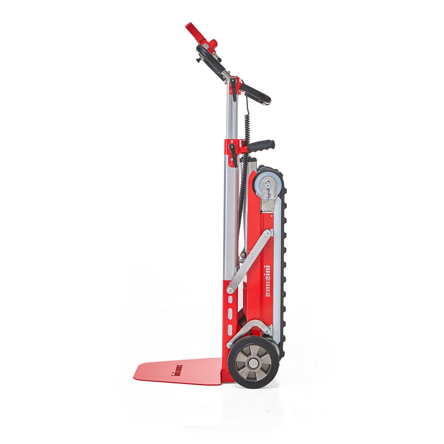 Geschlossene Raupenketten sorgen für das Aufsetzen der Räder auf dem boden, dadurch kann auf schmalen Stufen oder engen Wendeltreppen das Gerät samt Last gedreht werden.